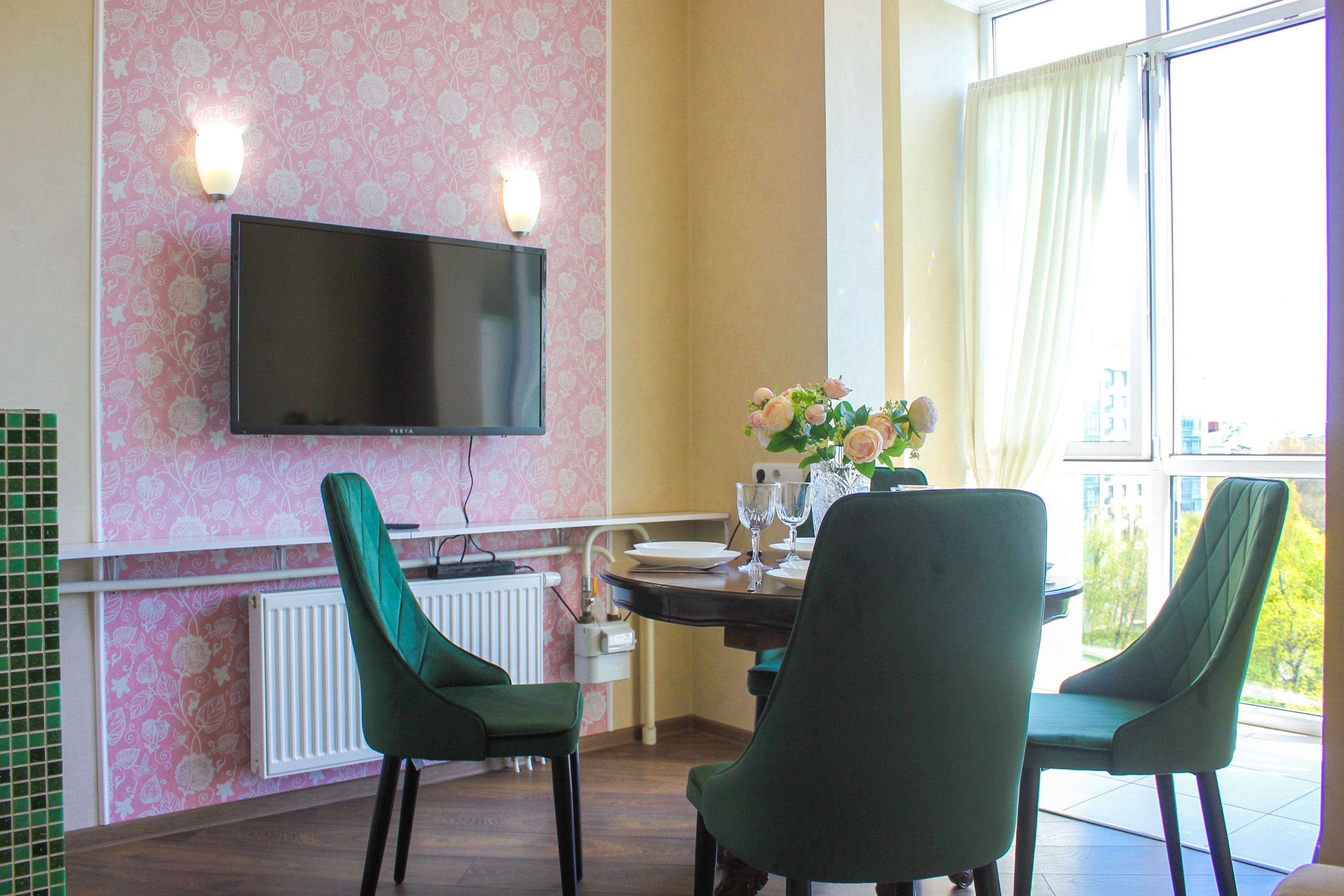 Кухня-гостиная: раскладной диван 180х200, ТВ с функцией Smart, обеденная зона. Кухня оборудована всей необходимой утварью и посудой.