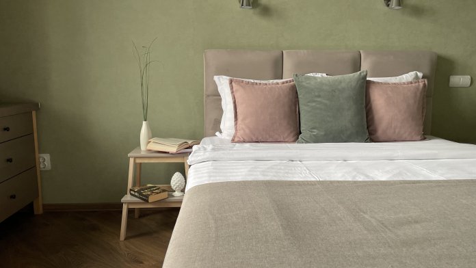 Спальня 1: двуспальная кровать 160х200, прикроватные столики, рабочий стол и стул, библиотека.