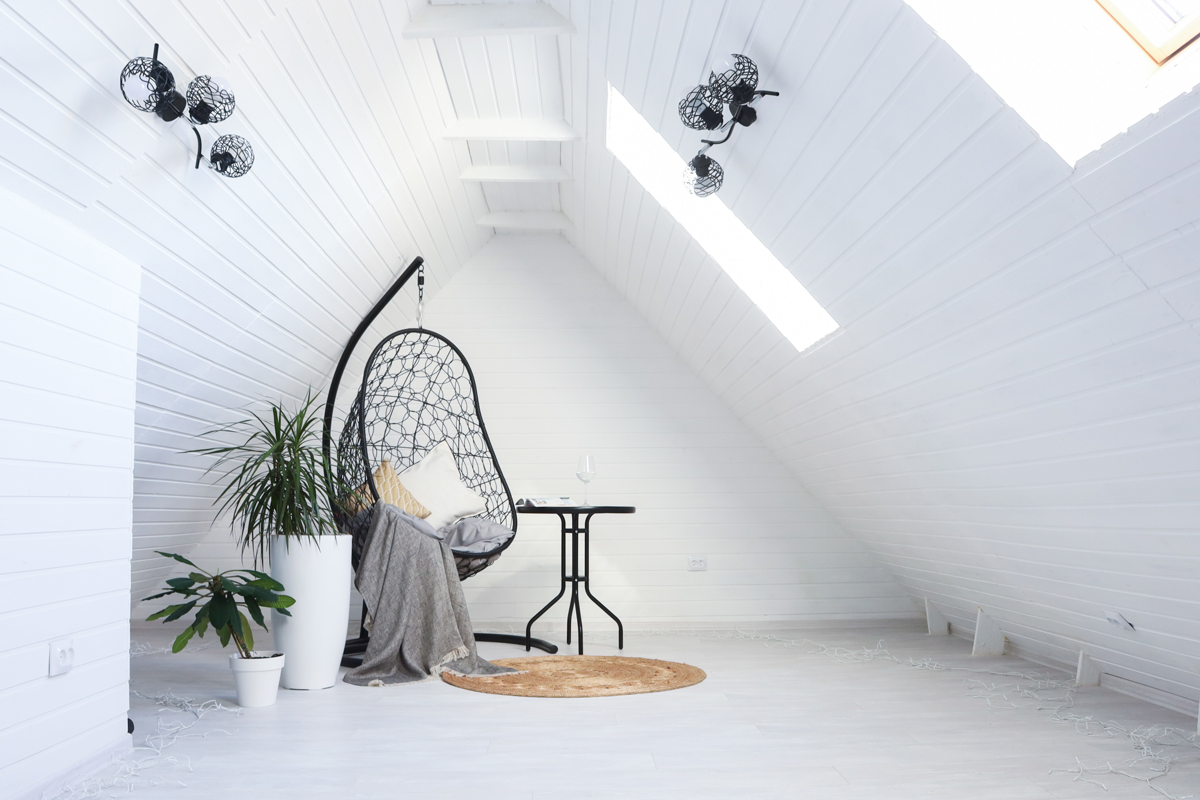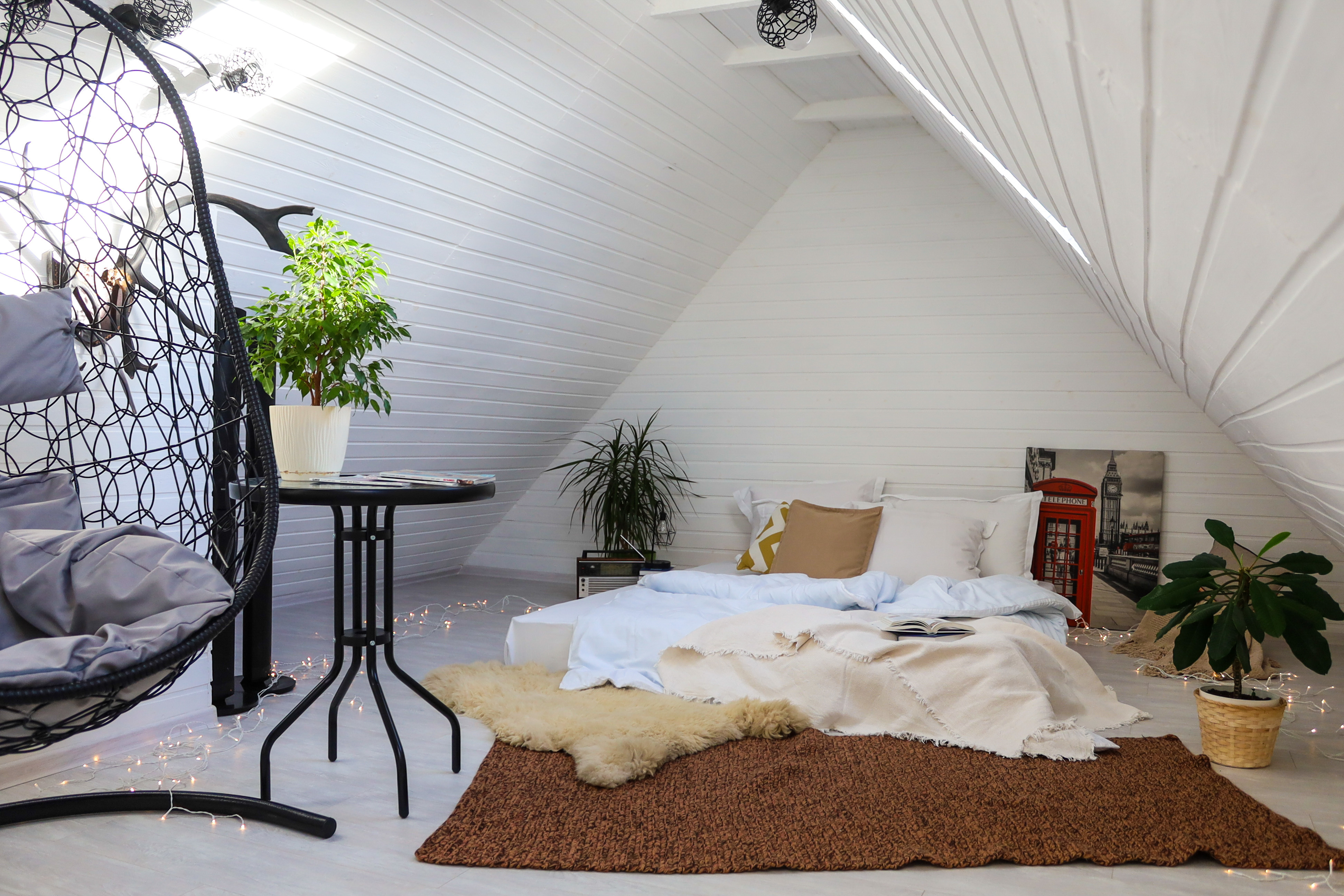 Спальня 2: двуспальная кровать 160х200, лаундж-зона с подвесным креслом-качелью и журнальным столиком.