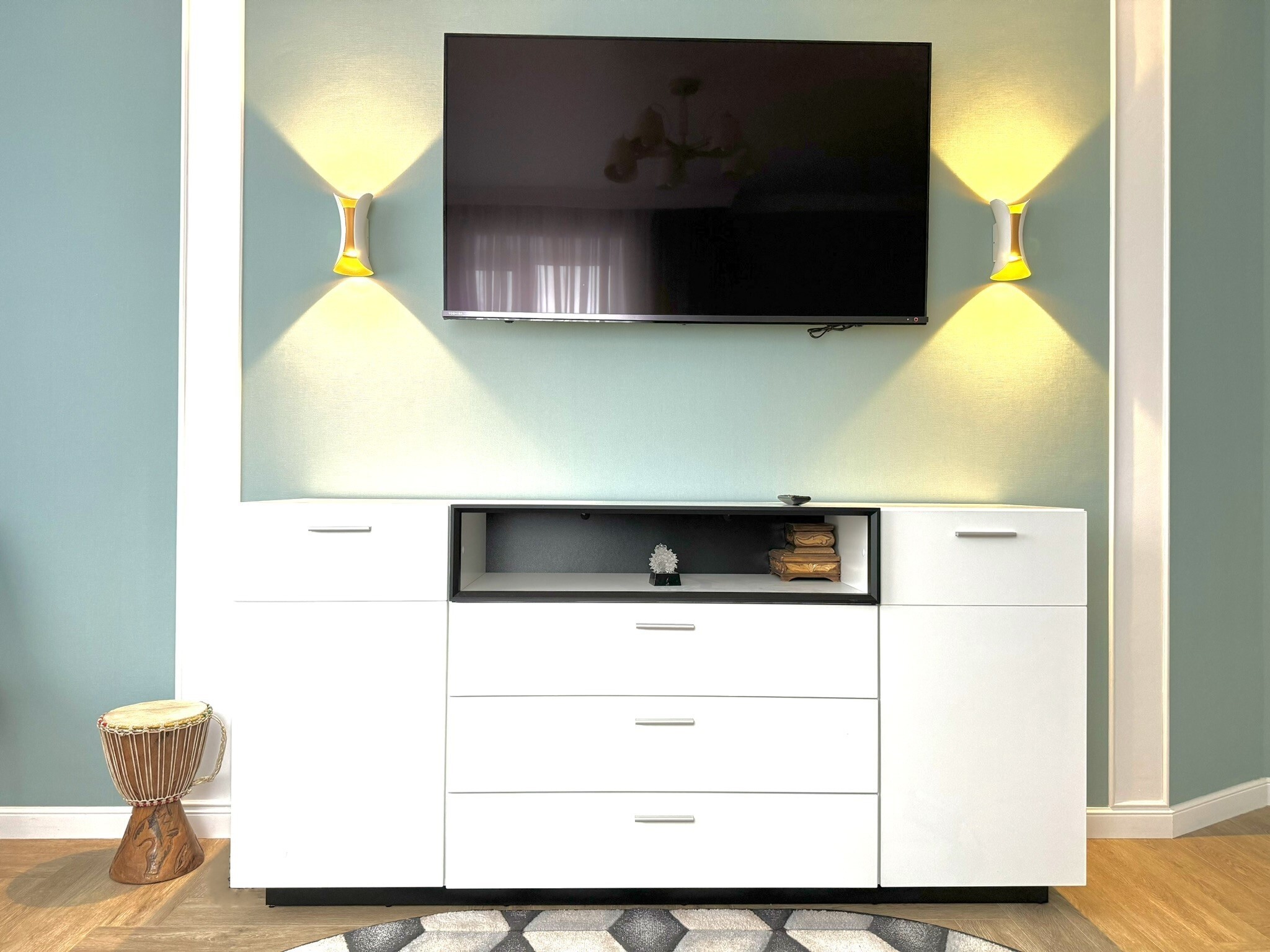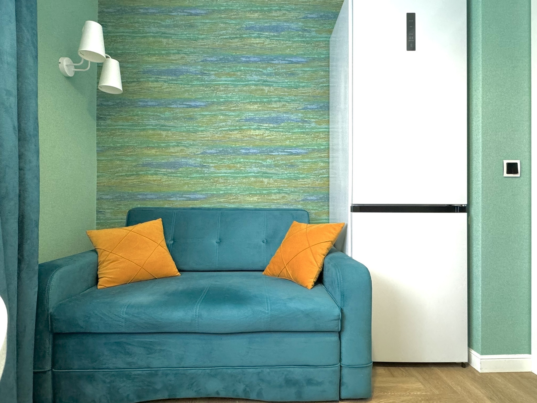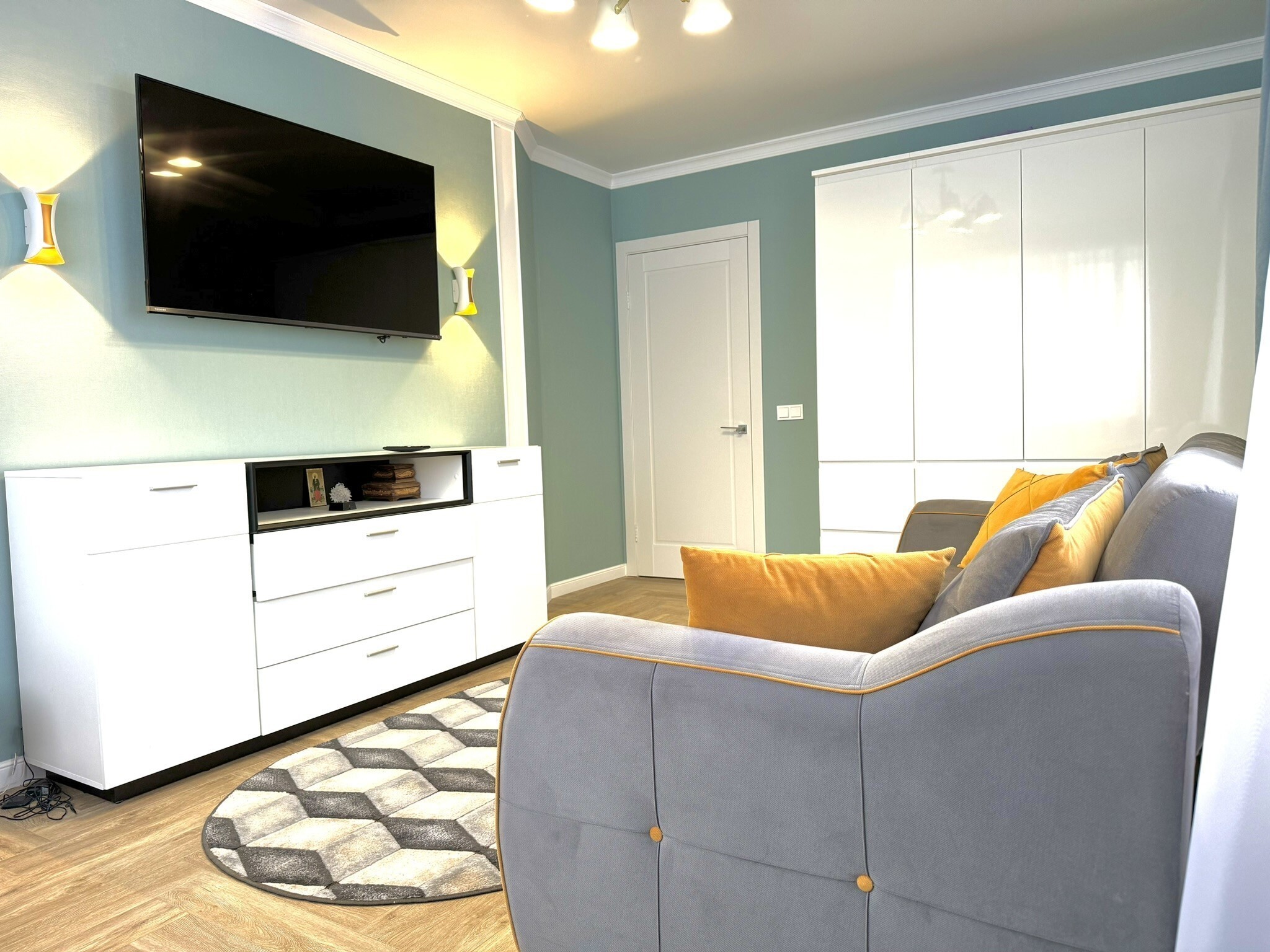В гостиной раскладной диван, большой ТВ с функцией Smart, просторный шкаф и комод для хранения вещей. Wi-fi на всей территории.
