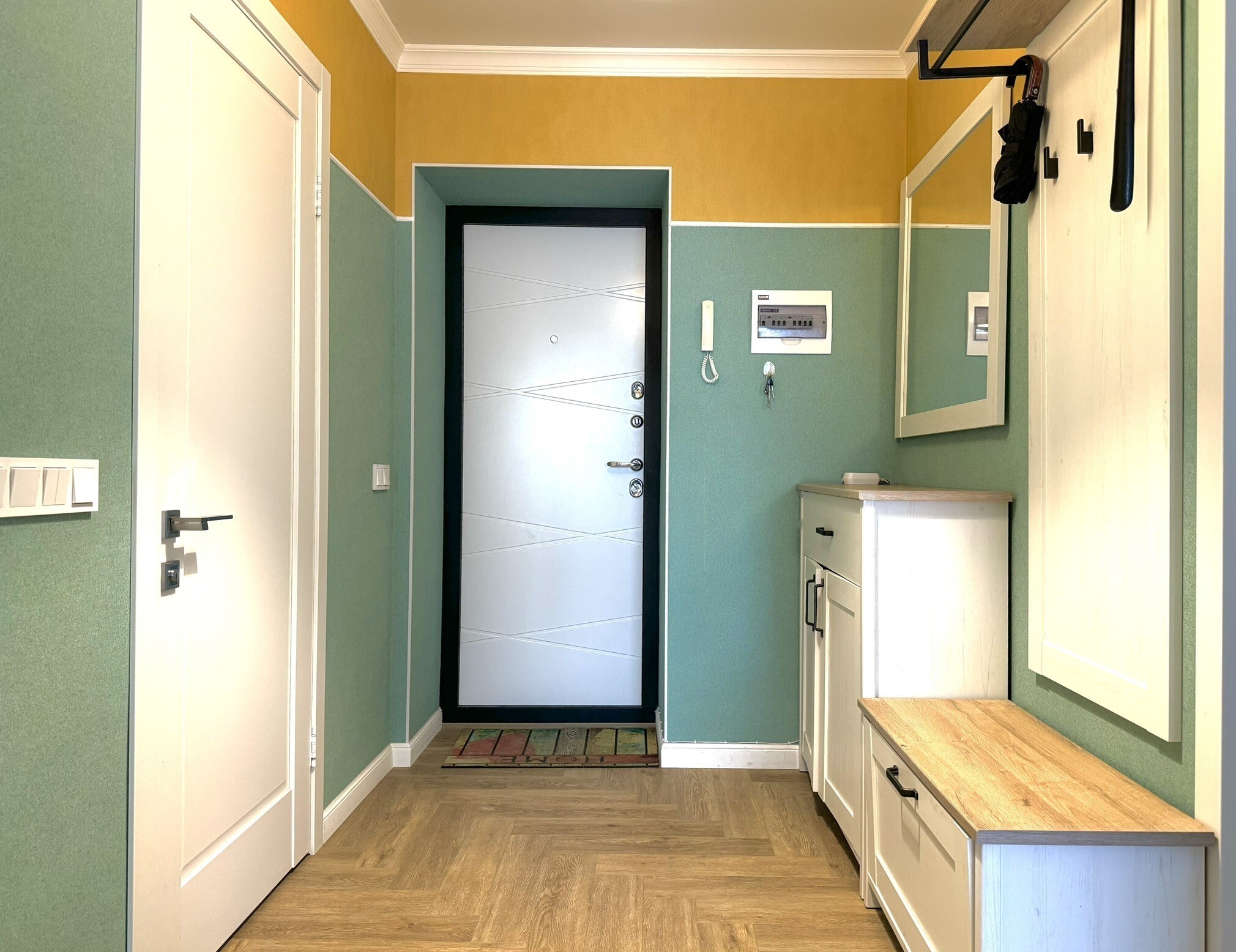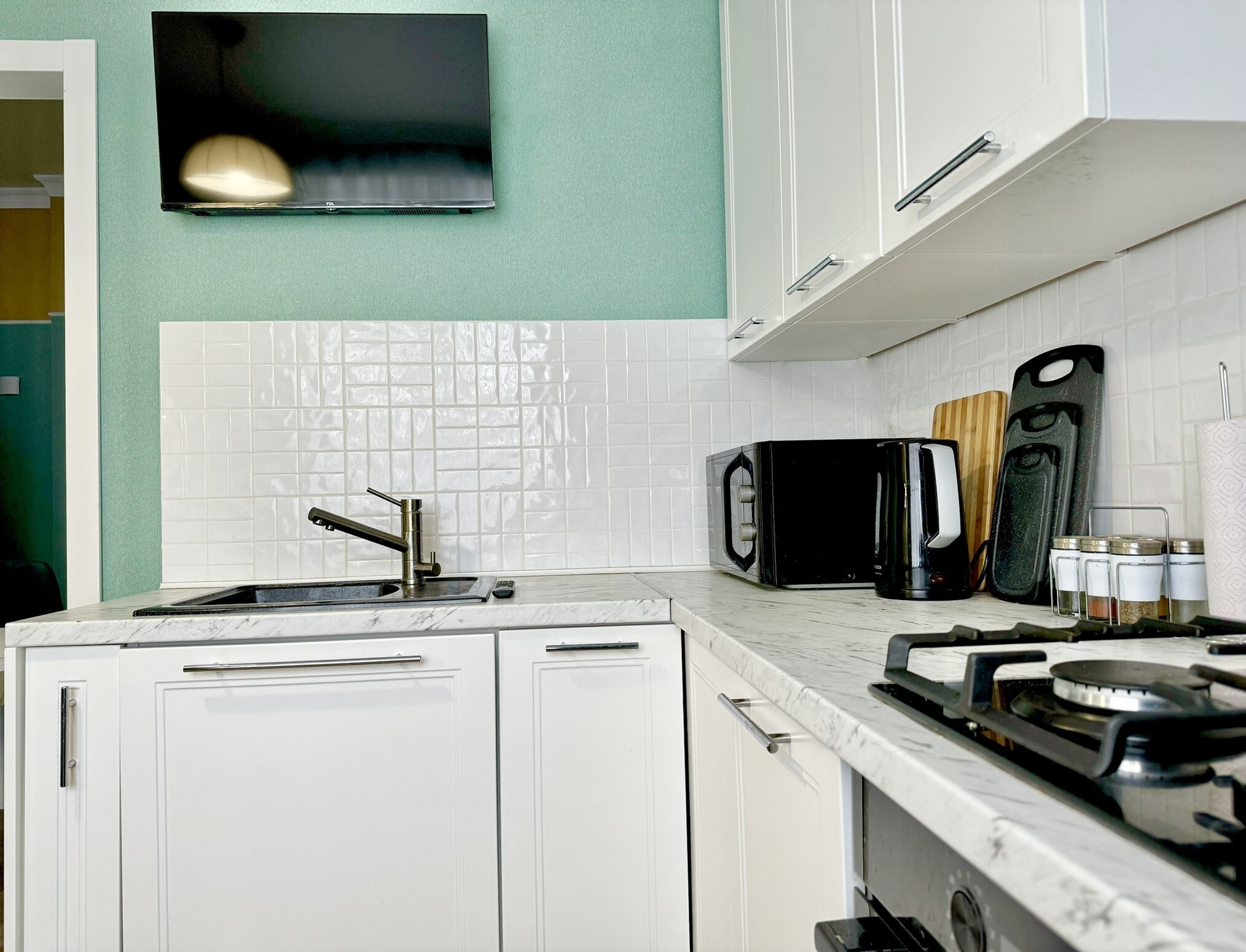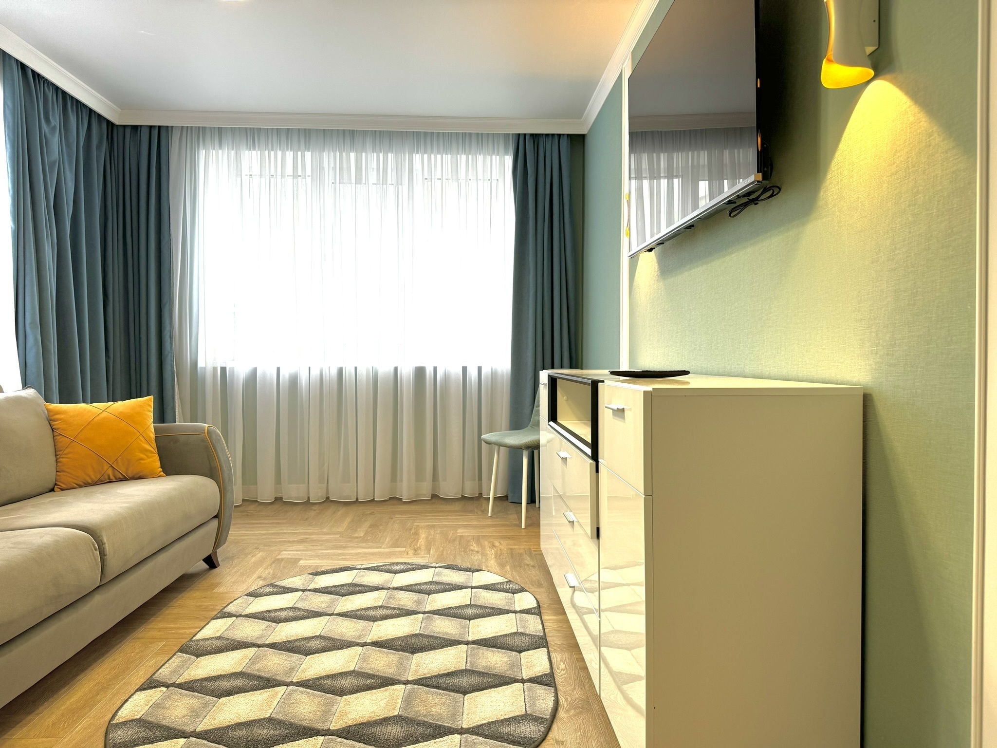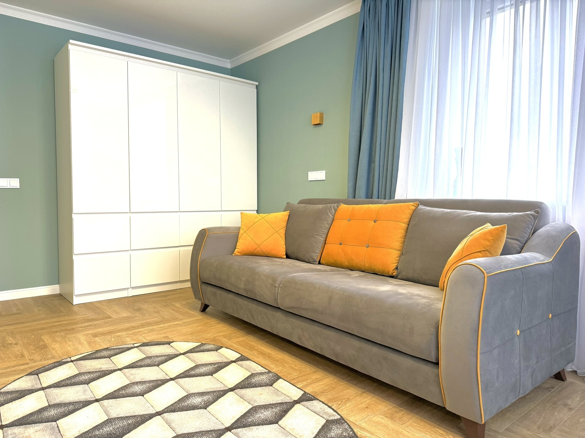 В гостиной раскладной диван, большой ТВ с функцией Smart, просторный шкаф и комод для хранения вещей. Wi-fi на всей территории.