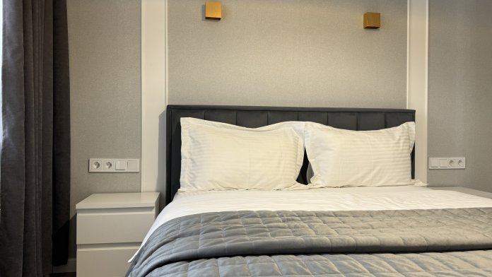 Спальня: двуспальная кровать 160х200, прикроватные столики, прикроватные светильники, выход на лоджию, окна лоджии выходят во двор.