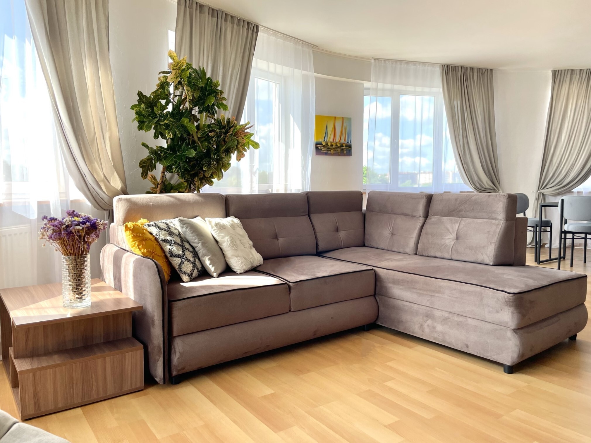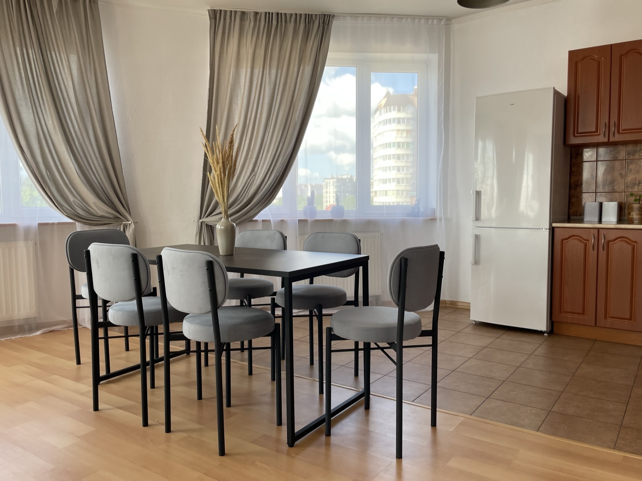 Просторная и светлая 3-комнатная квартира с кухней-гостиной в новом доме, расположена на высоком 2-м этаже, предназначена для комфортного размещения 2-6 взрослых. Для отдыха организованы 2 изолированные комфортабельные спальни.
