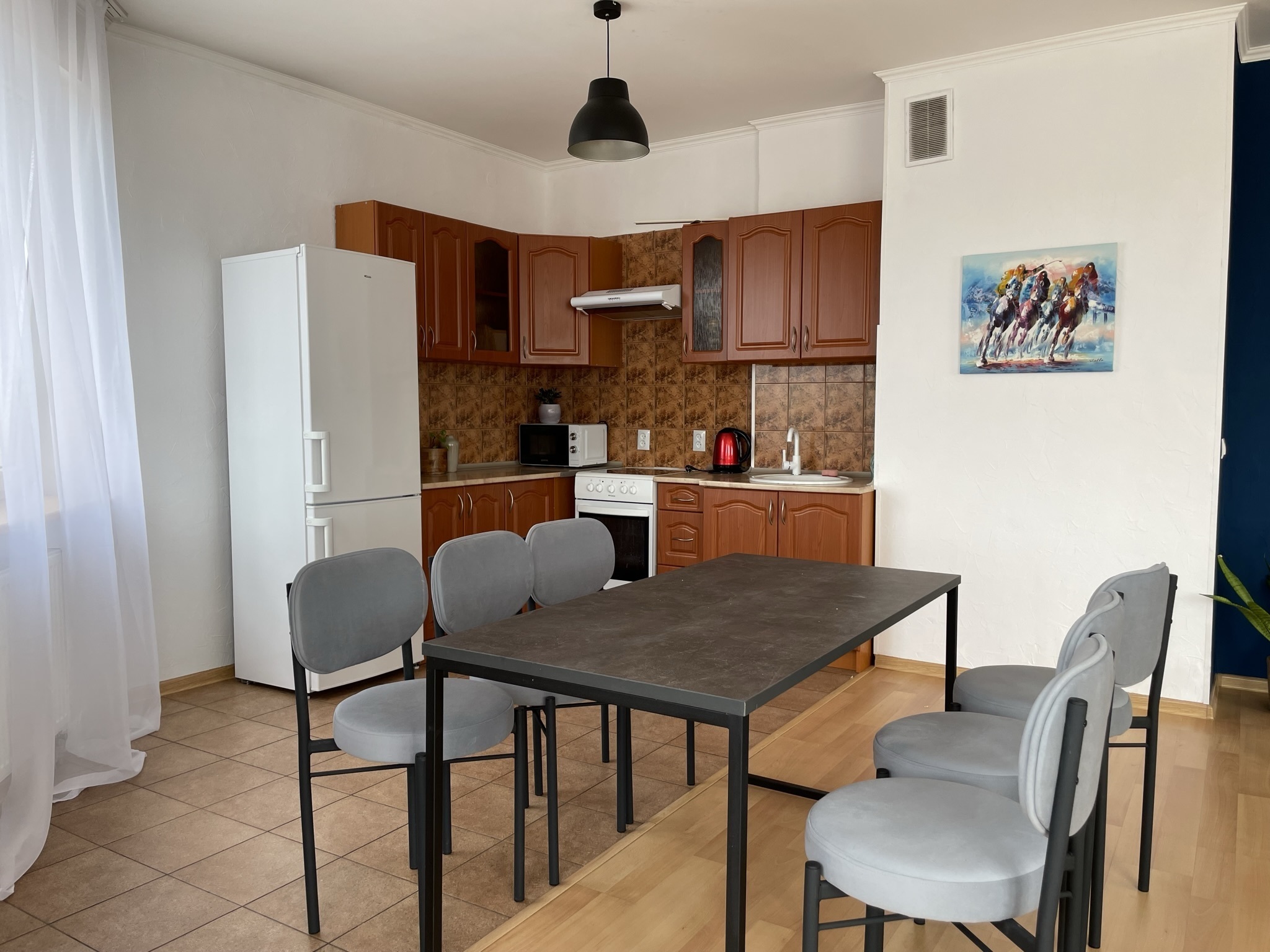 Кухня-гостиная: раскладной диван 160х200, ТВ, обеденная зона. Кухня оборудована всей необходимой утварью и посудой, вместительный холодильник и духовой шкаф. Wi-fi на всей территории.