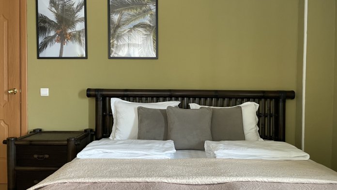 Спальня 1: двуспальная кровать 180х200, прикроватные столики, шкаф для хранения одежды, выход на балкон.