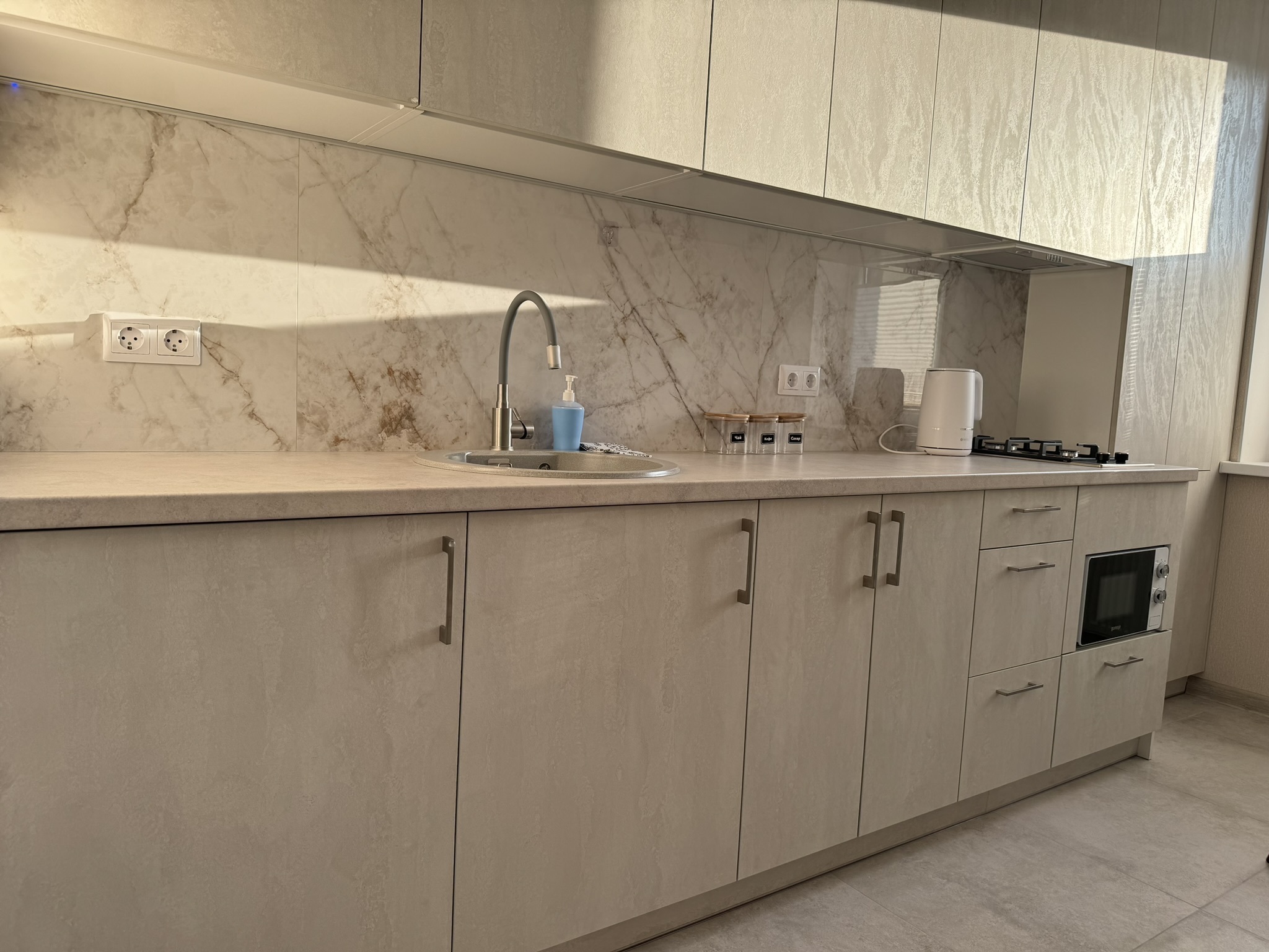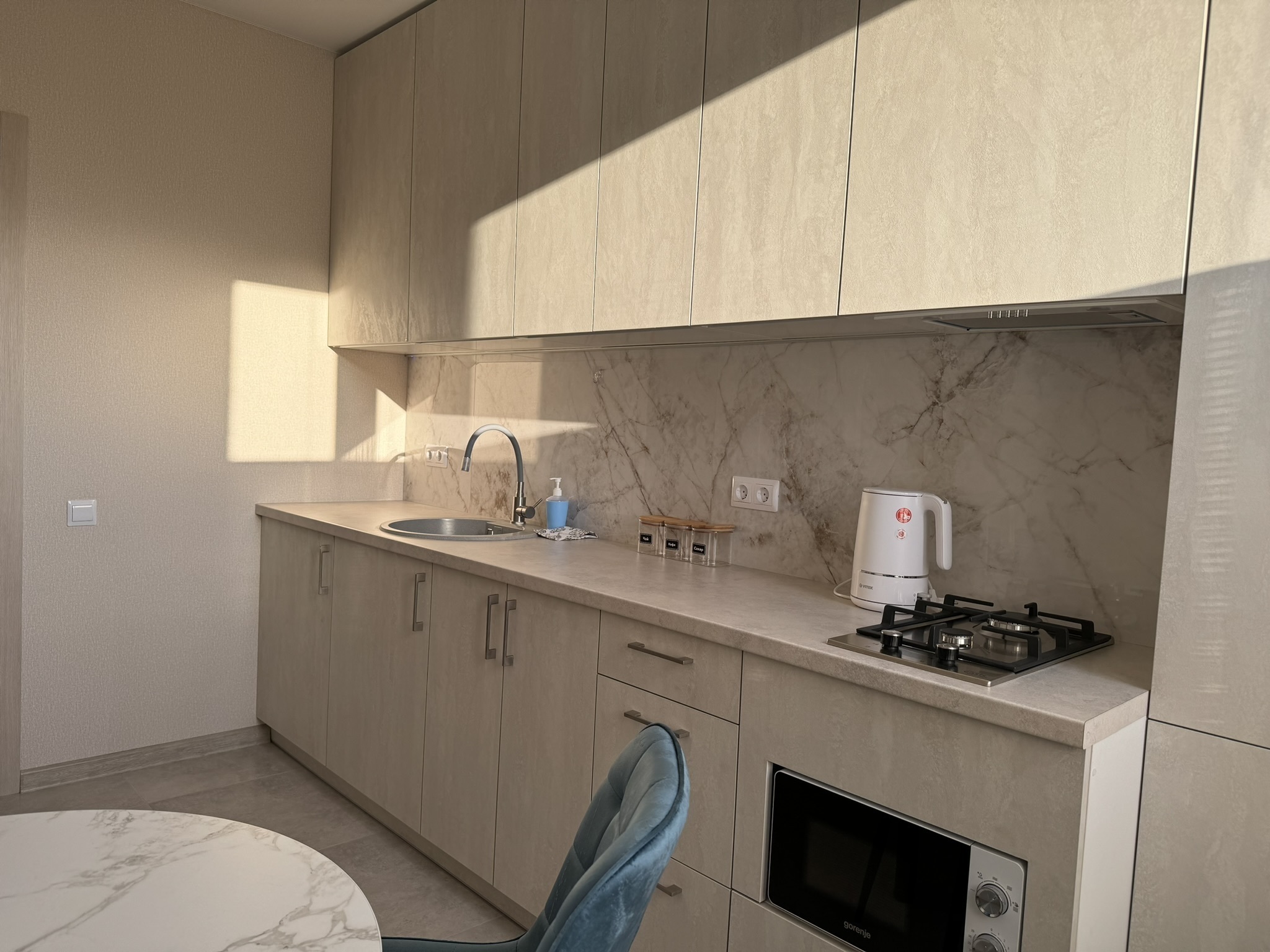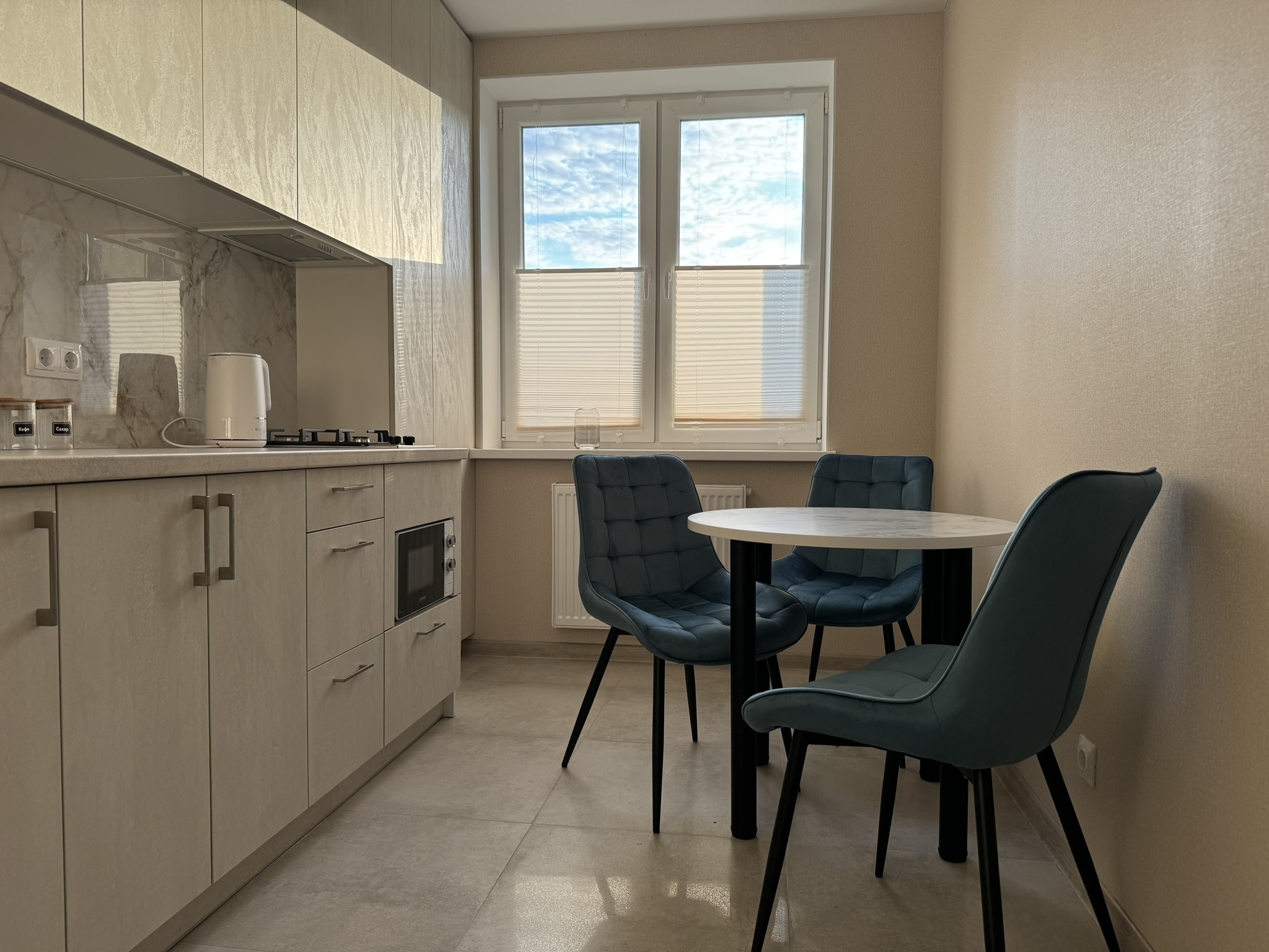 Уютная 1-комнатная квартира, для комфортного проживания 1-3 человек. Расположена на первом этаже в новом доме с огороженной территорией.
