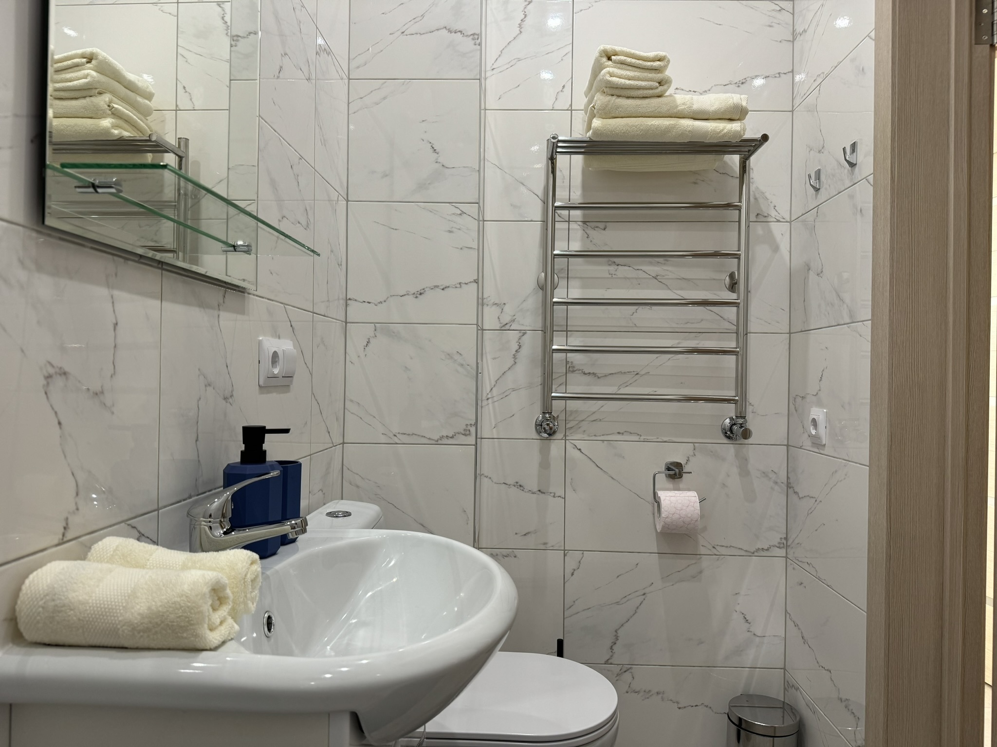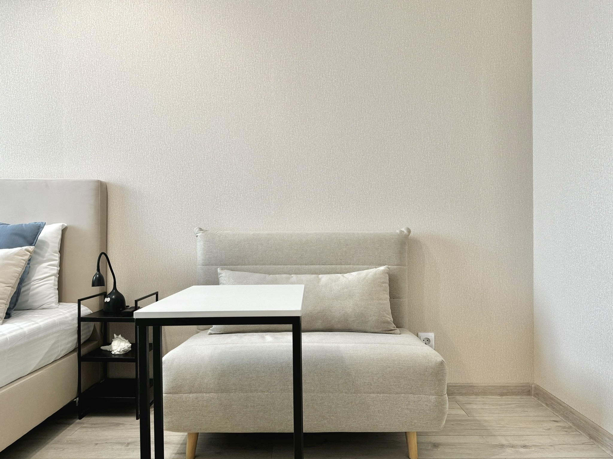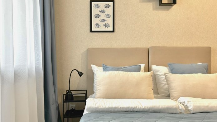В спальне для комфортного отдыха 1 двуспальная или 2 односпальных кровати и раскладывающееся кресло кровать. Прикроватные светильники, шторы блек аут, smart ТВ.
