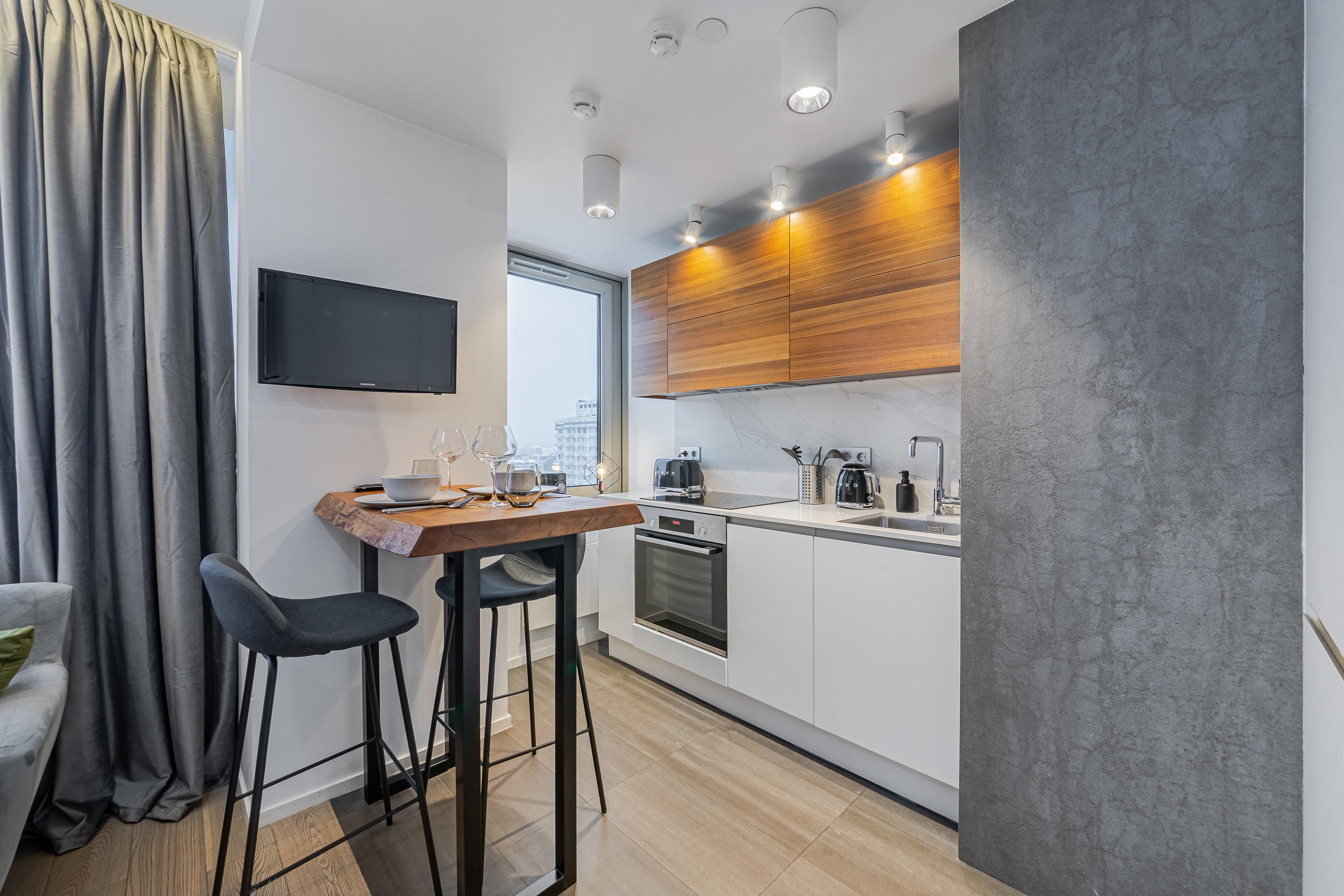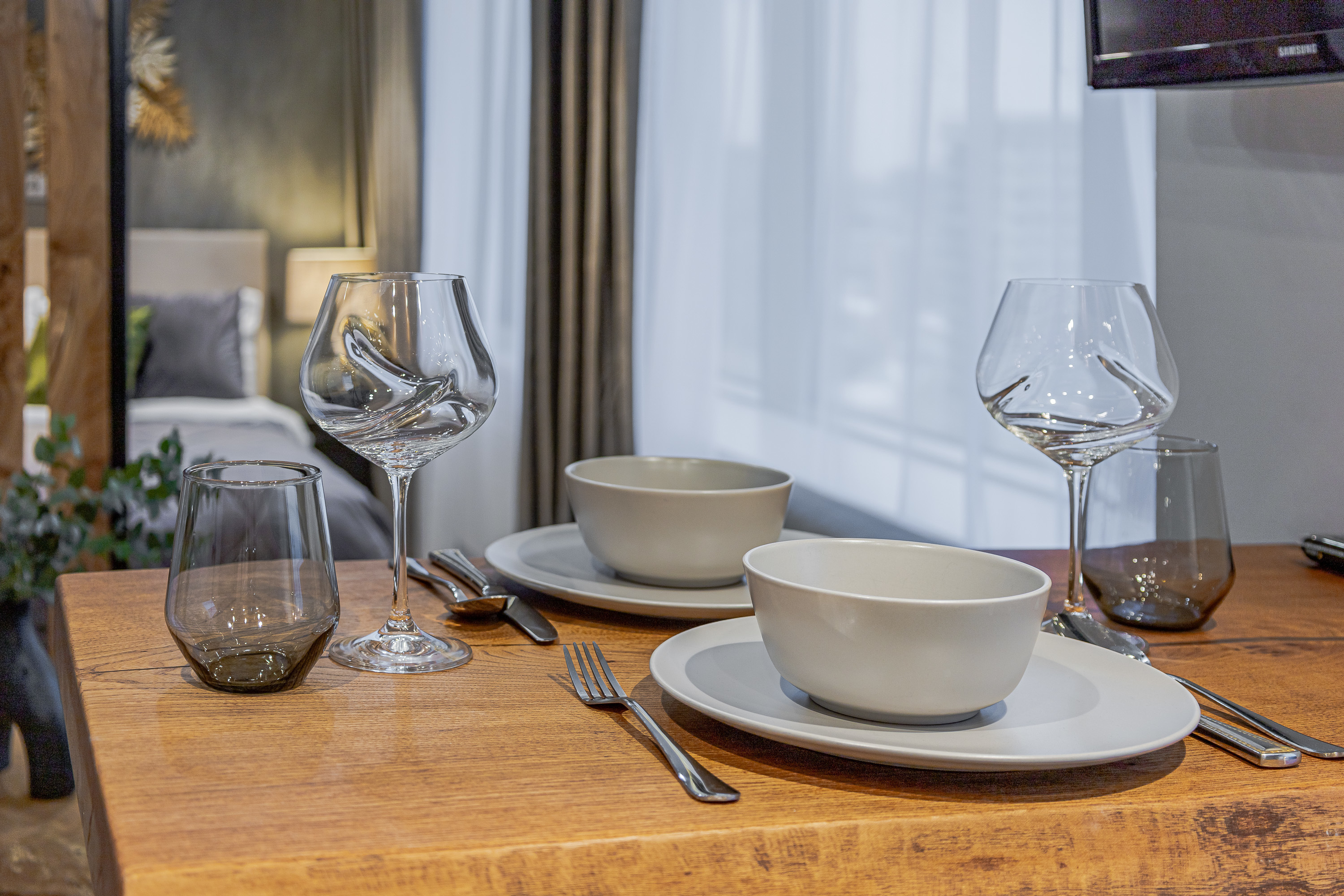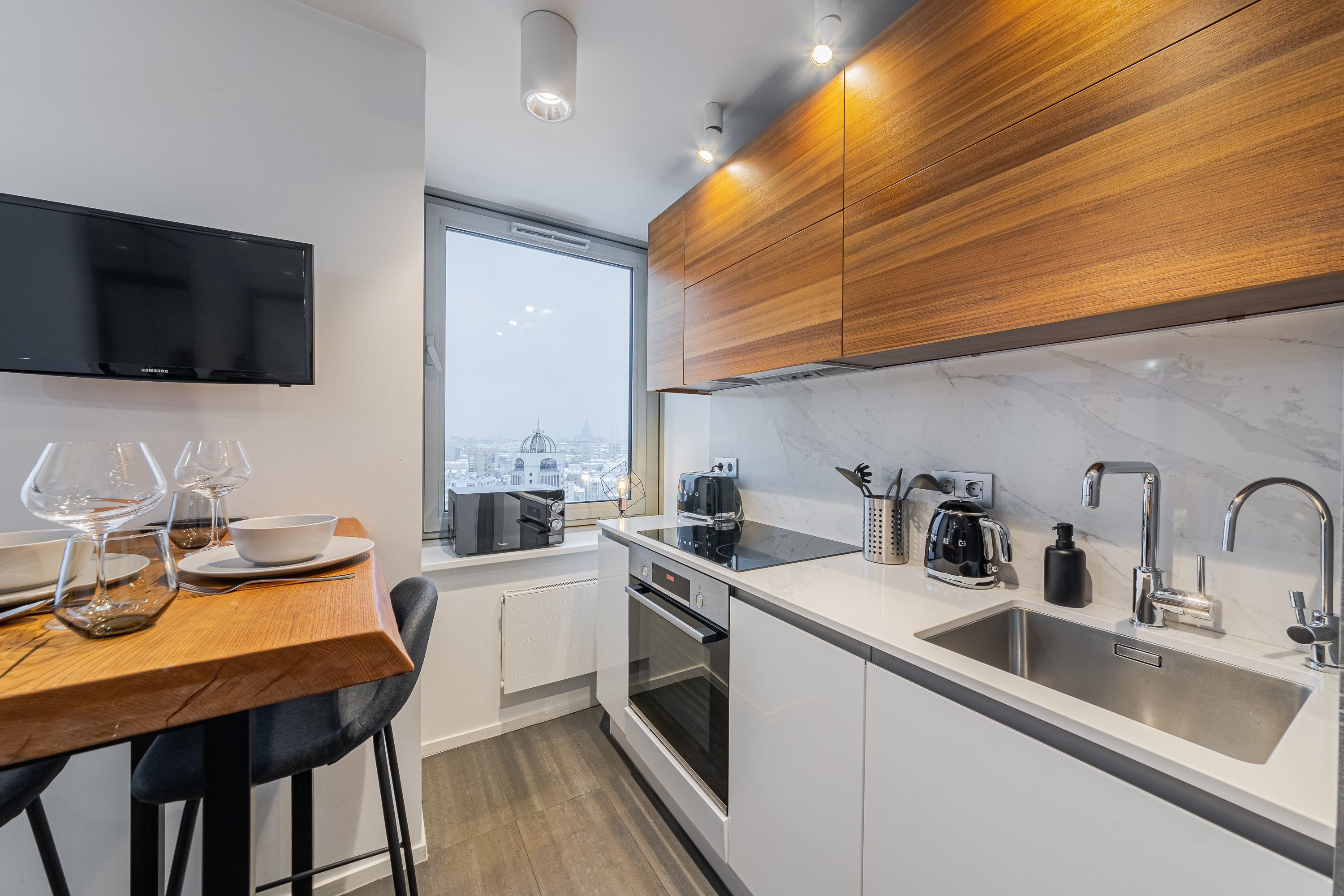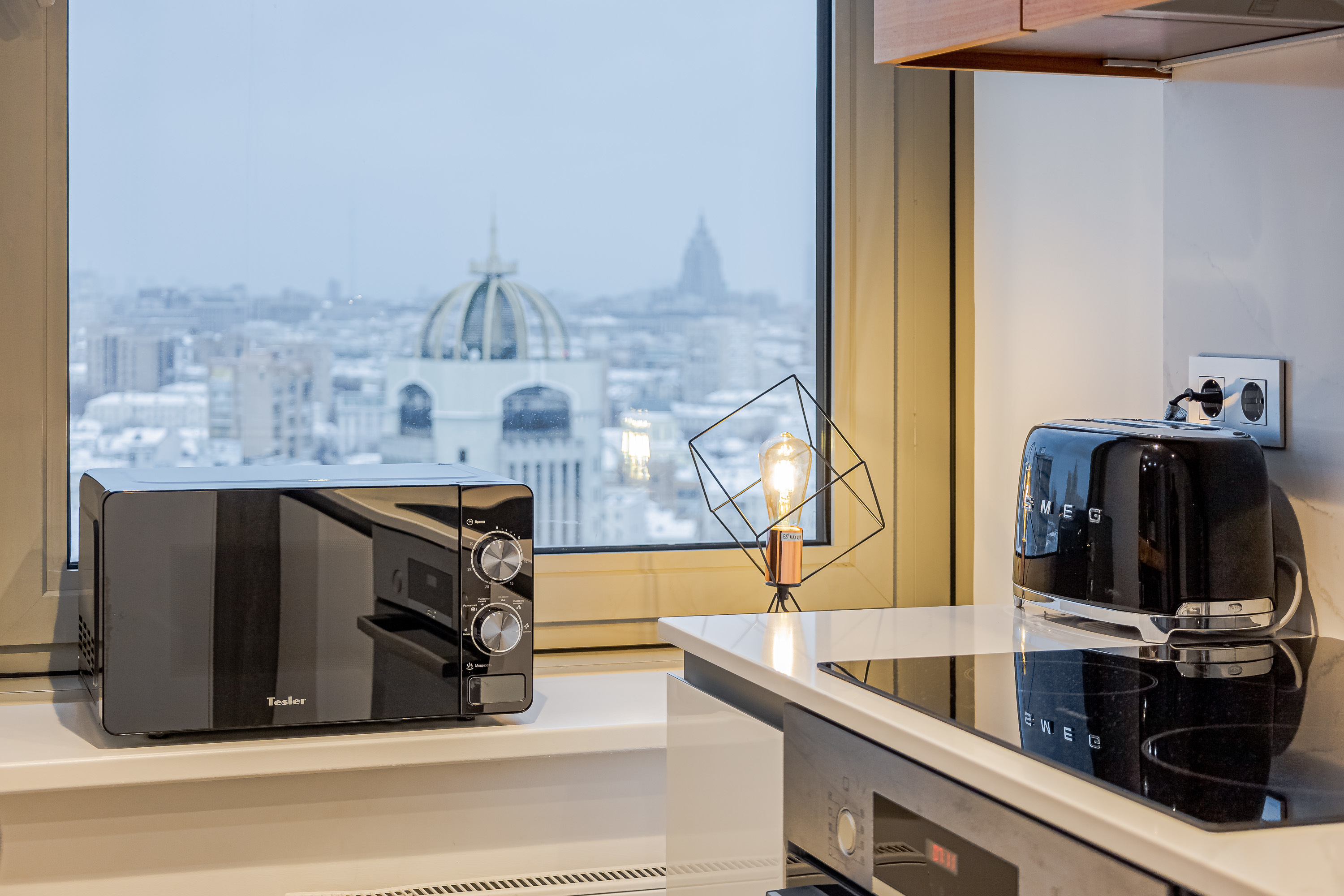 Апартаменты имеют полноценную удобную кухню, где Вы сможете приготовить свои любимые блюда. Кухня оборудована всей необходимой техникой: электрическим чайником, микроволновой печью, духовым шкафом, вытяжкой, холодильником и даже тостером.