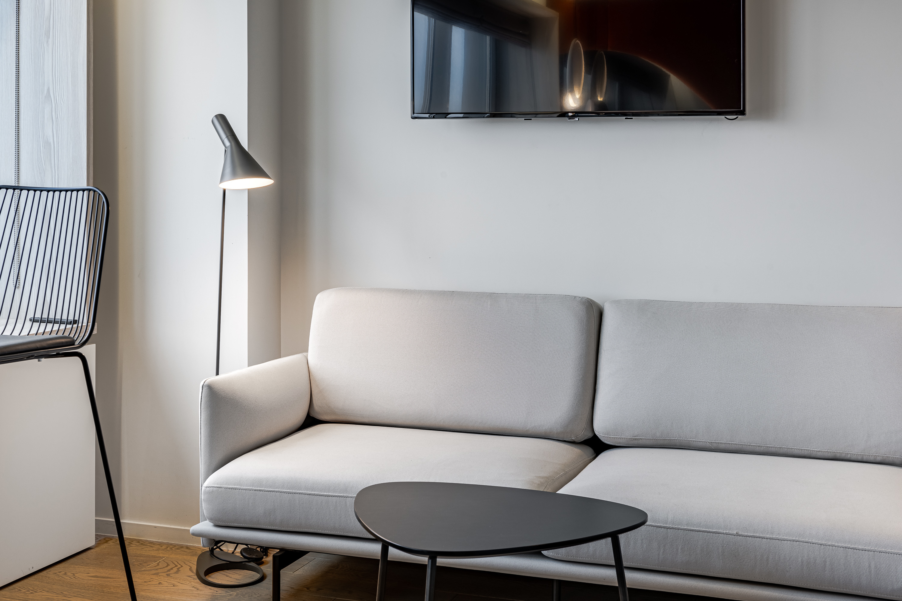 Вы сможете с комфортом разместиться на большой двуспальной кровати размера king-size. Также в апартаментах имеется небольшой диван для отдыха.