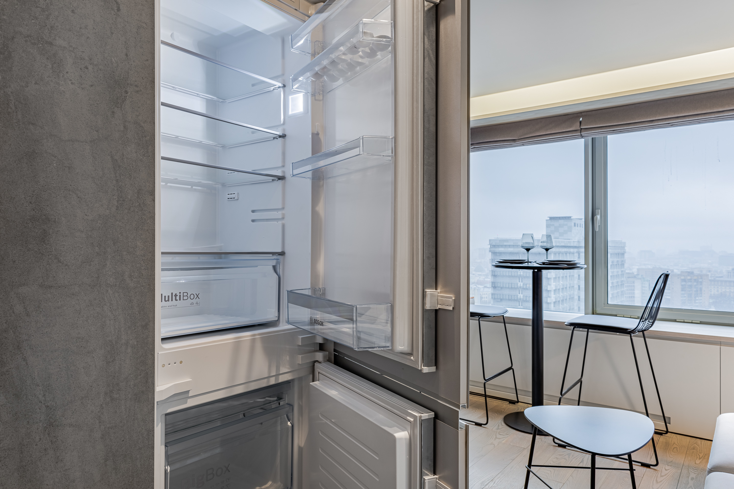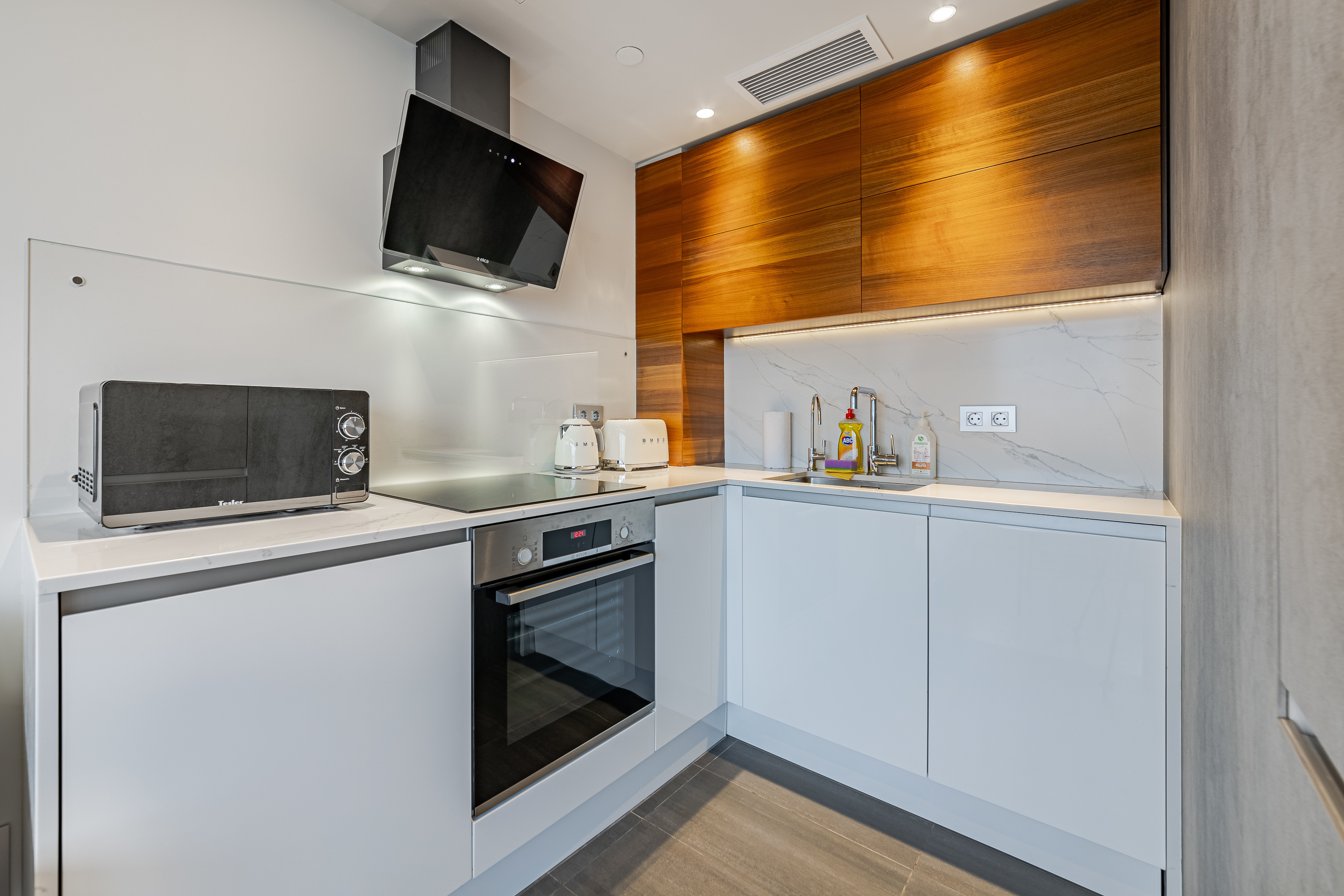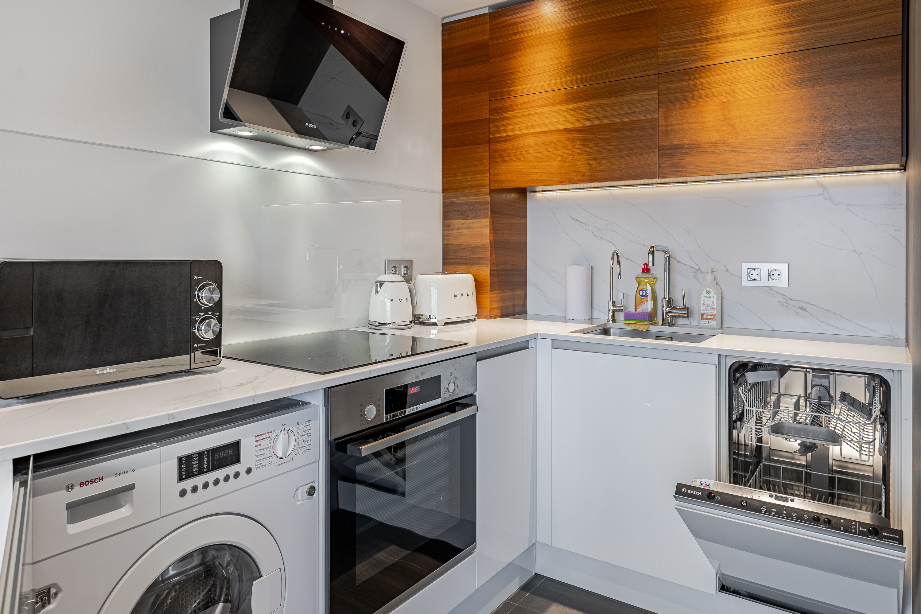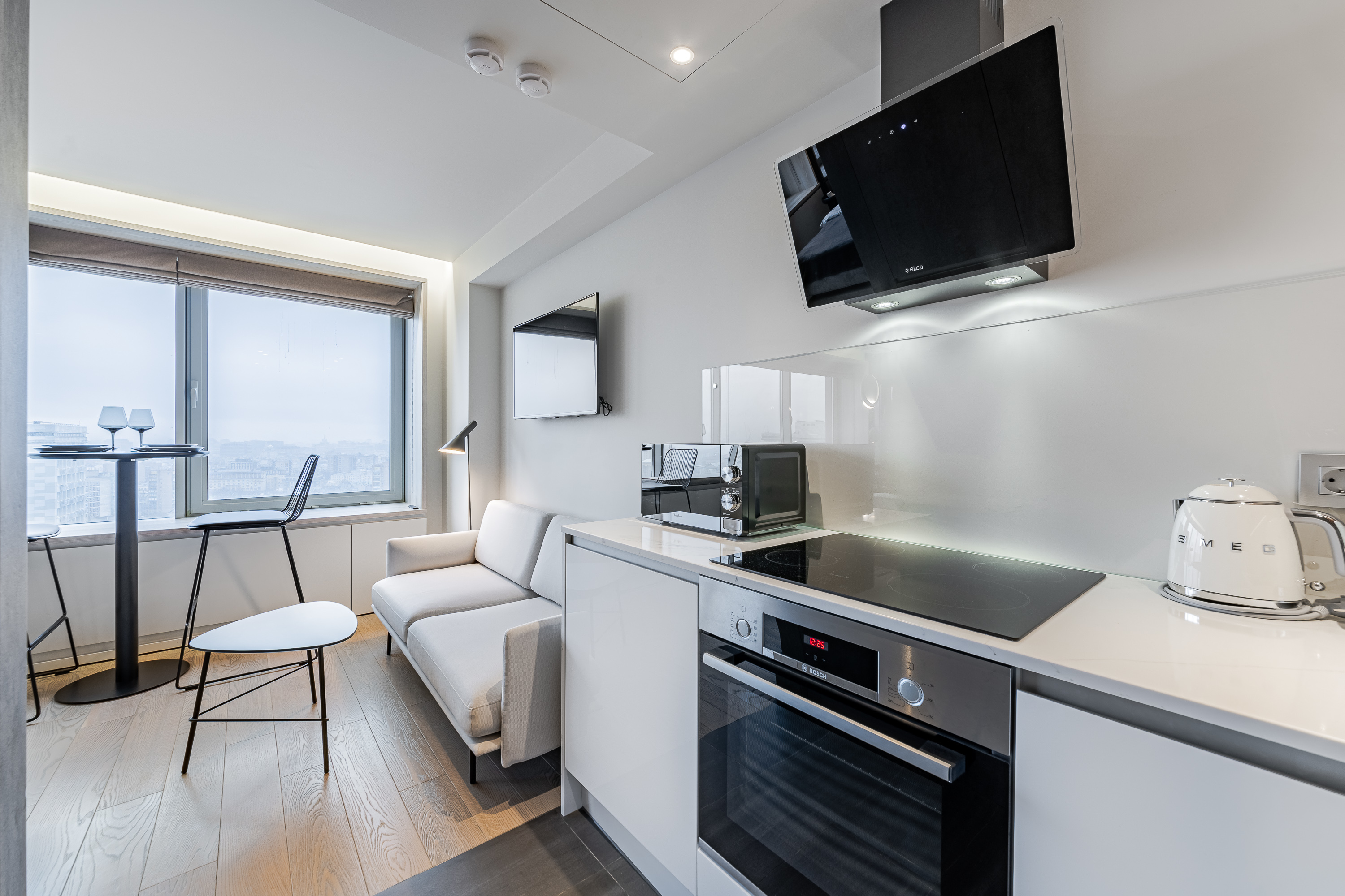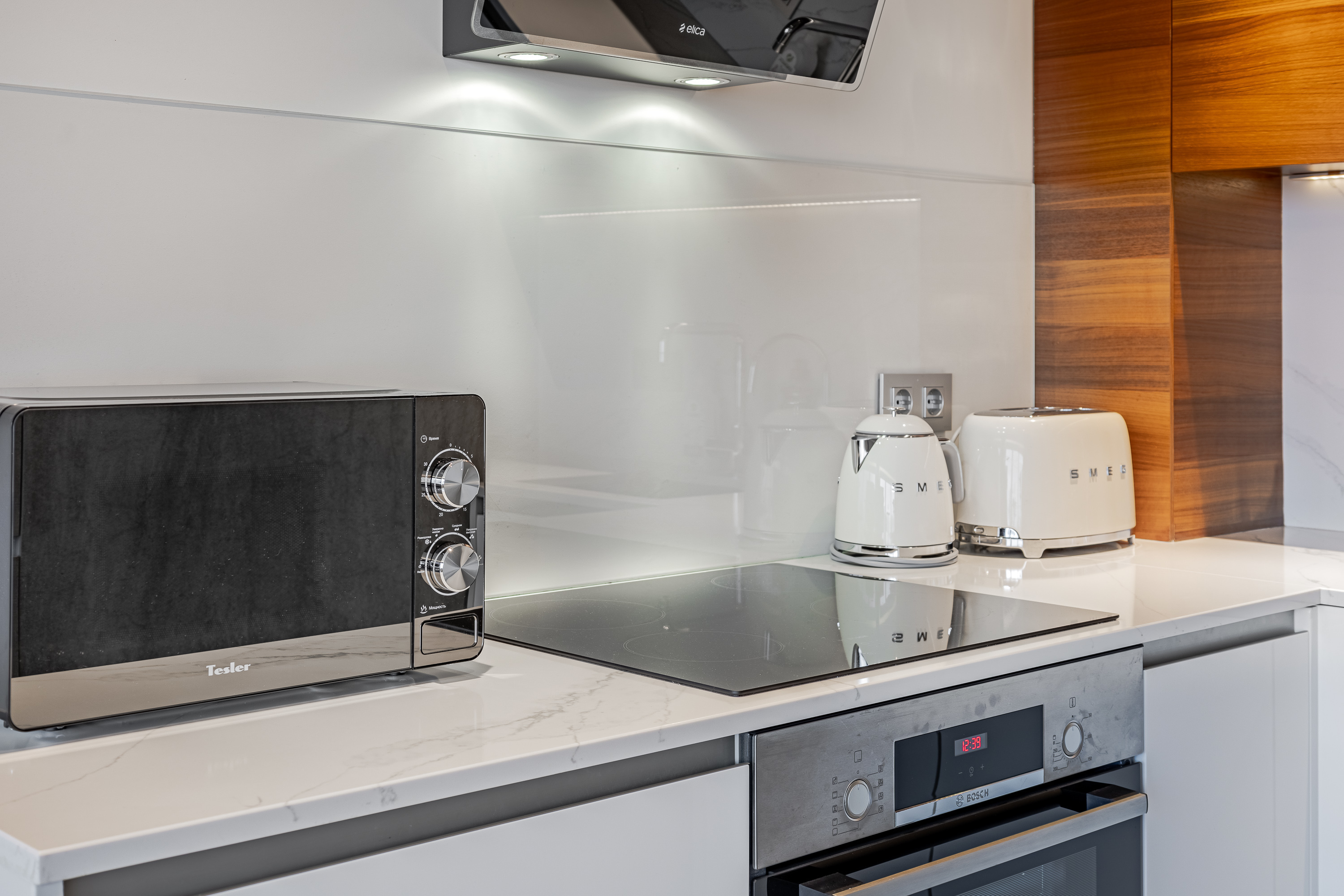 Апартаменты имеют полноценную удобную кухню, где Вы сможете приготовить свои любимые блюда. Кухня оборудована всей необходимой техникой: электрическим чайником, микроволновой печью, духовым шкафом, вытяжкой, холодильником, кофемашиной и даже тостером.