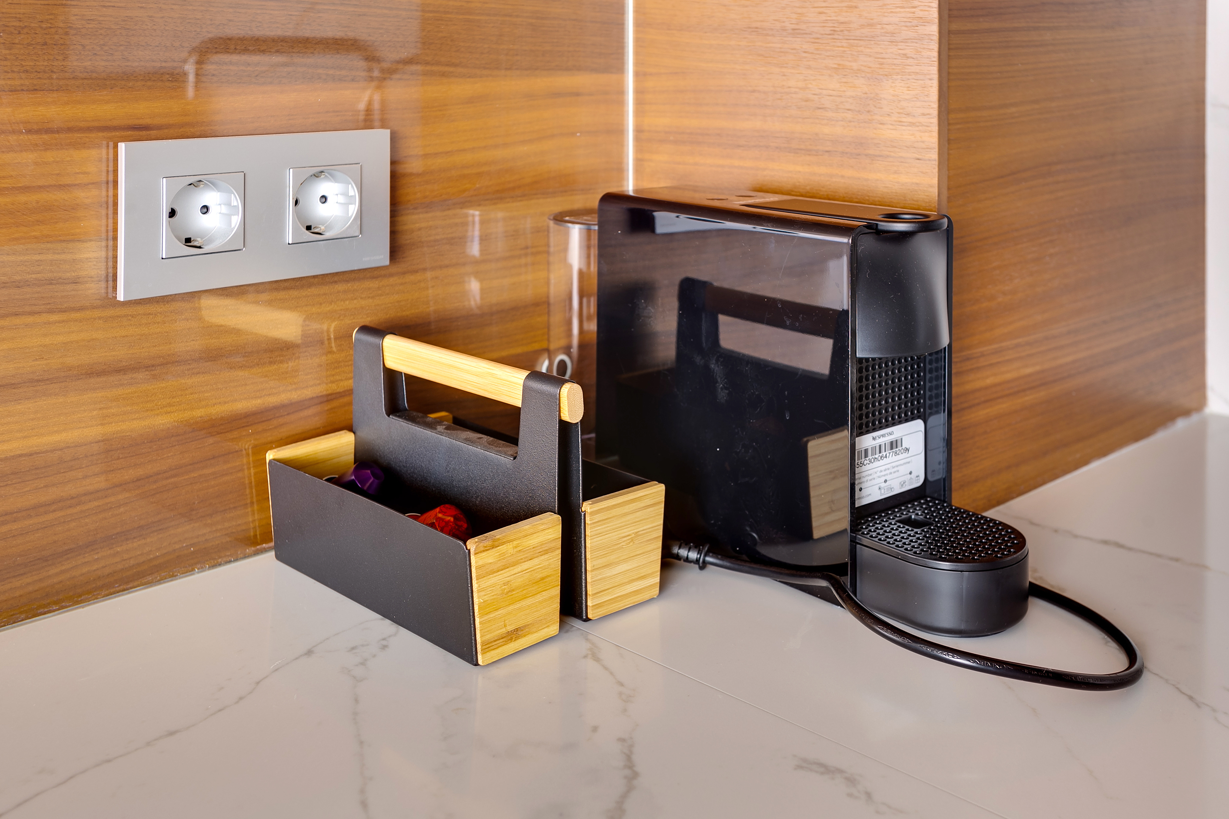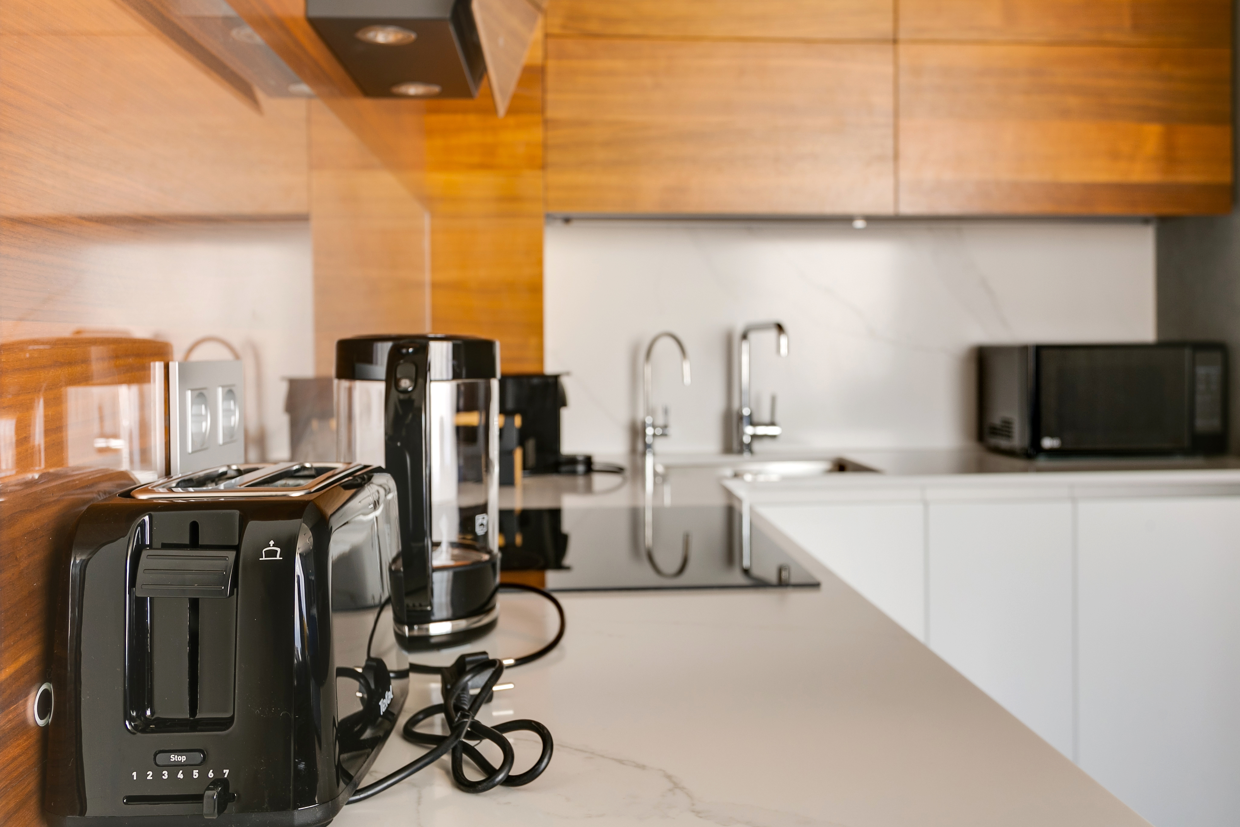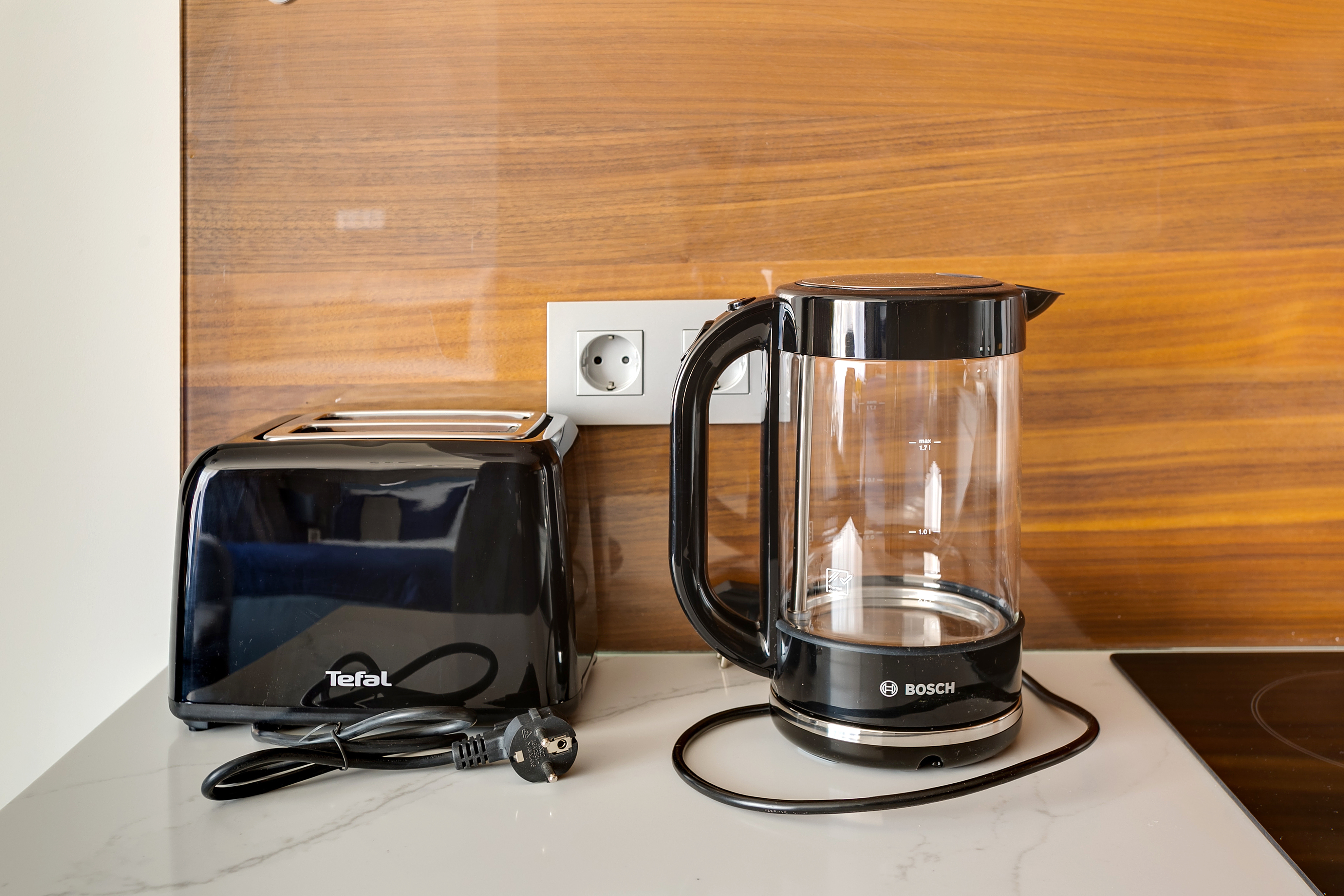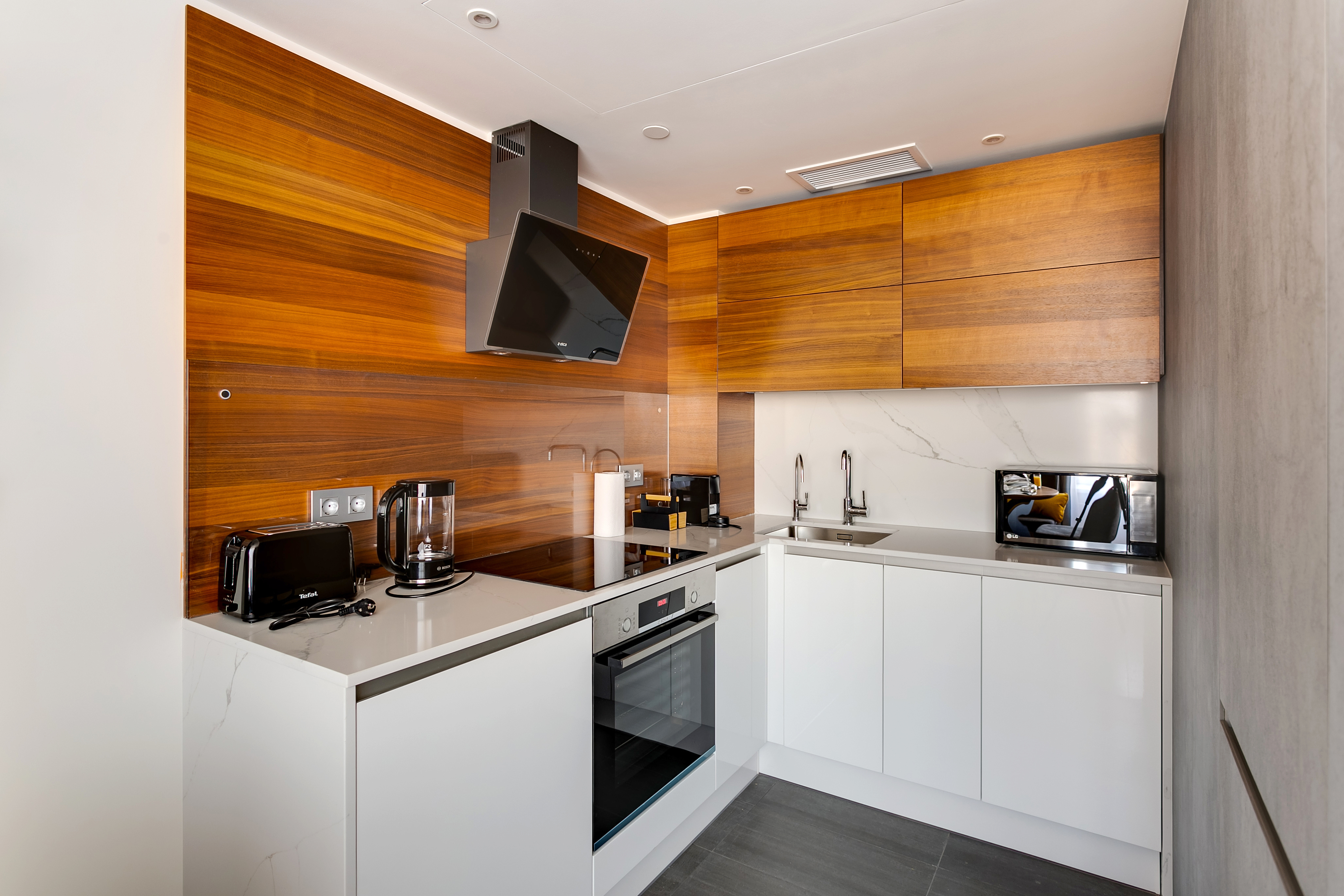 Апартаменты имеют полноценную удобную кухню, где Вы сможете приготовить свои любимые кулинарные шедевры. Кухня оборудована всей необходимой техникой: электрическим чайником, микроволновой печью, духовым шкафом, вытяжкой, холодильником, кофемашиной и даже тостером.