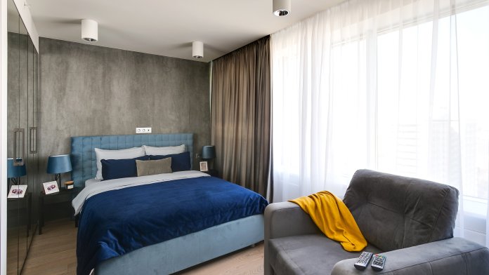 Отделка выполнена в современном стиле в ярких синих тонах. Большие окна во всю стену, дизайнерская мебель, текстиль и уникальные элементы декора подарят незабываемые ощущения комфорта.