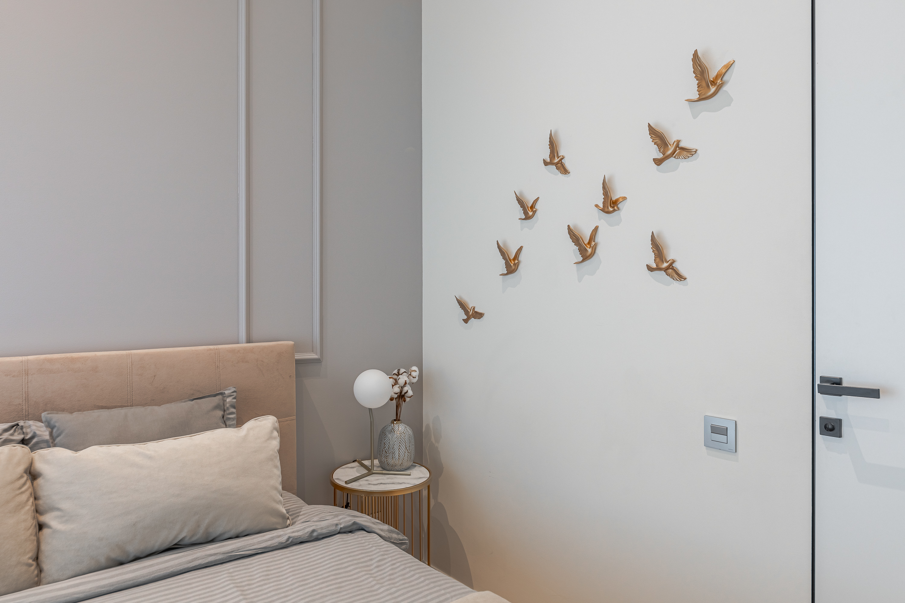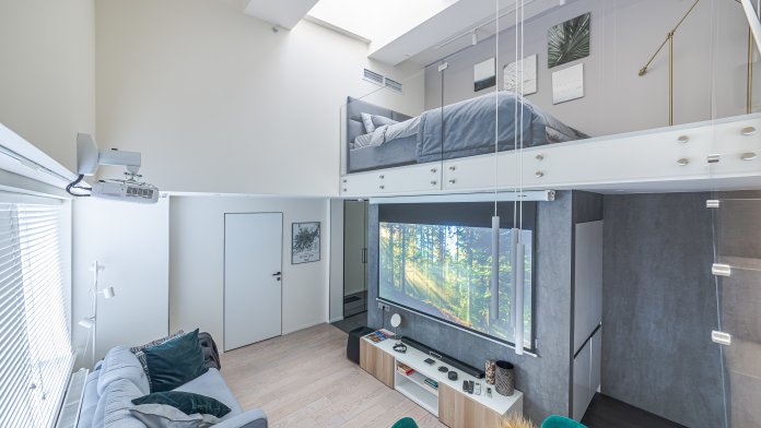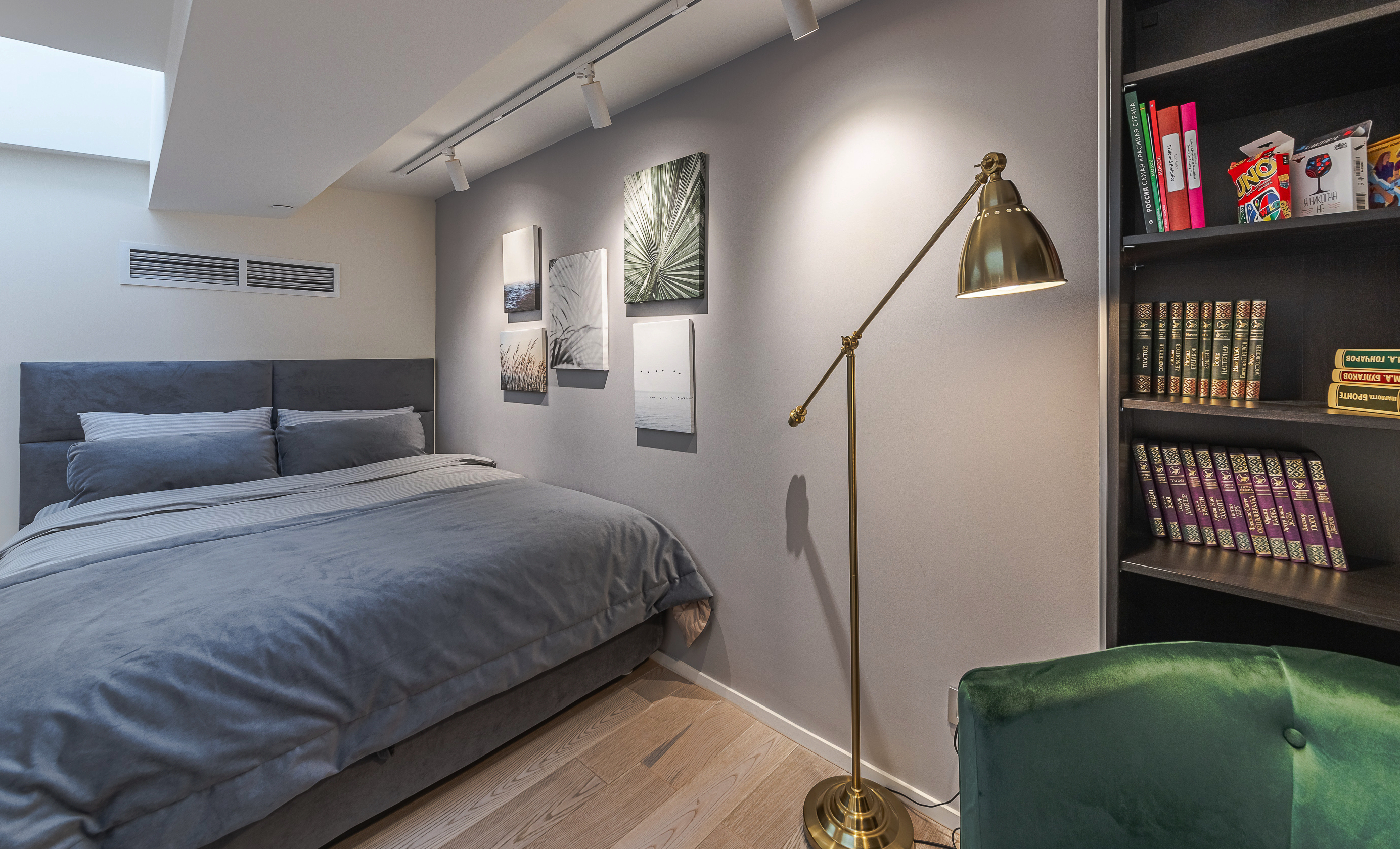- на 2-ом уровне расположена зона спальни с двухспальной кроватью и книжный стеллаж.