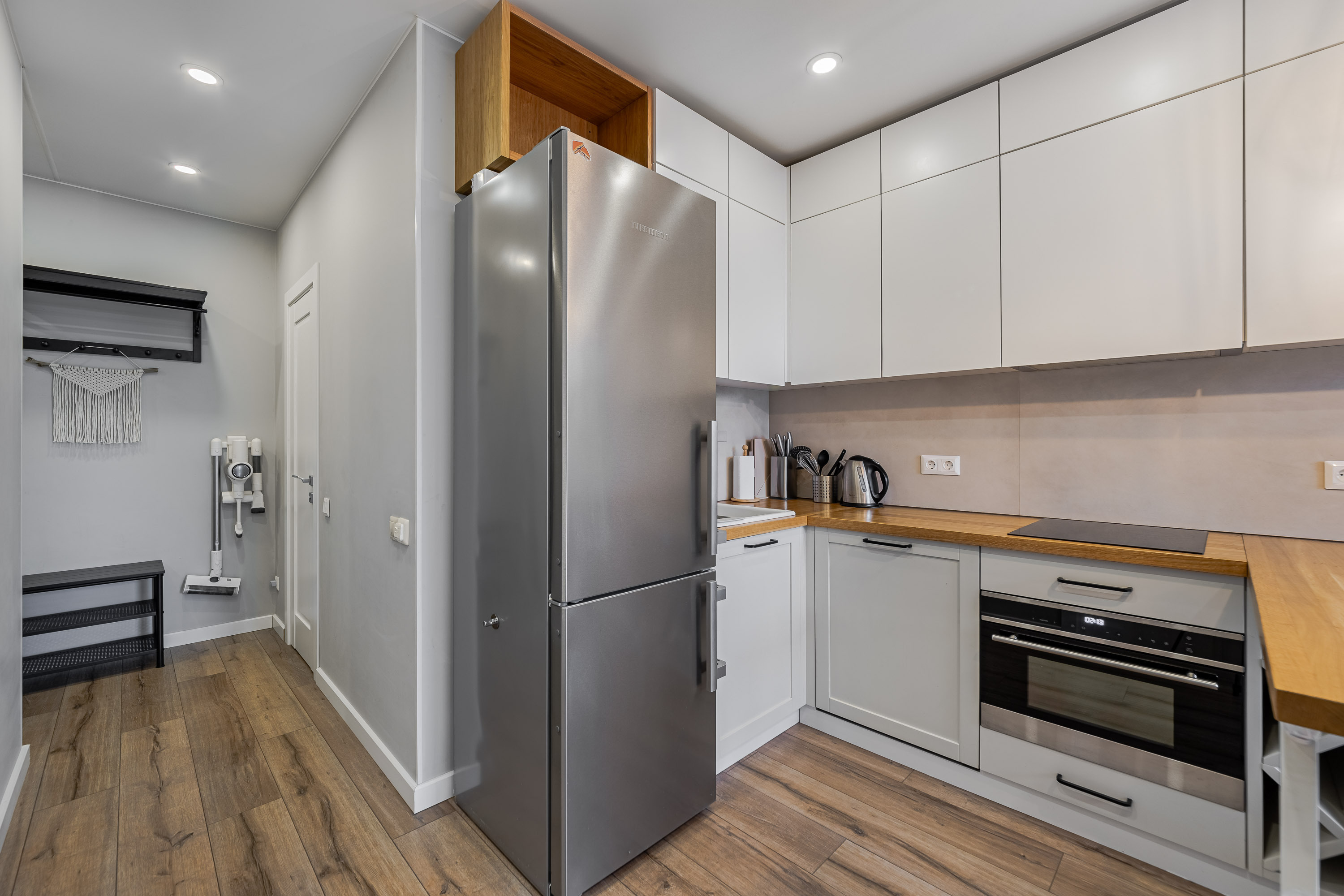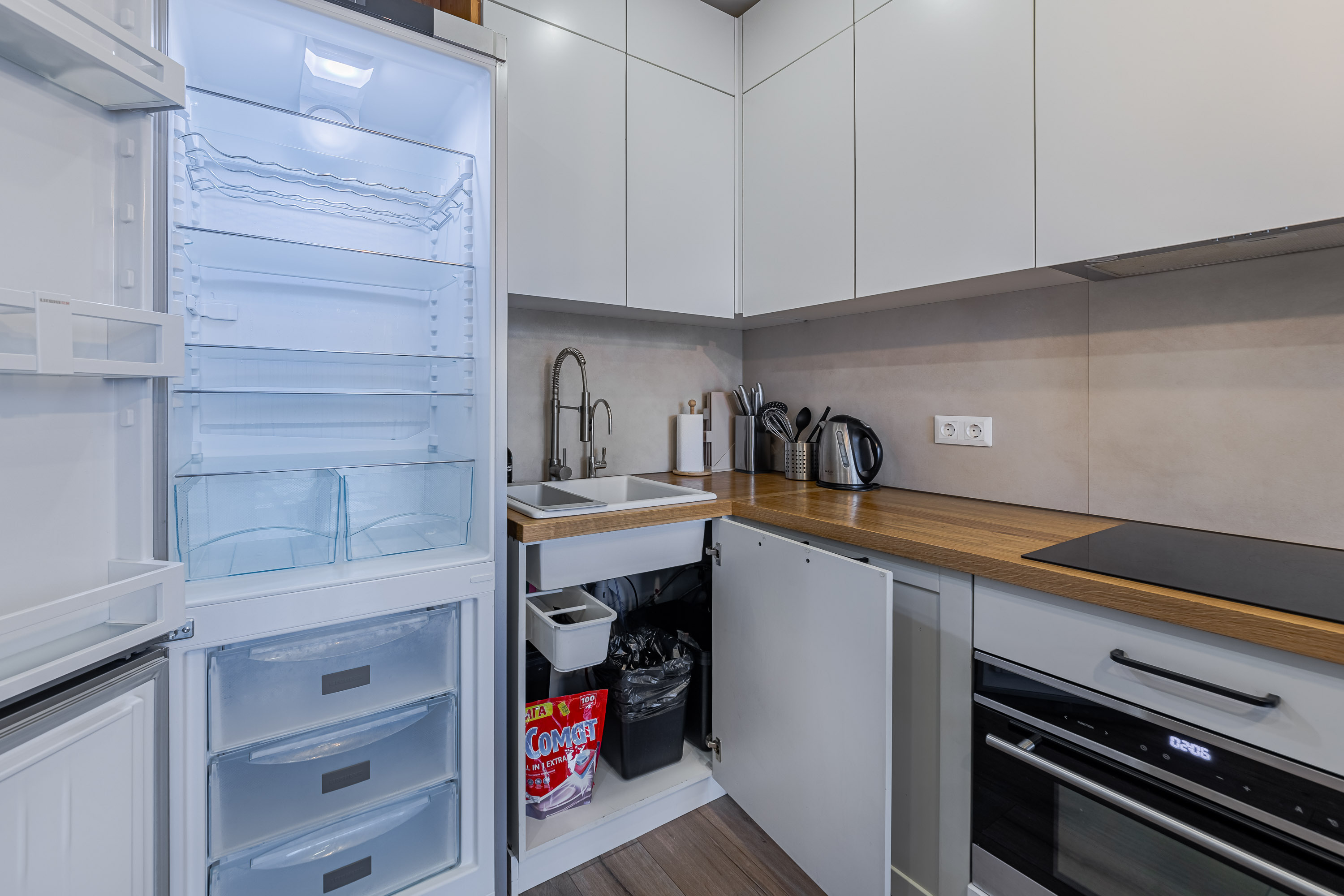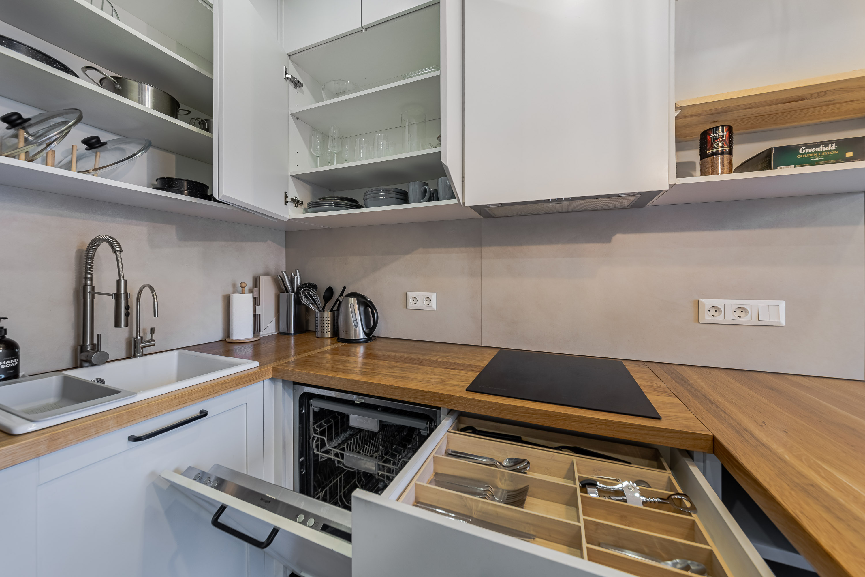 Кухня-гостиная оборудована всей необходимой техникой и мебелью: плитой, духовкой, холодильником, кофемашиной, а также набором посуды, мягкий диван служит дополнительным спальным местом.