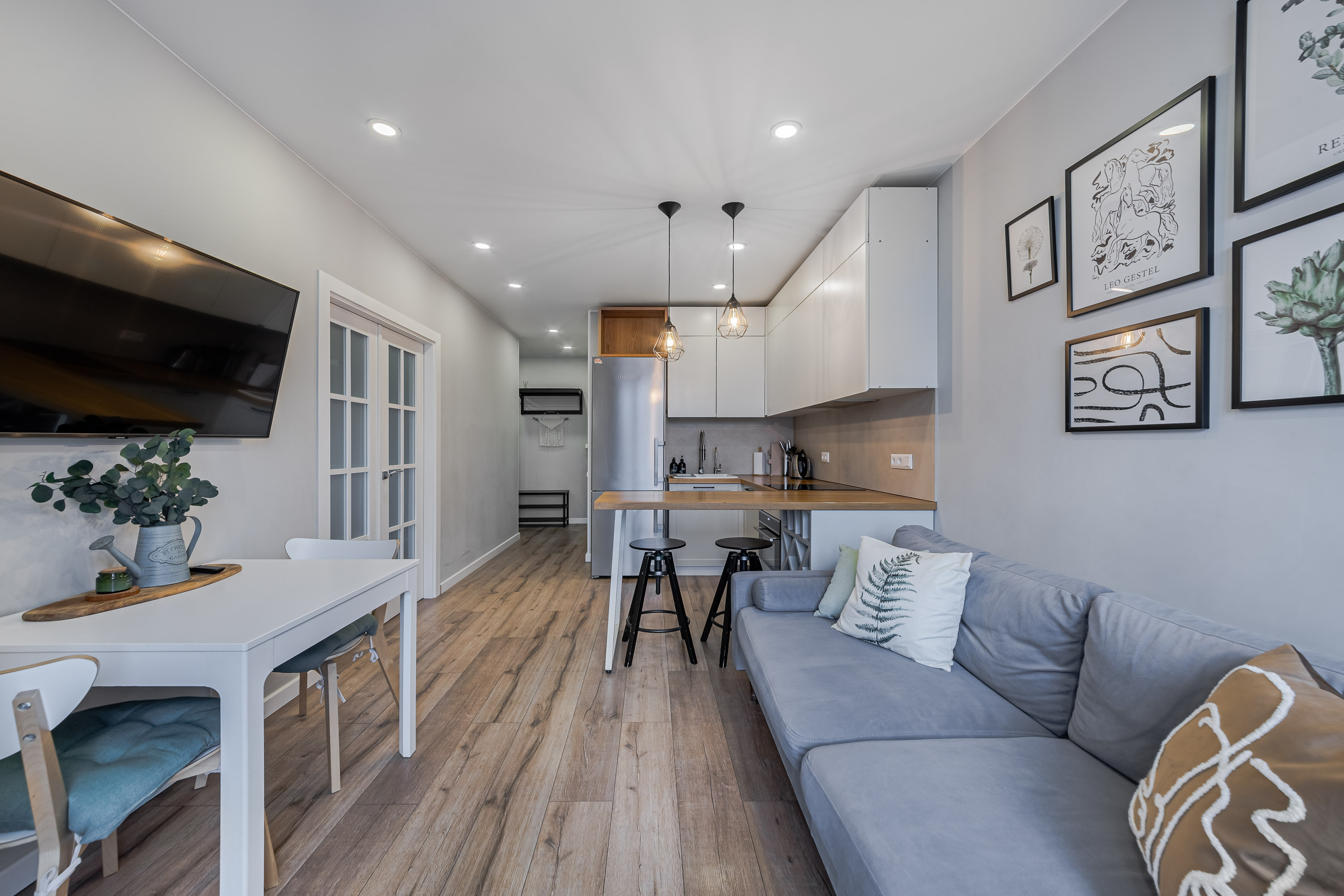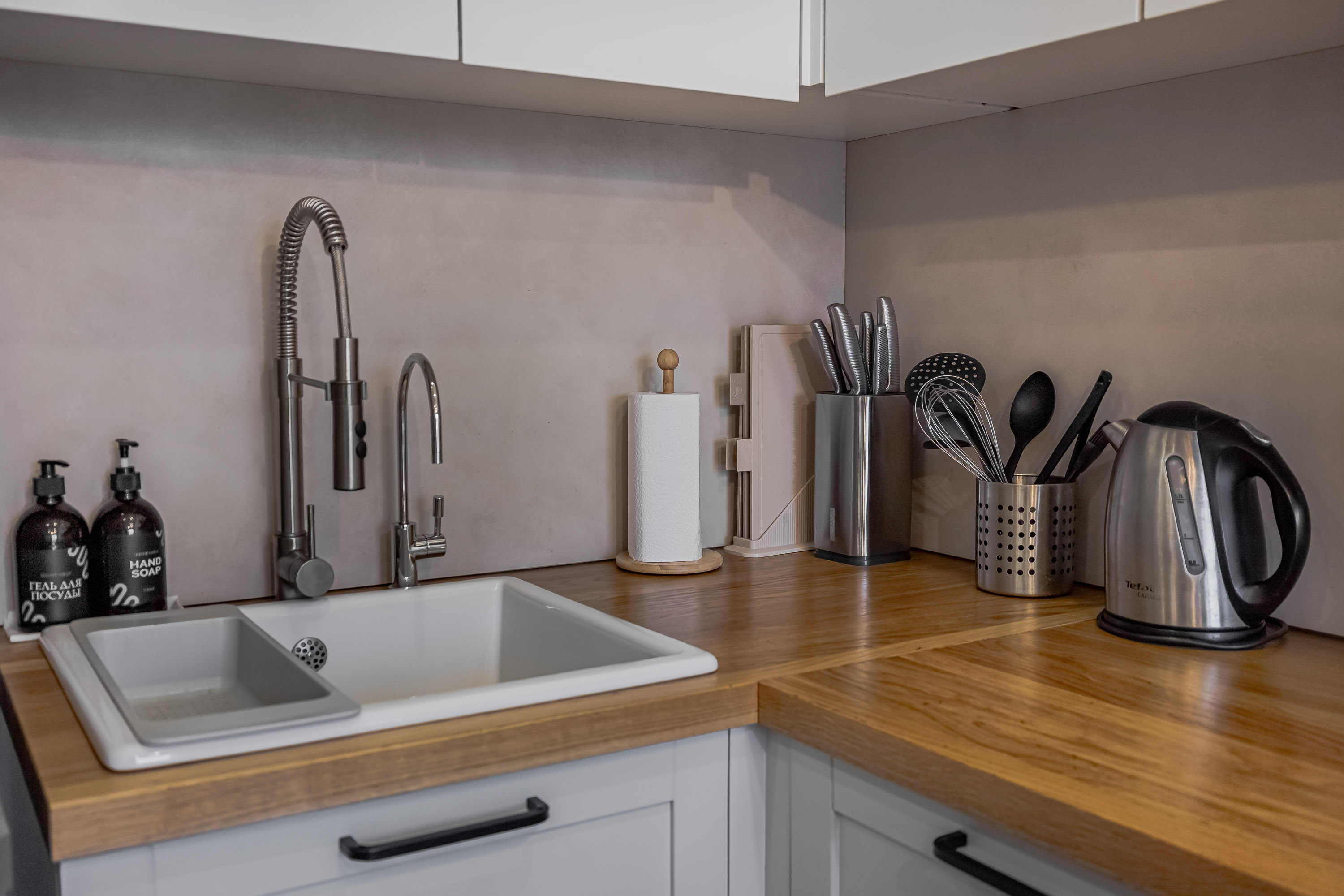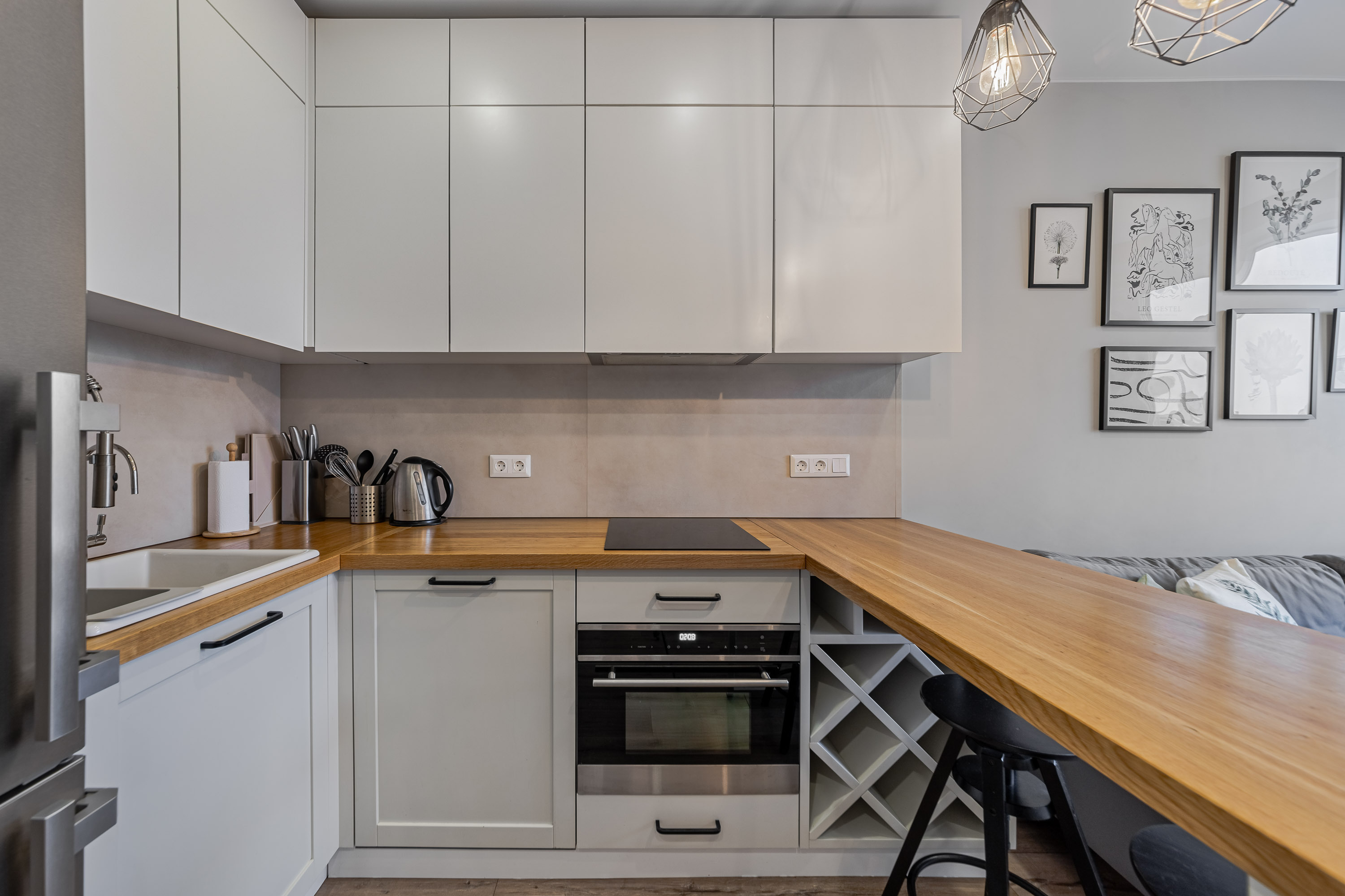 Кухня-гостиная оборудована всей необходимой техникой и мебелью: плитой, духовкой, холодильником, кофемашиной, а также набором посуды, мягкий диван служит дополнительным спальным местом.