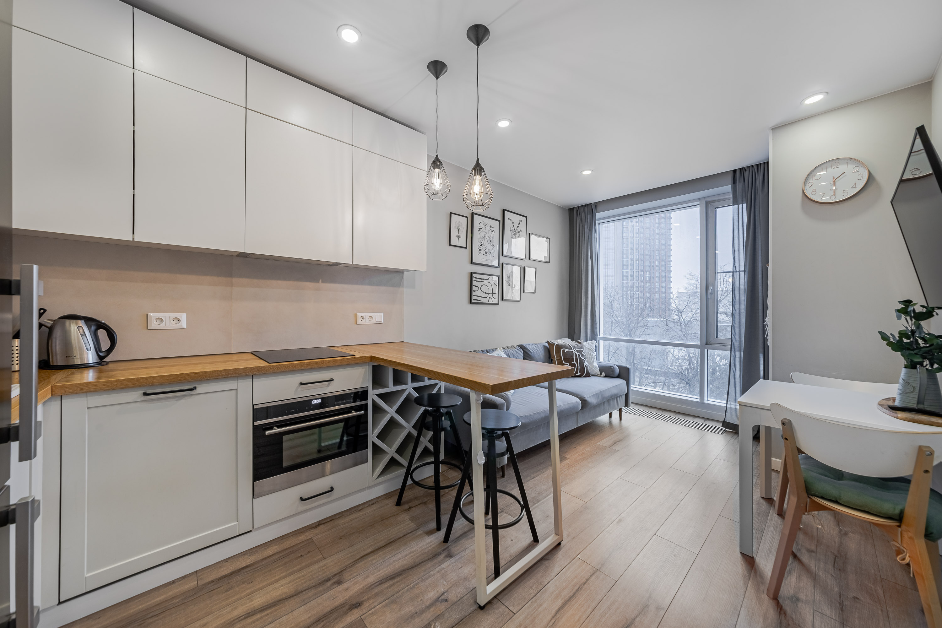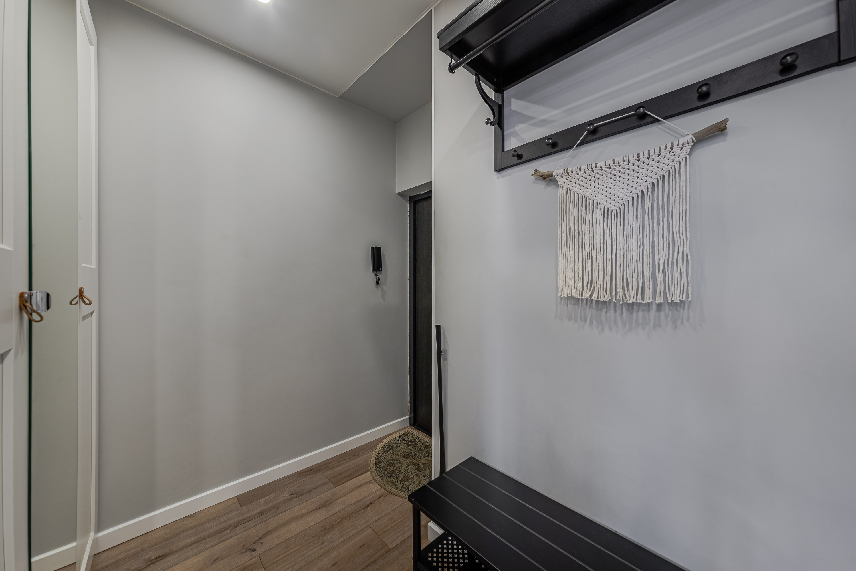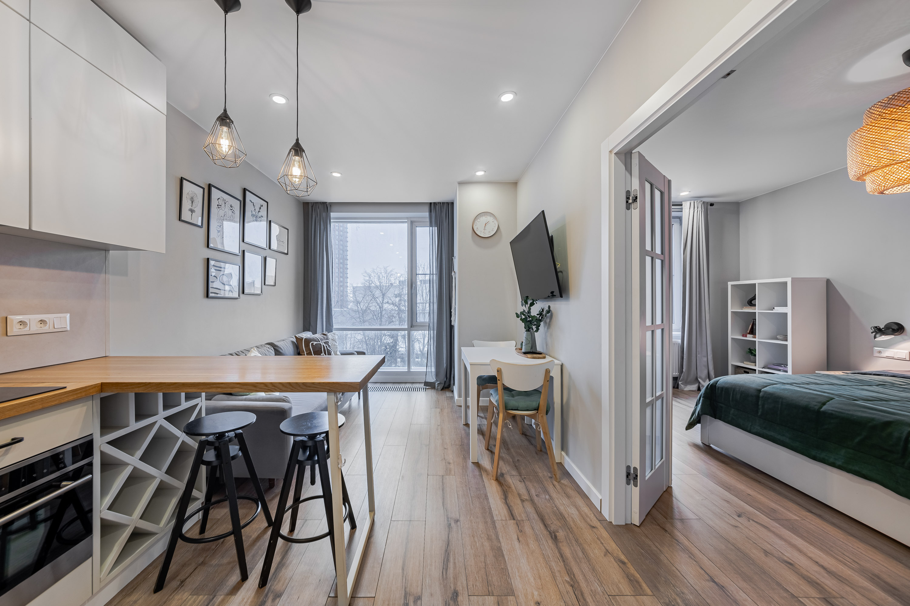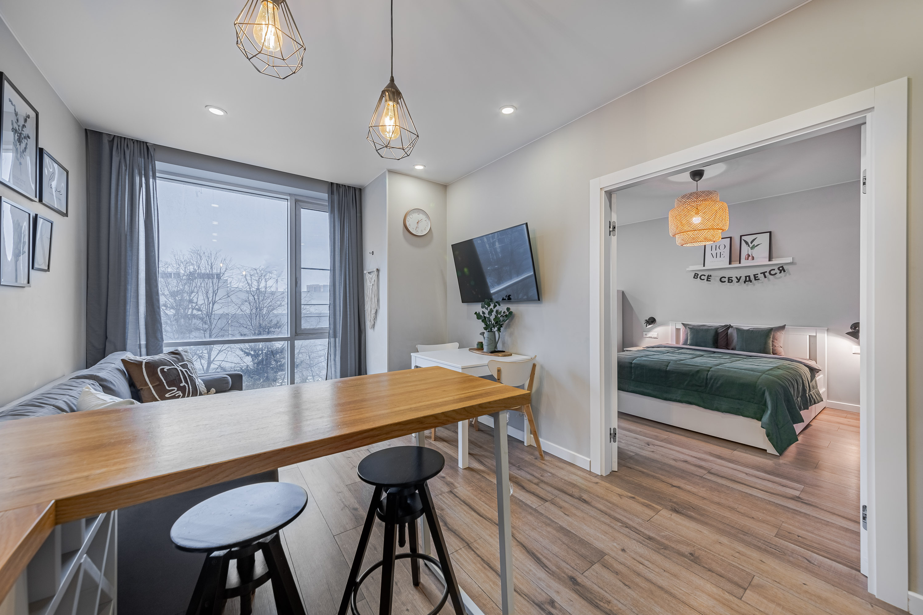 В квартире большие панорамные окна, а это значит, что у вас всегда будет светло. В комнате просторная двуспальная кровать, кондиционер и гардеробная. Это идеальны вариант не только для тех, кто планирует поездку в столицу на пару дней, но и тех, кто решит остаться на длительное время.