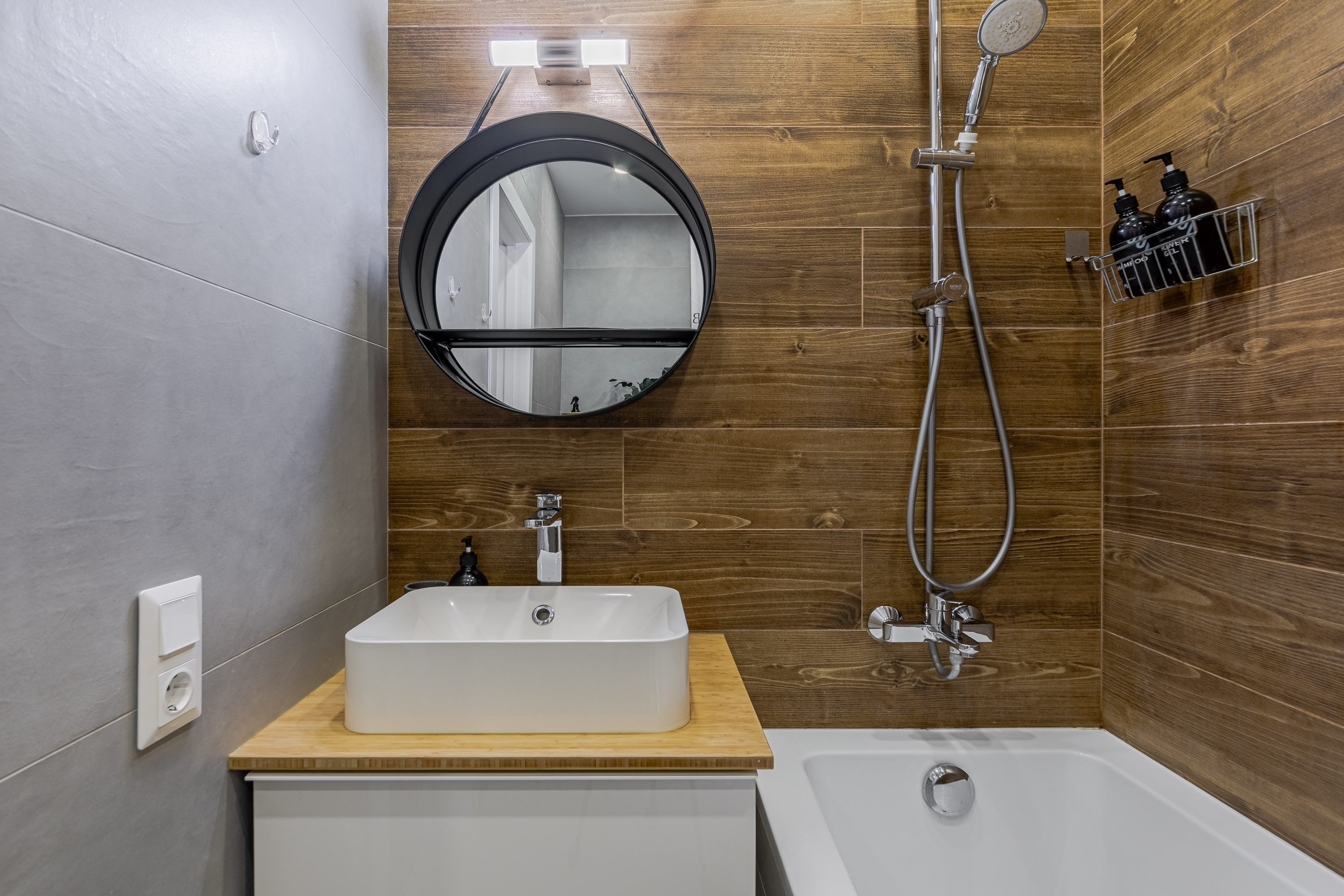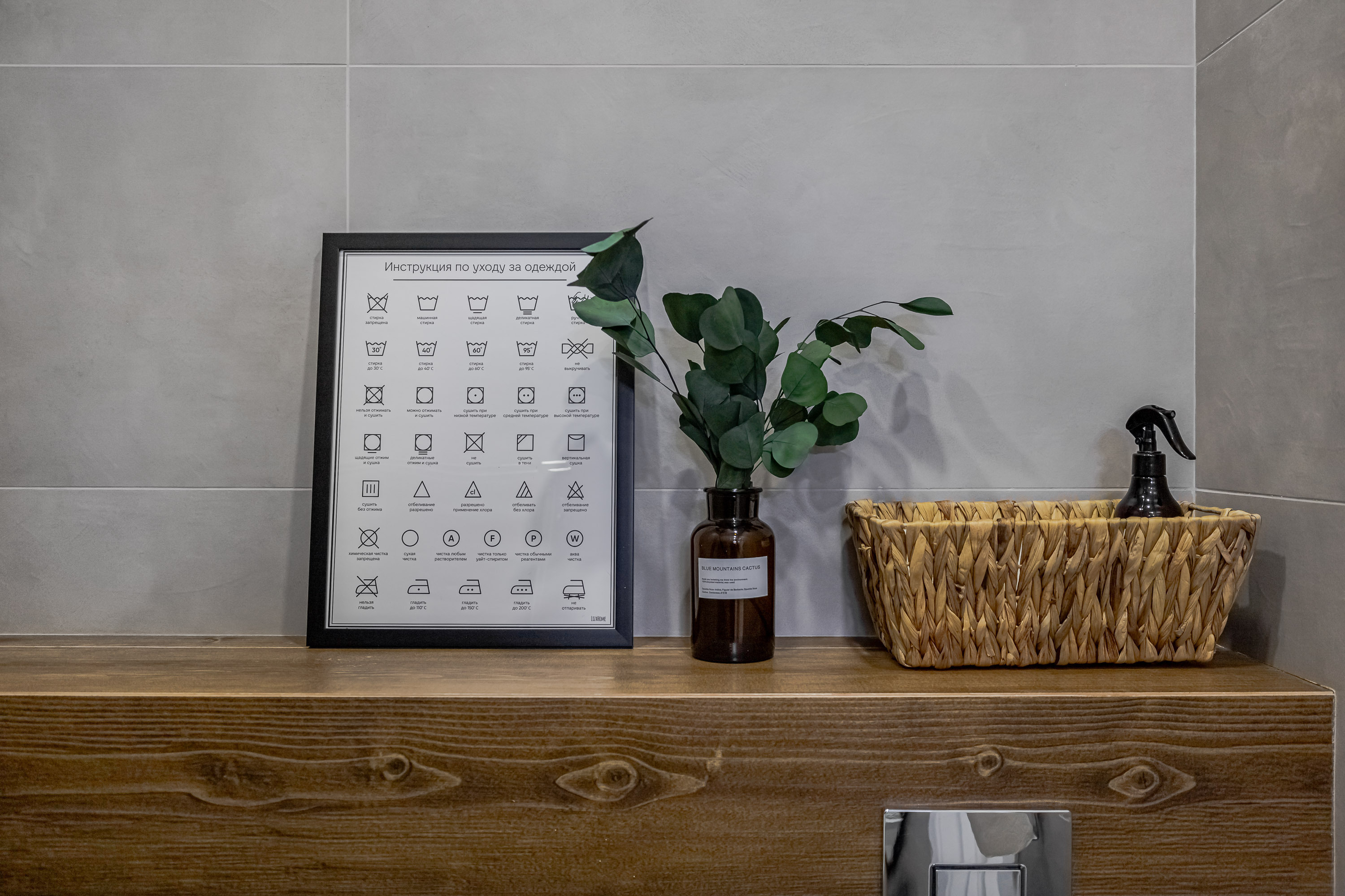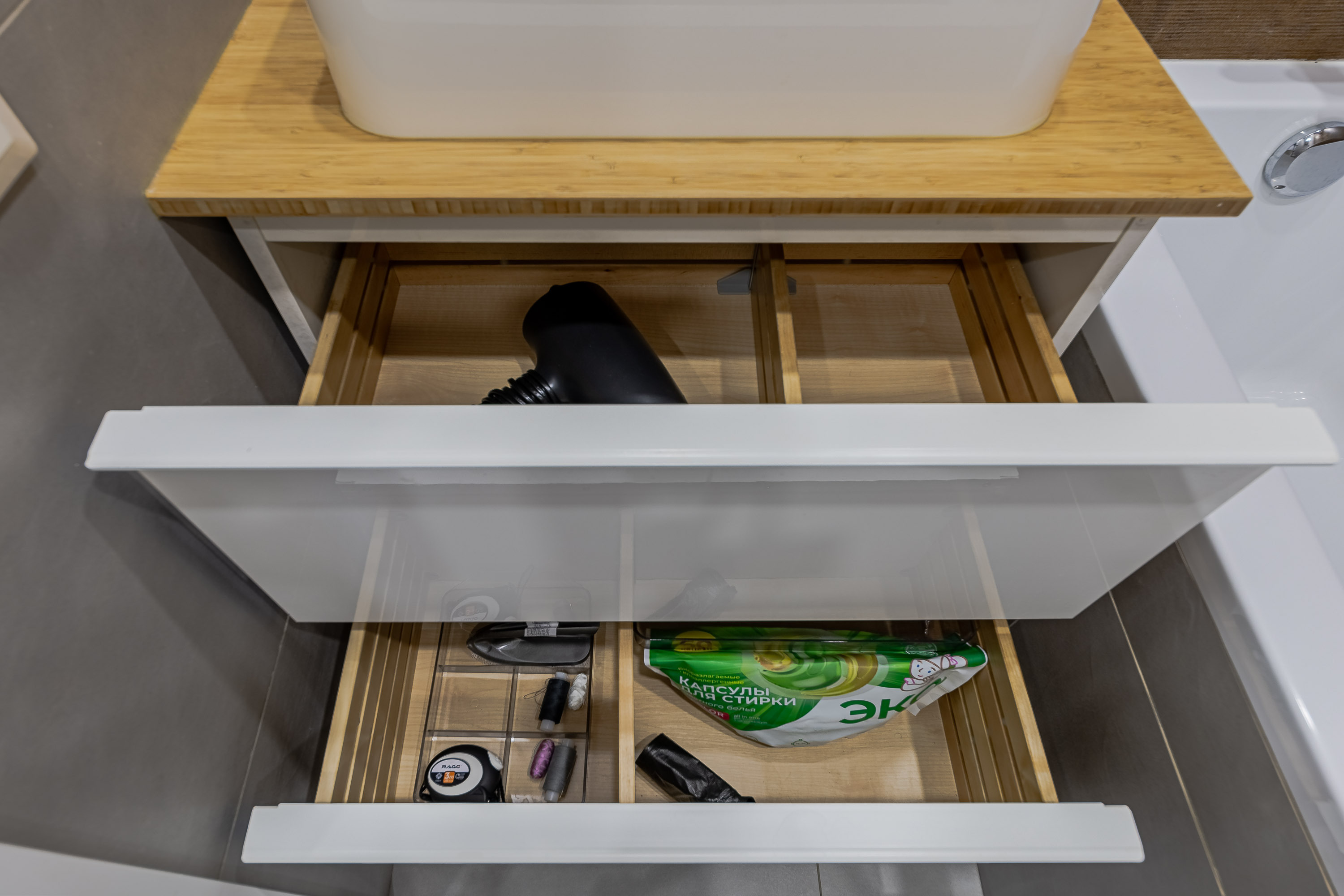 Светлая ванная комната выполнена в современном стиле и поделена на 2 зоны, что позволяет рационально использовать пространство.