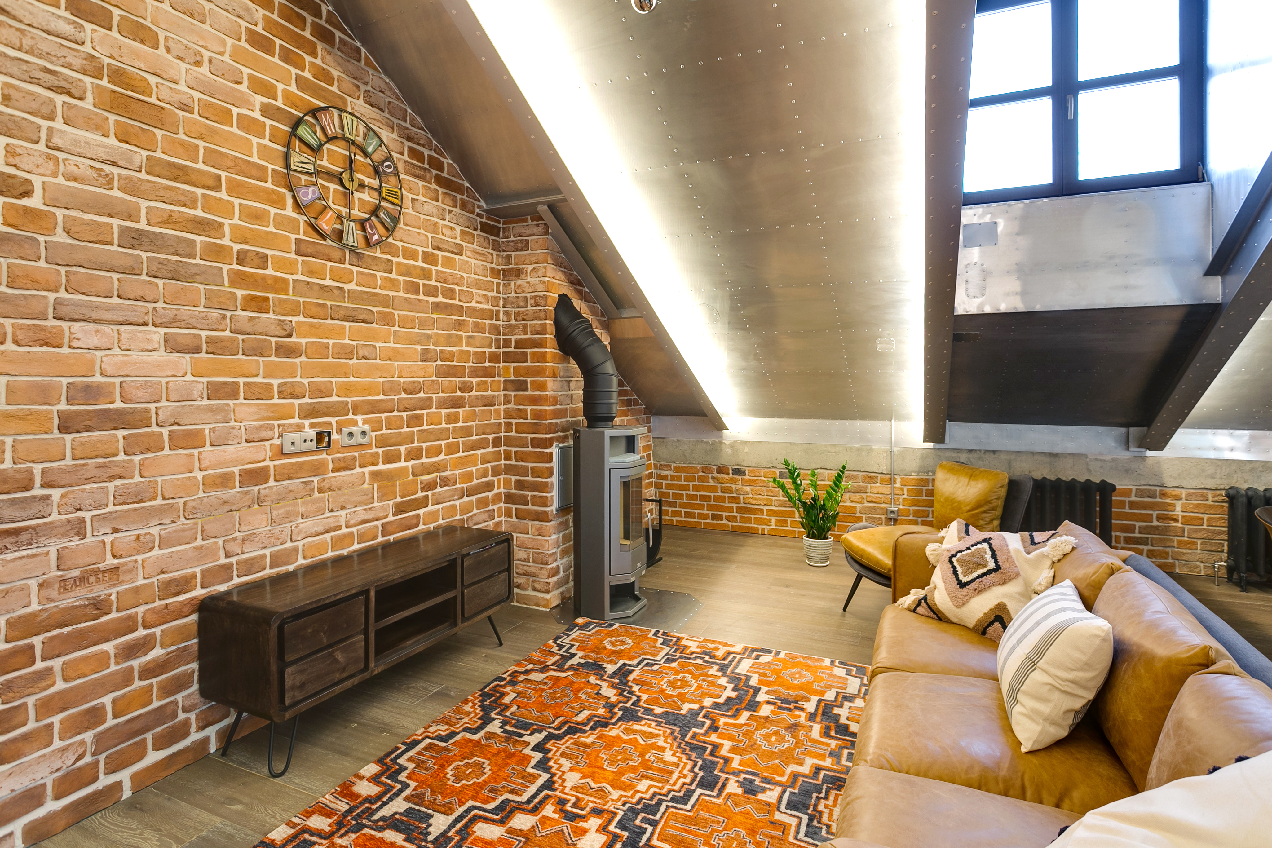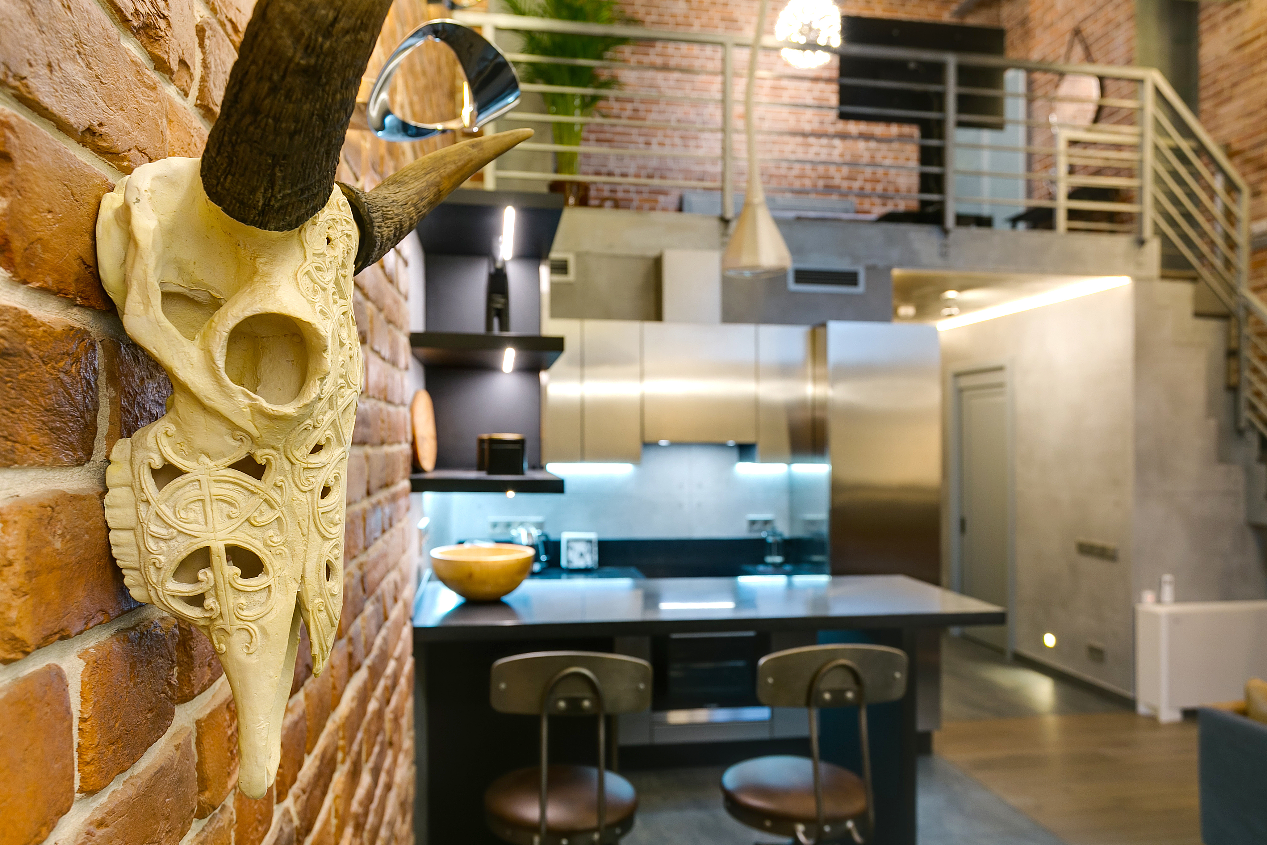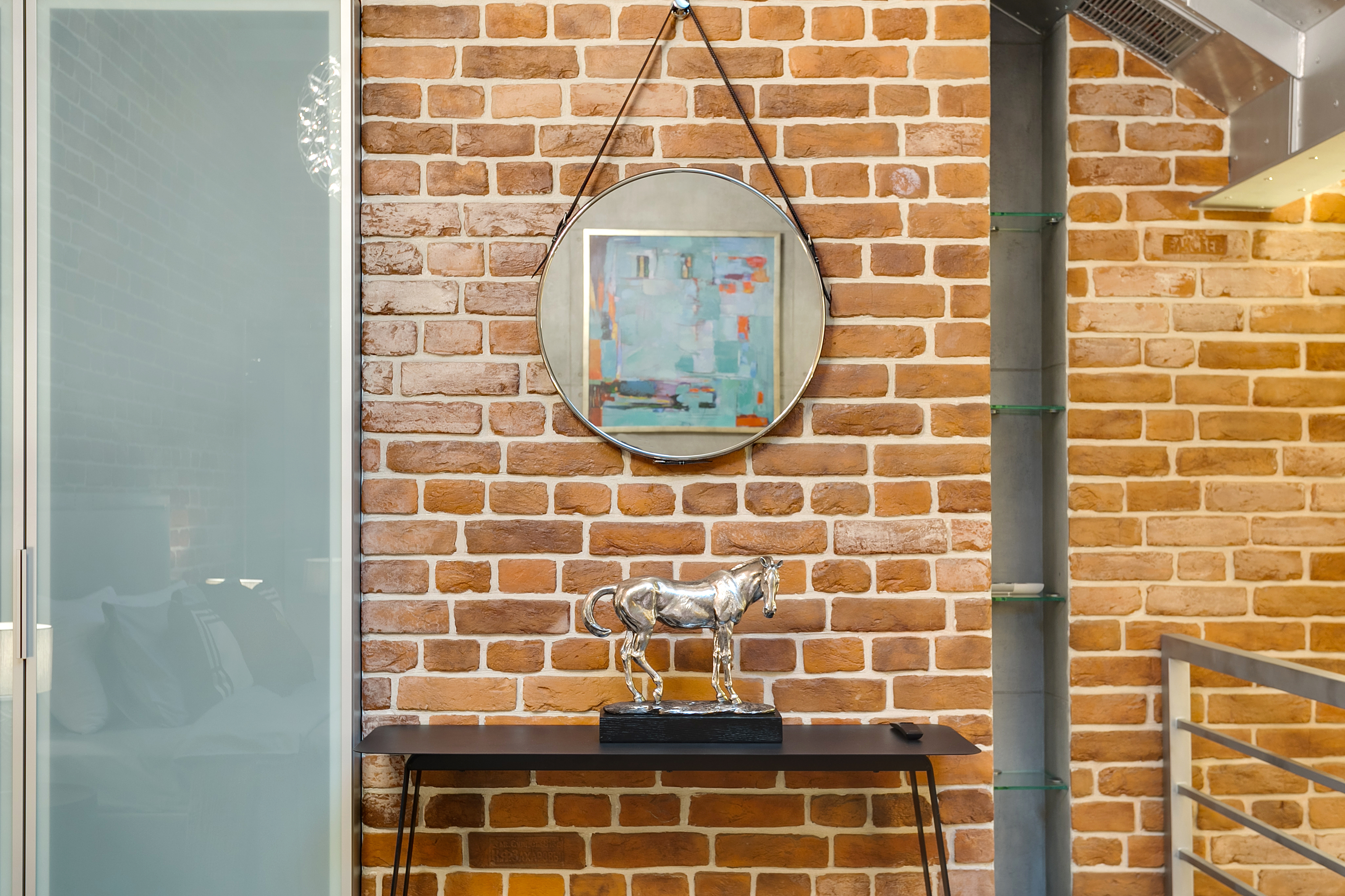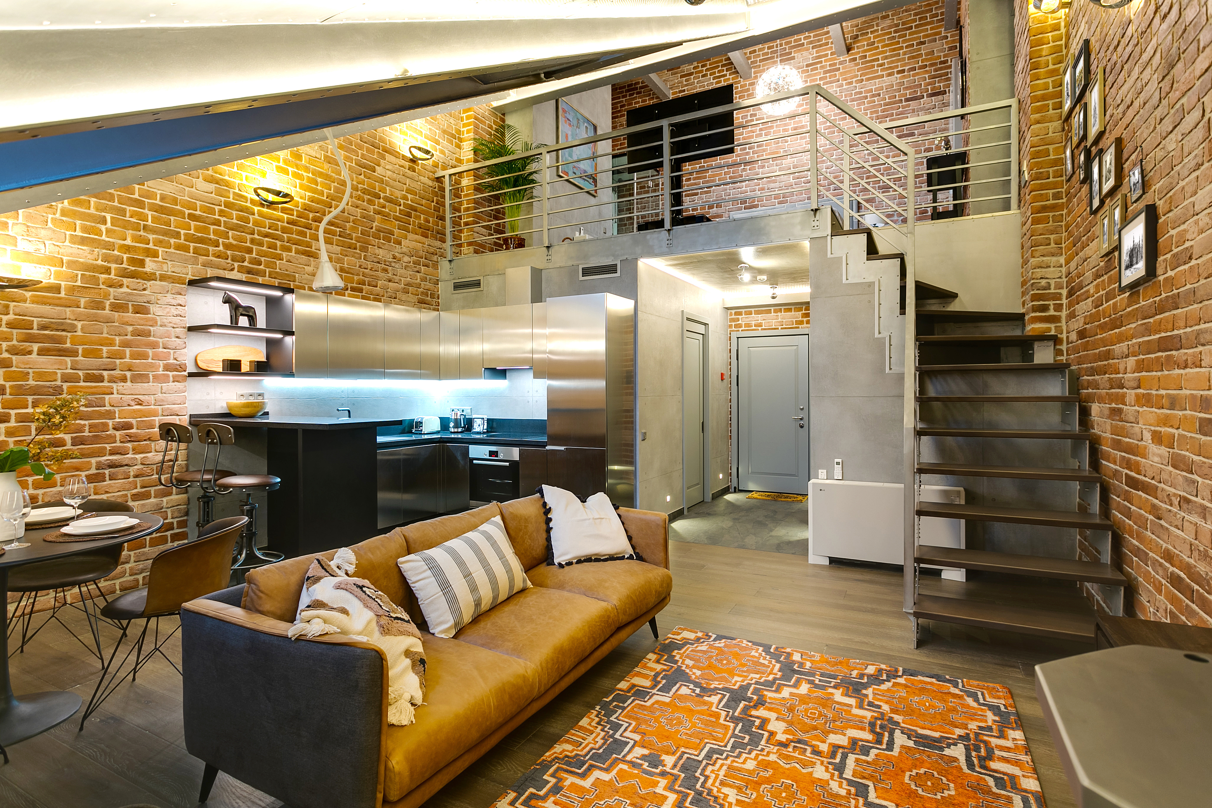 Современный двухуровневый лофт, стены из красного кирпича. Лаунж зона представляет собой совмещенную кухню гостиную со вторым светом.