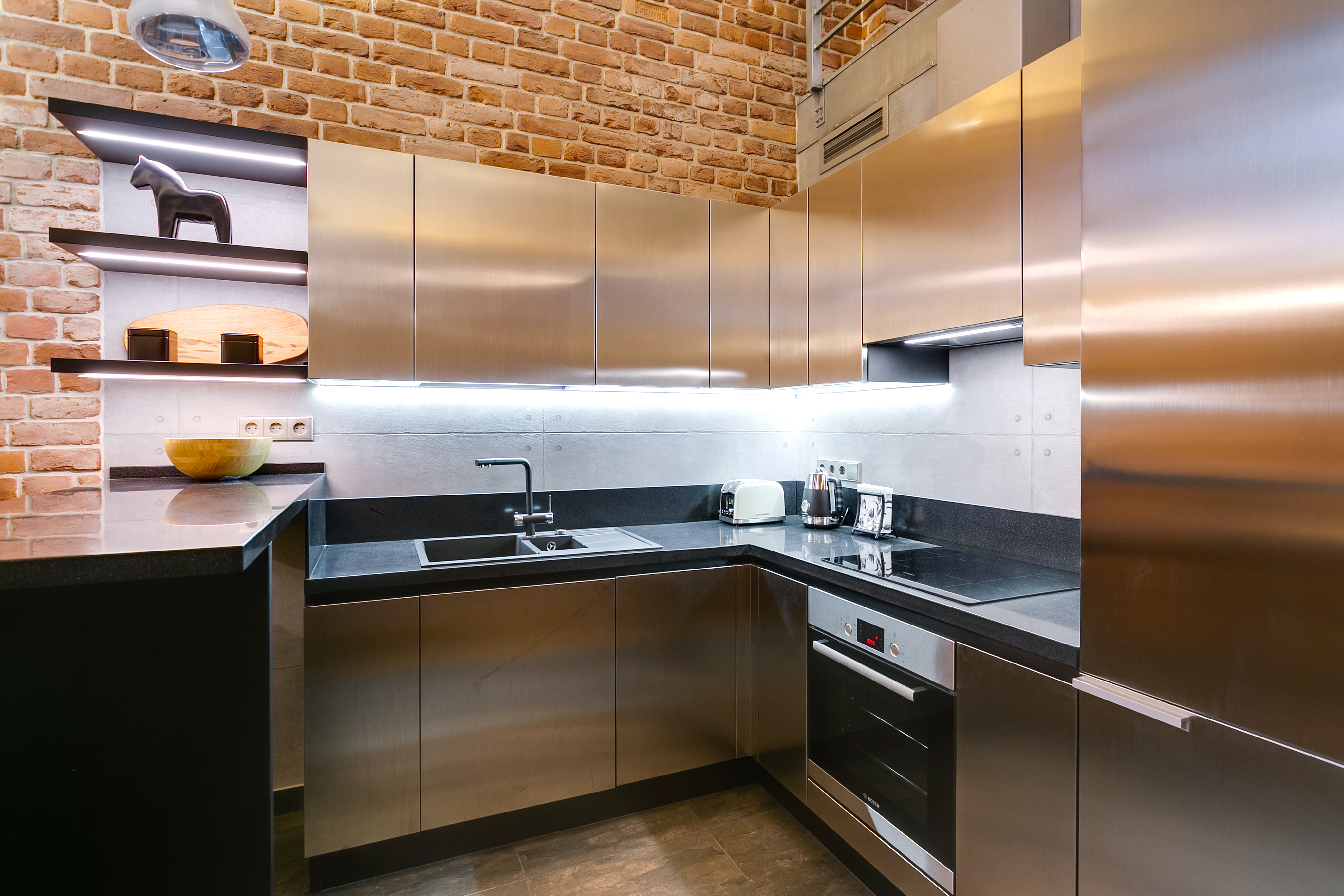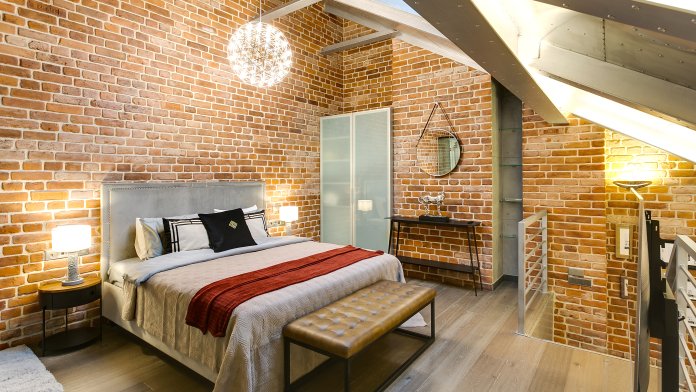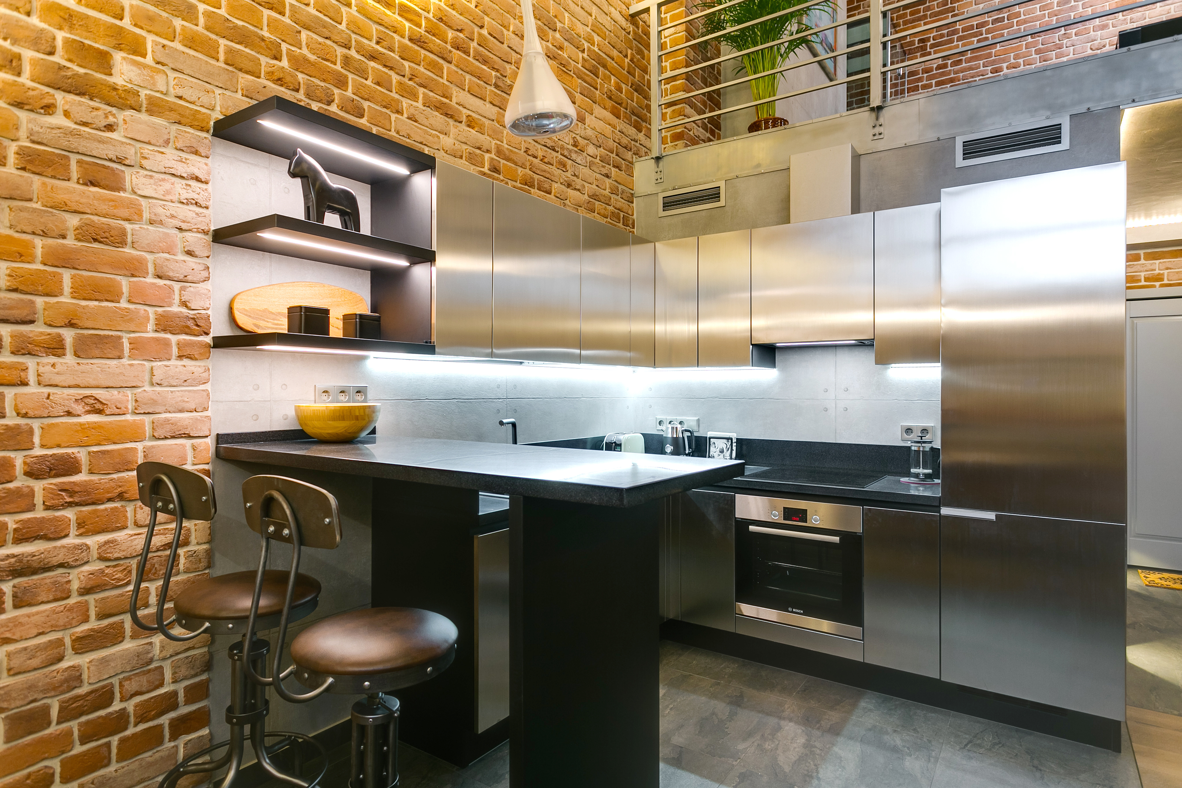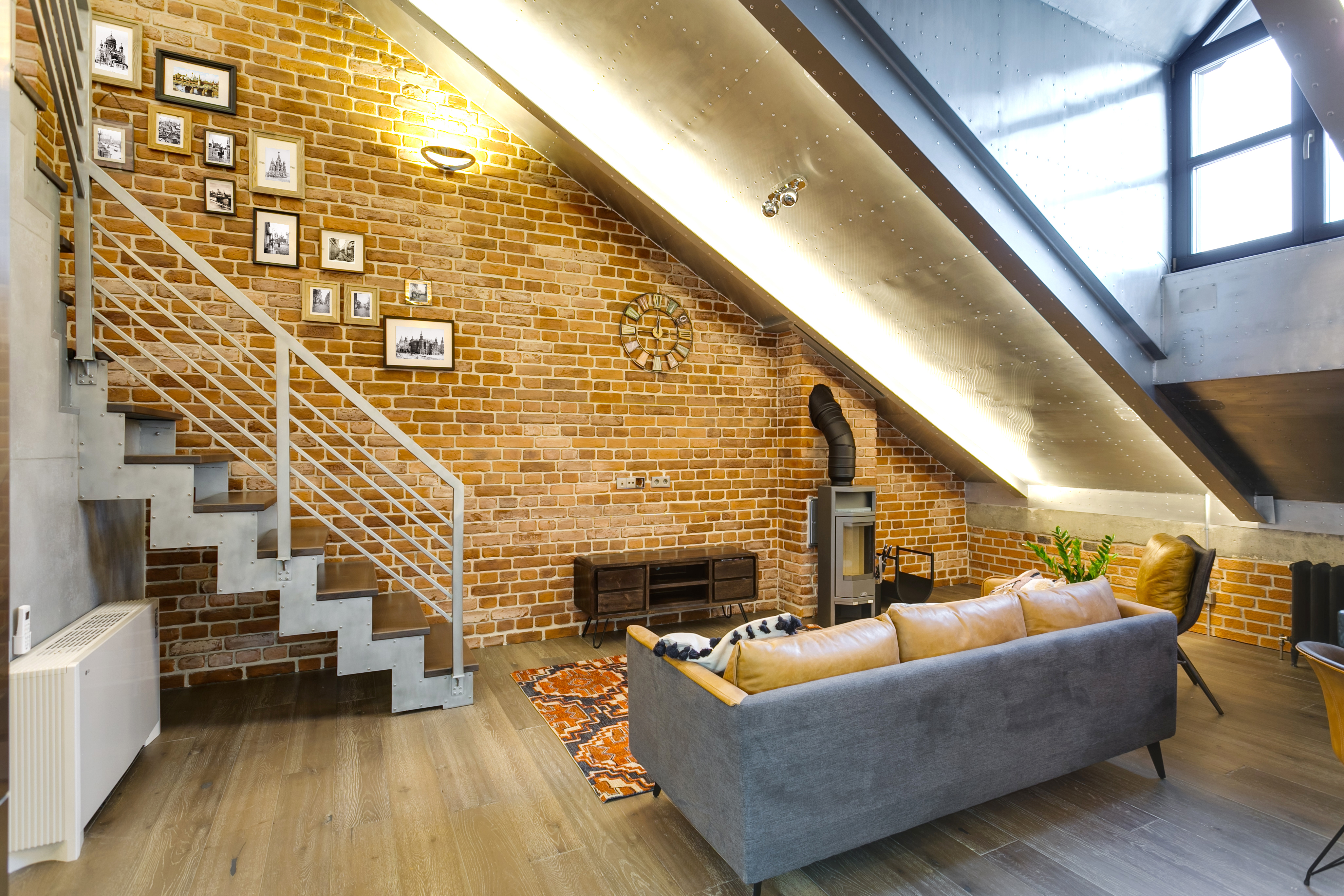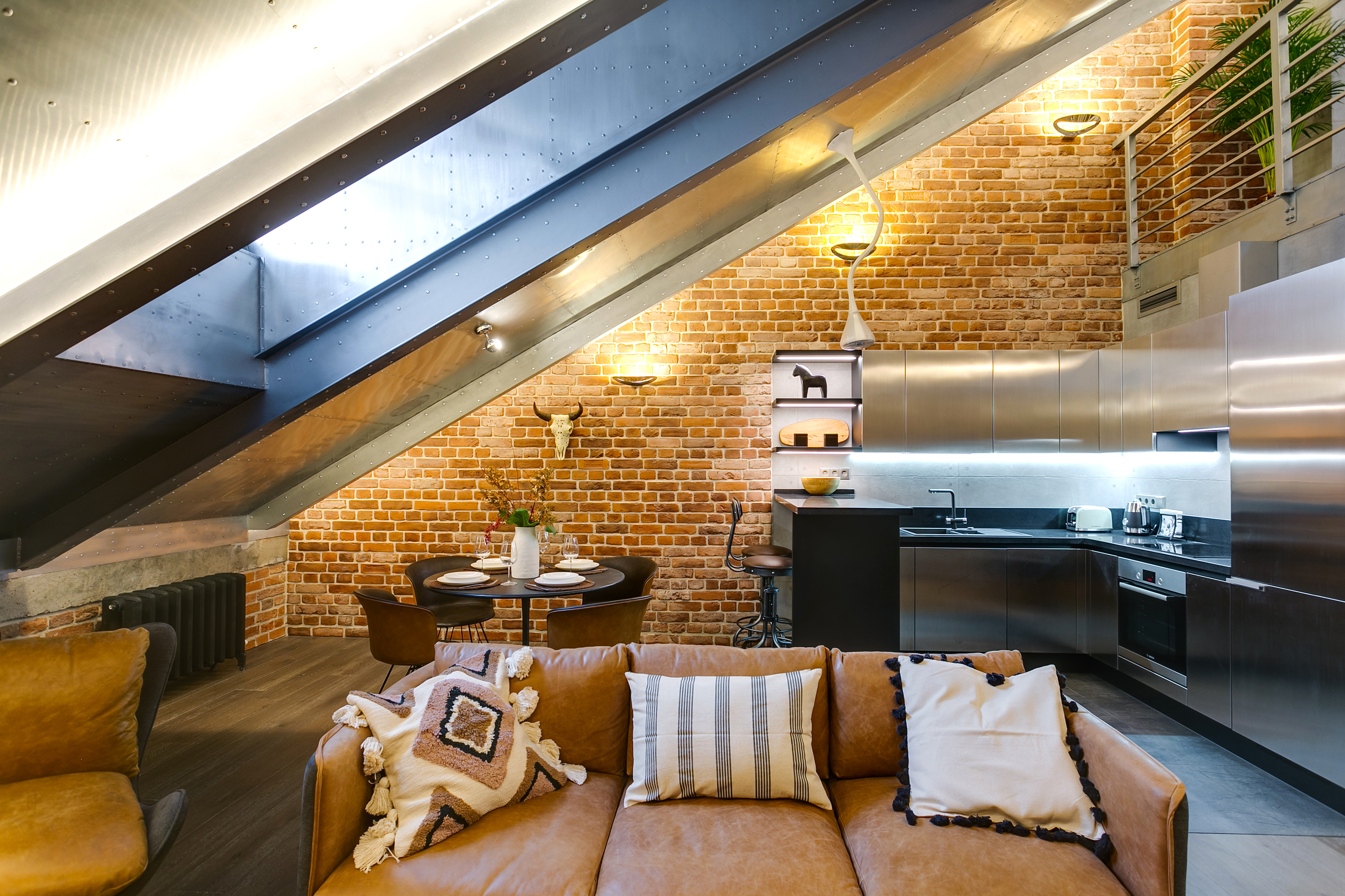 Современный двухуровневый лофт, стены из красного кирпича. Лаунж зона представляет собой совмещенную кухню гостиную со вторым светом.