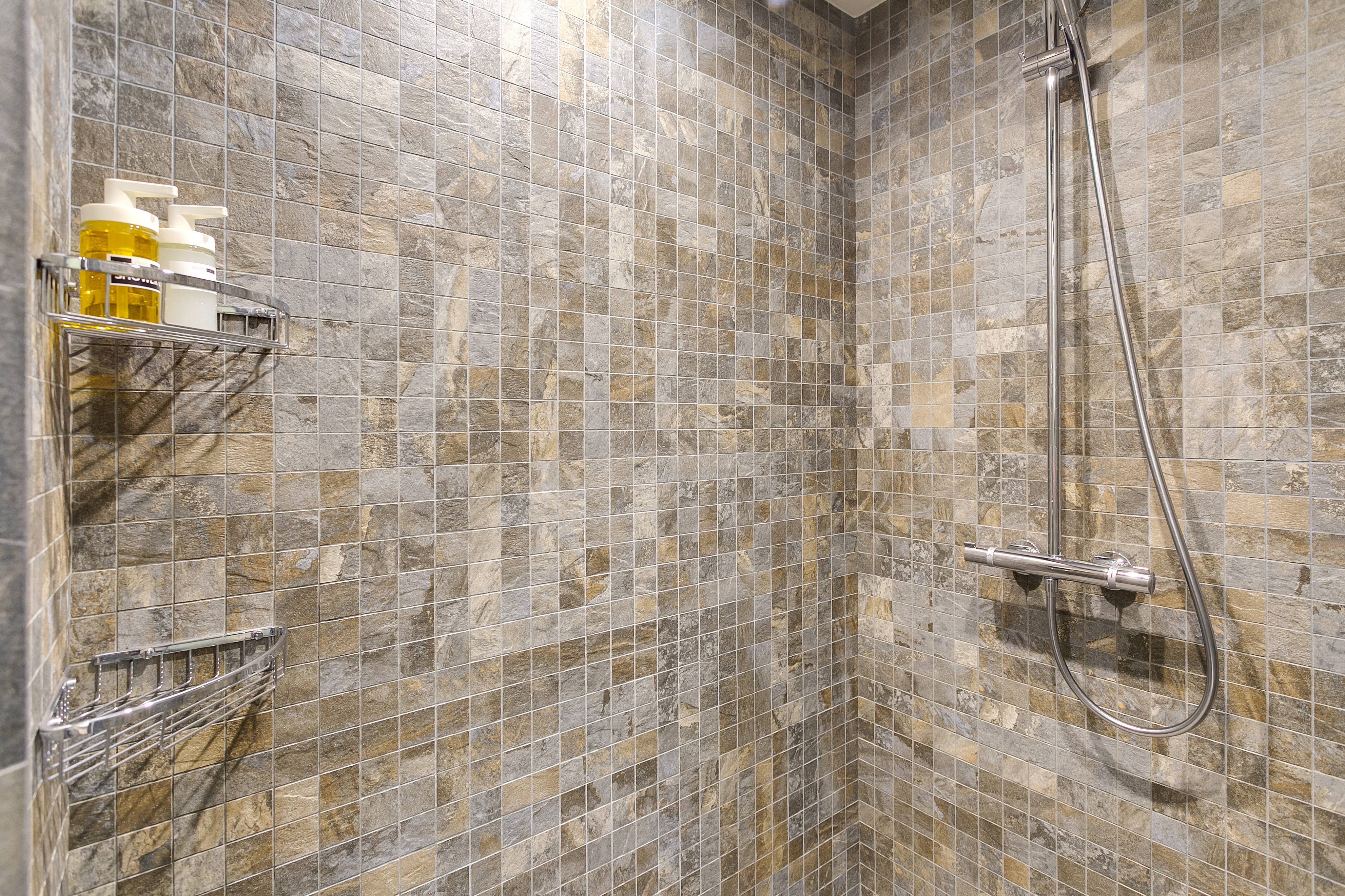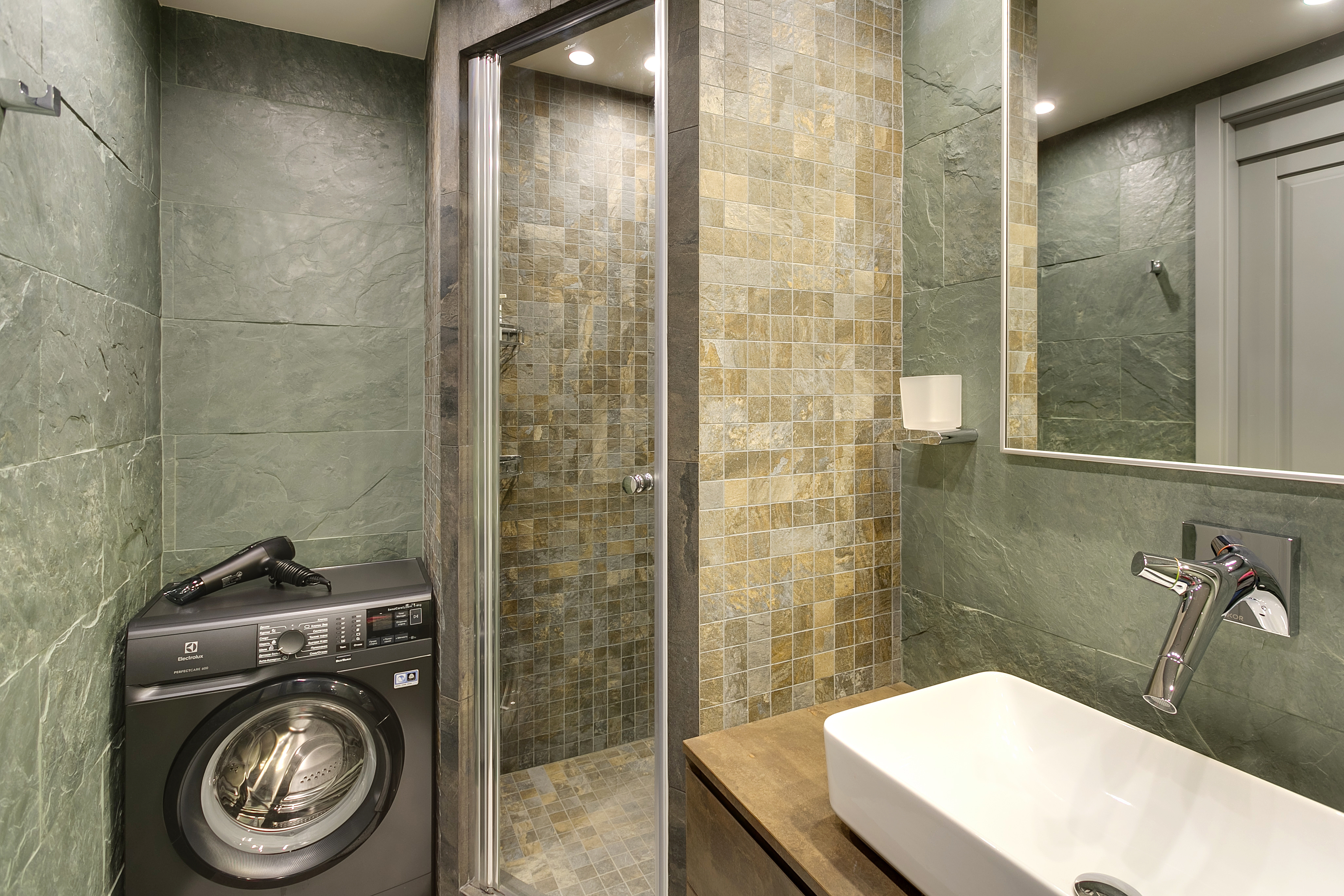 Отдельная ванная комната выполнена в богатых зеро-зеленых тонах, в ней есть все необходимое для водных процедур: душевая, стиральная машина и фен.