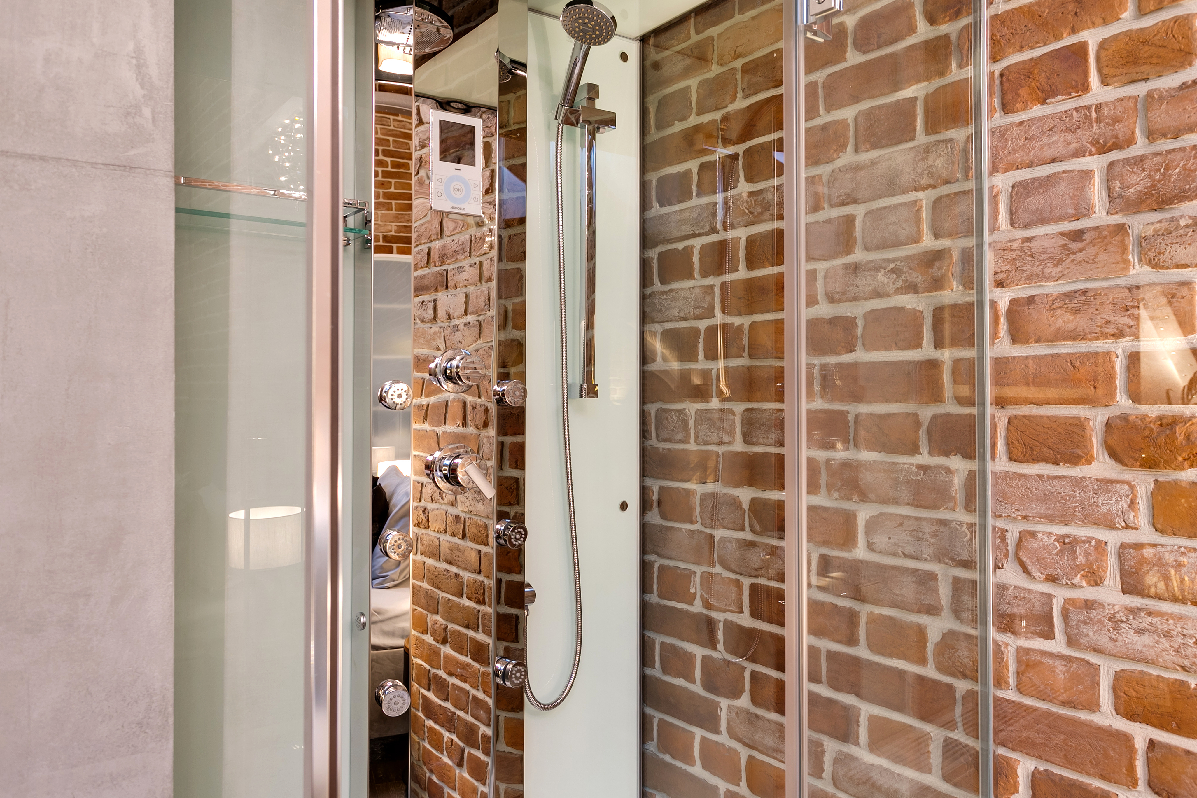Спальня находится на втором уровне , а ее особенностью стал не только изумительный дизайн, но и абсолютно прозрачная душевая кабина.