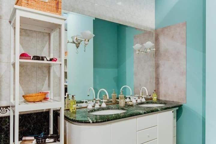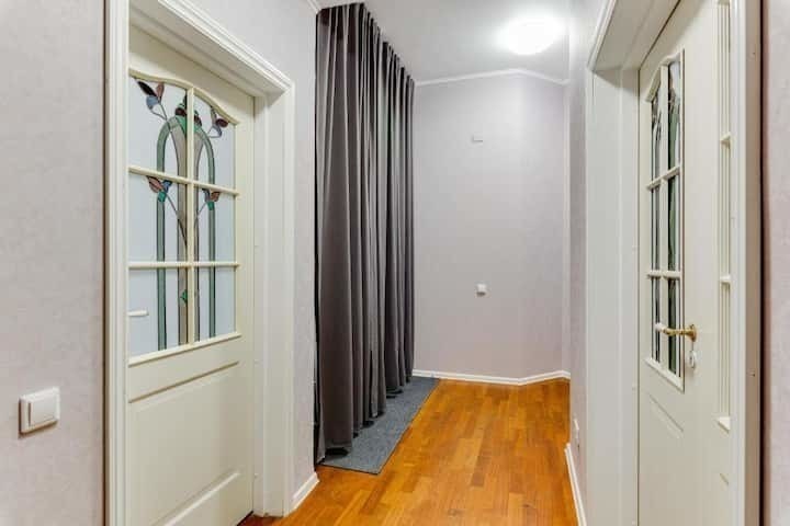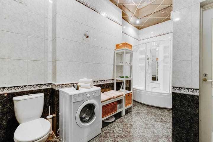 В просторной ванной комнате всегда будут мягкие полотенца и ароматные гели для душа. Вам не нужно тратиться на химчистку в квартире есть все необходимое для стирки: стиральная машина, сушилка, утюг и гладильная доска. Задержитесь подольше в квартире достаточно места, чтобы разместить ваши личные вещи.