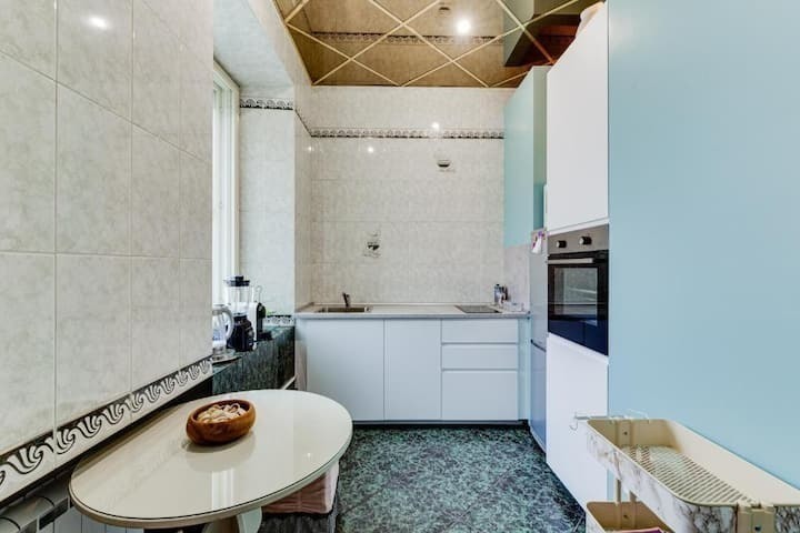 На кухне есть все самое необходимое для приготовления любимых блюд: плита, холодильник, духовка, блендер, чайник, кофеварка и набор посуды.