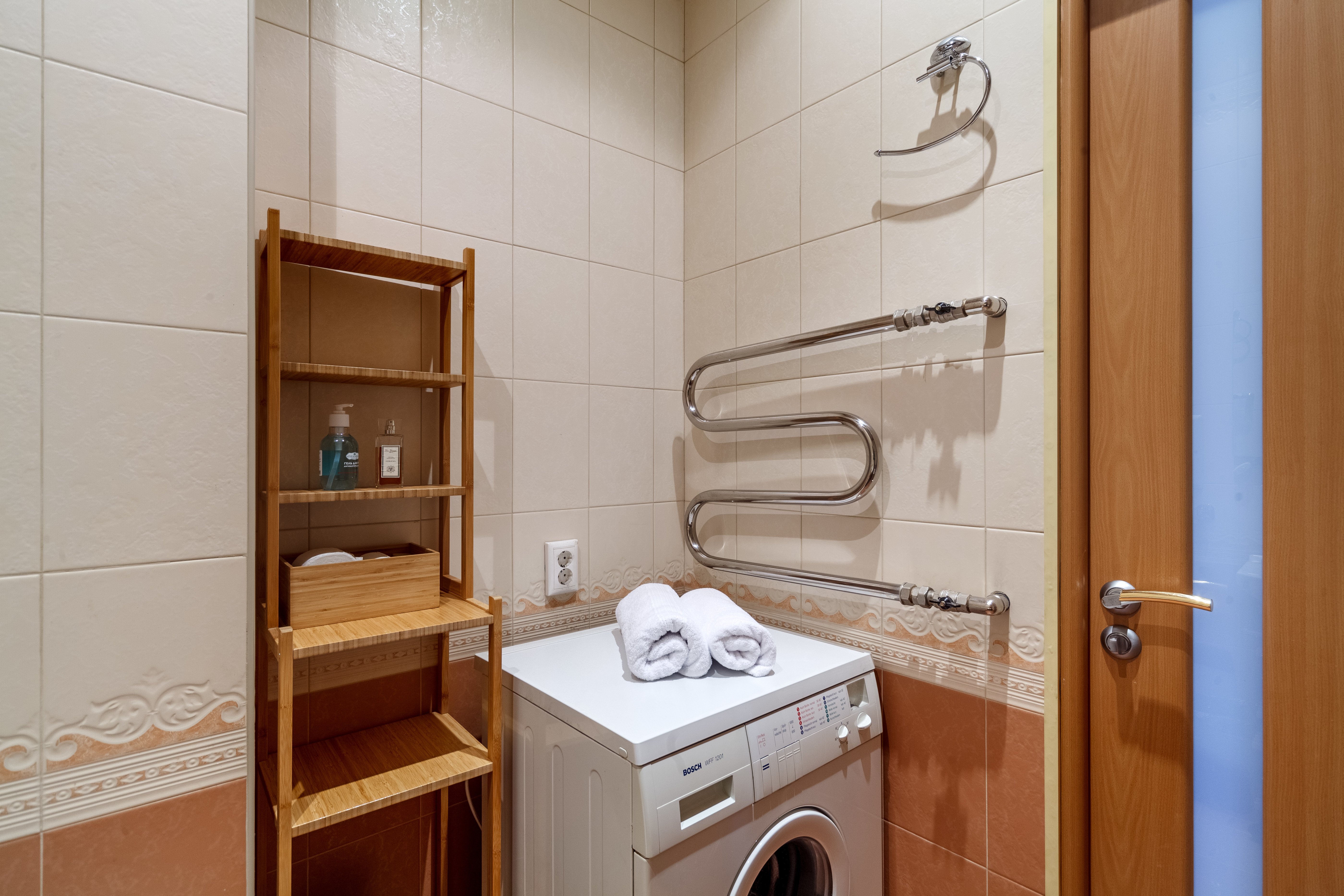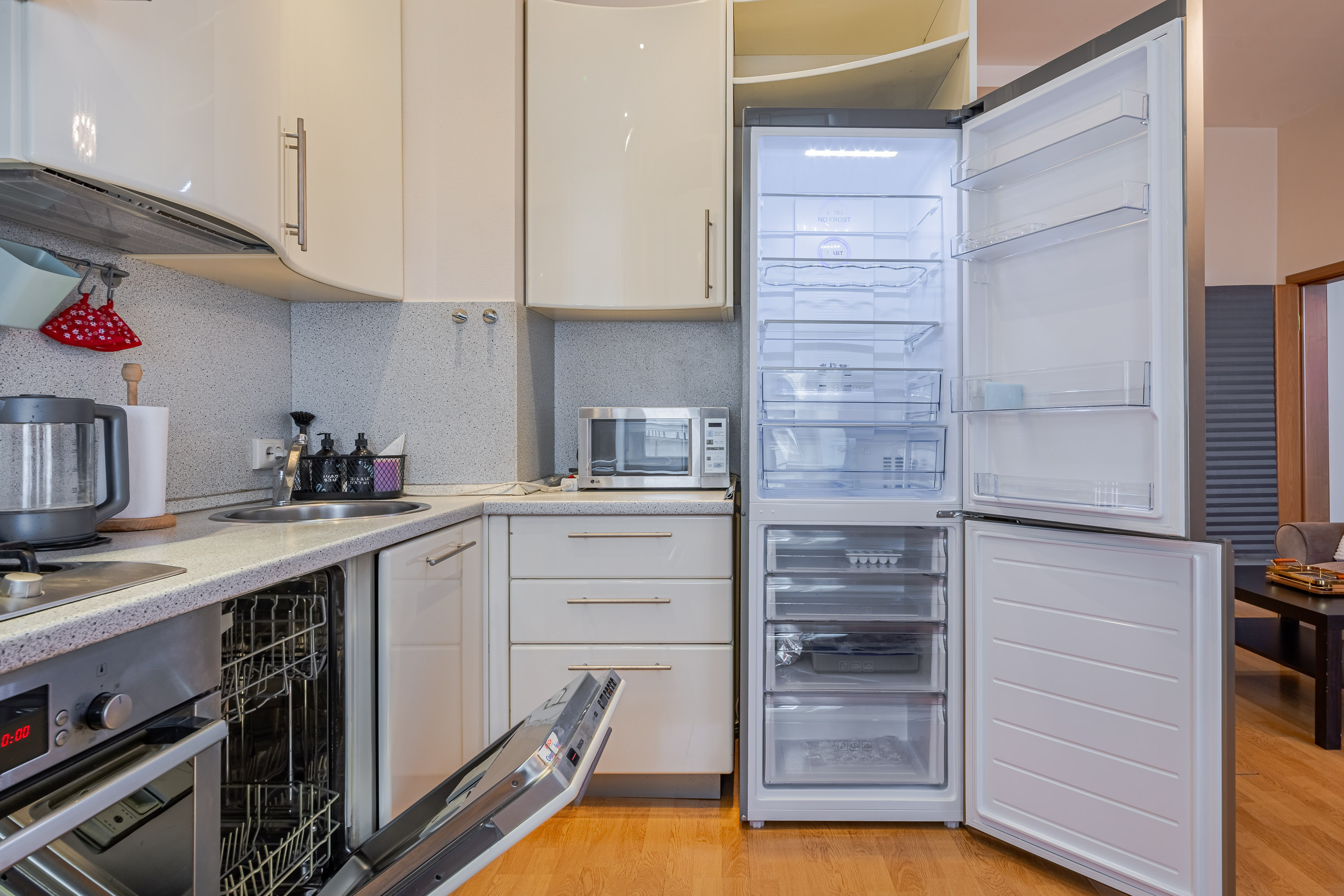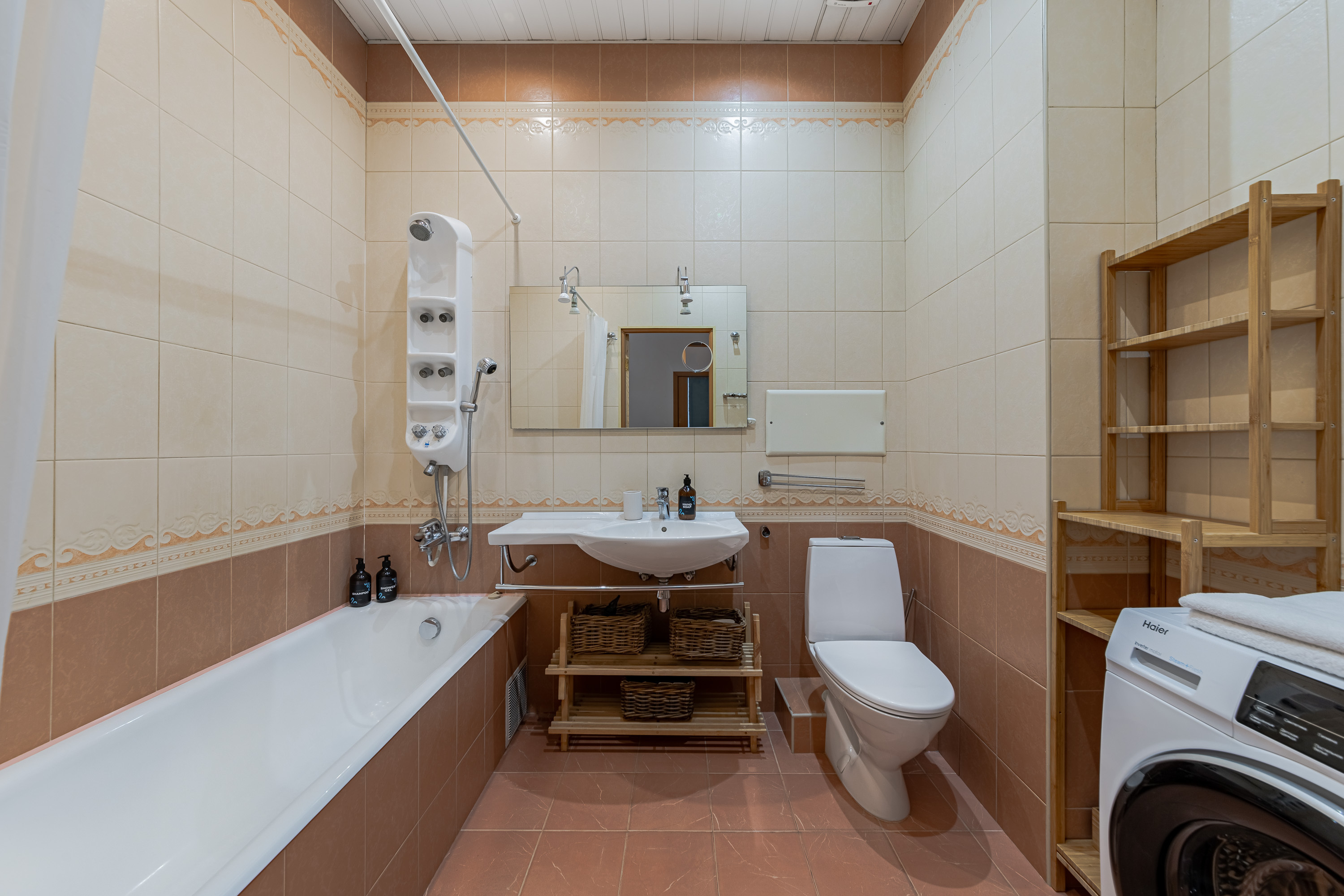 Кухня полностью укомплектована всем необходимым: холодильником, плитой, чайником, посудомоечной машиной, духовкой, кофемашиной и набором посуды. Вы всегда сможете приготовить свои любимые блюда. А в просторной ванной комнате всегда будут мягкие полотенца и ароматные гели для душа.