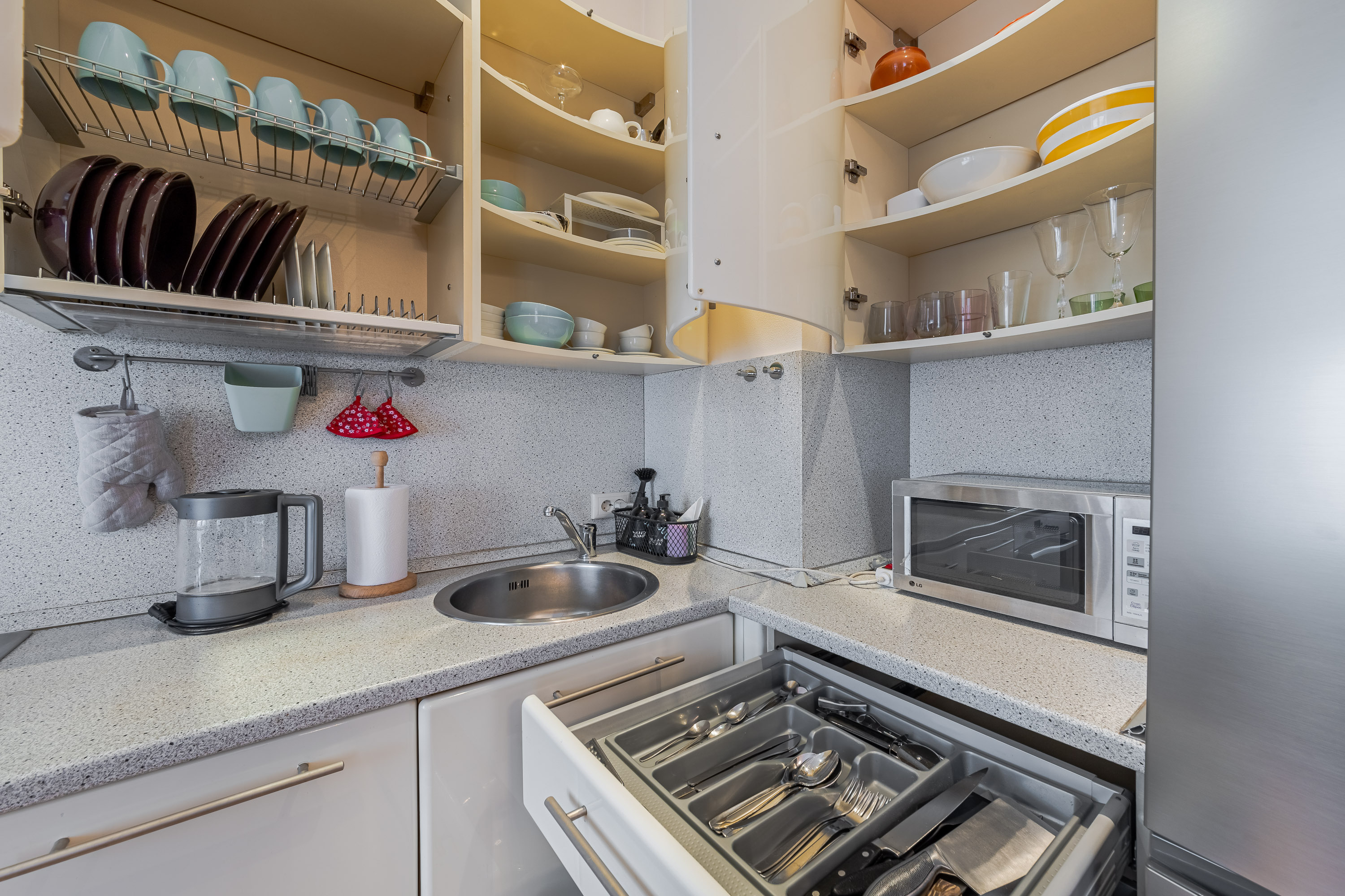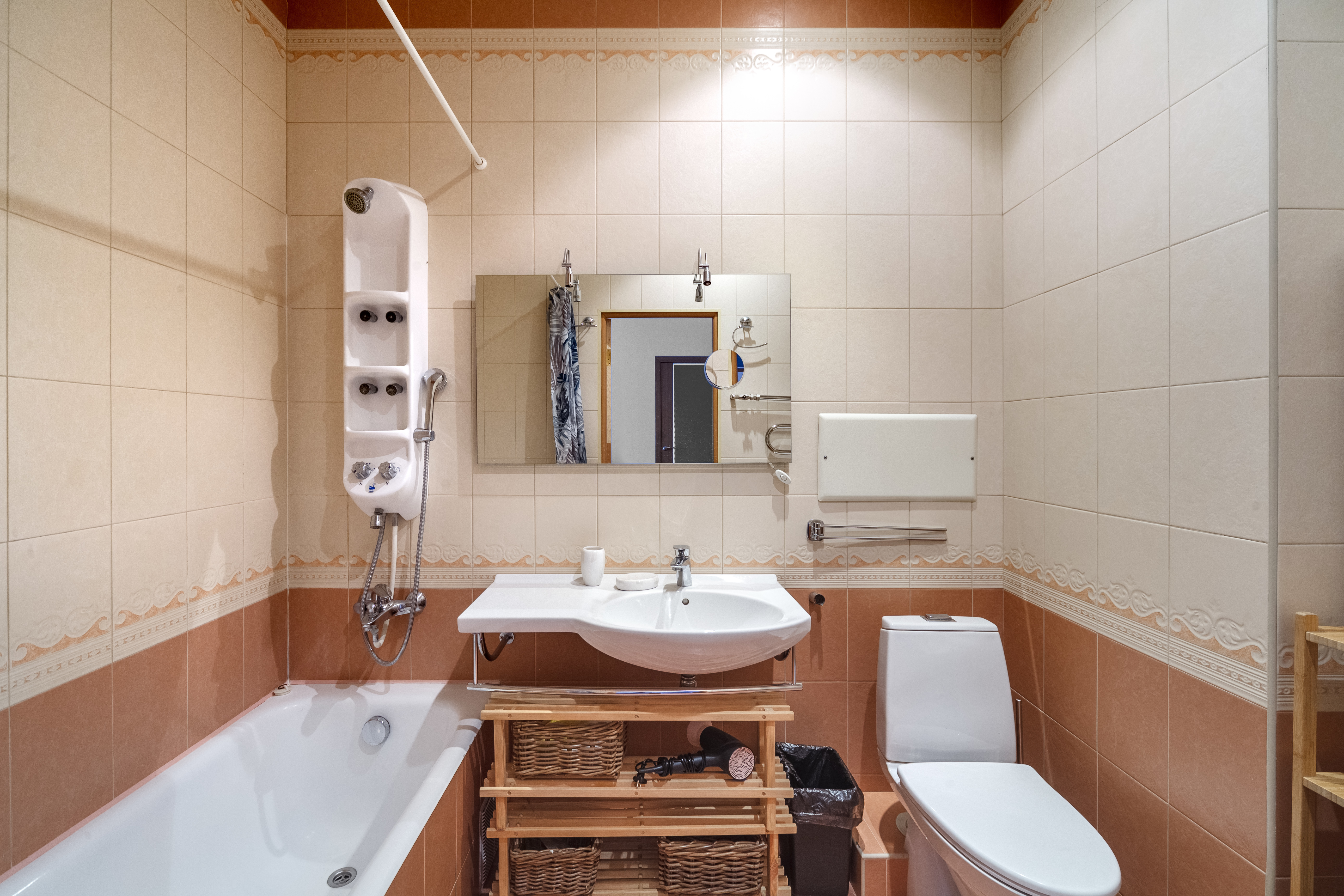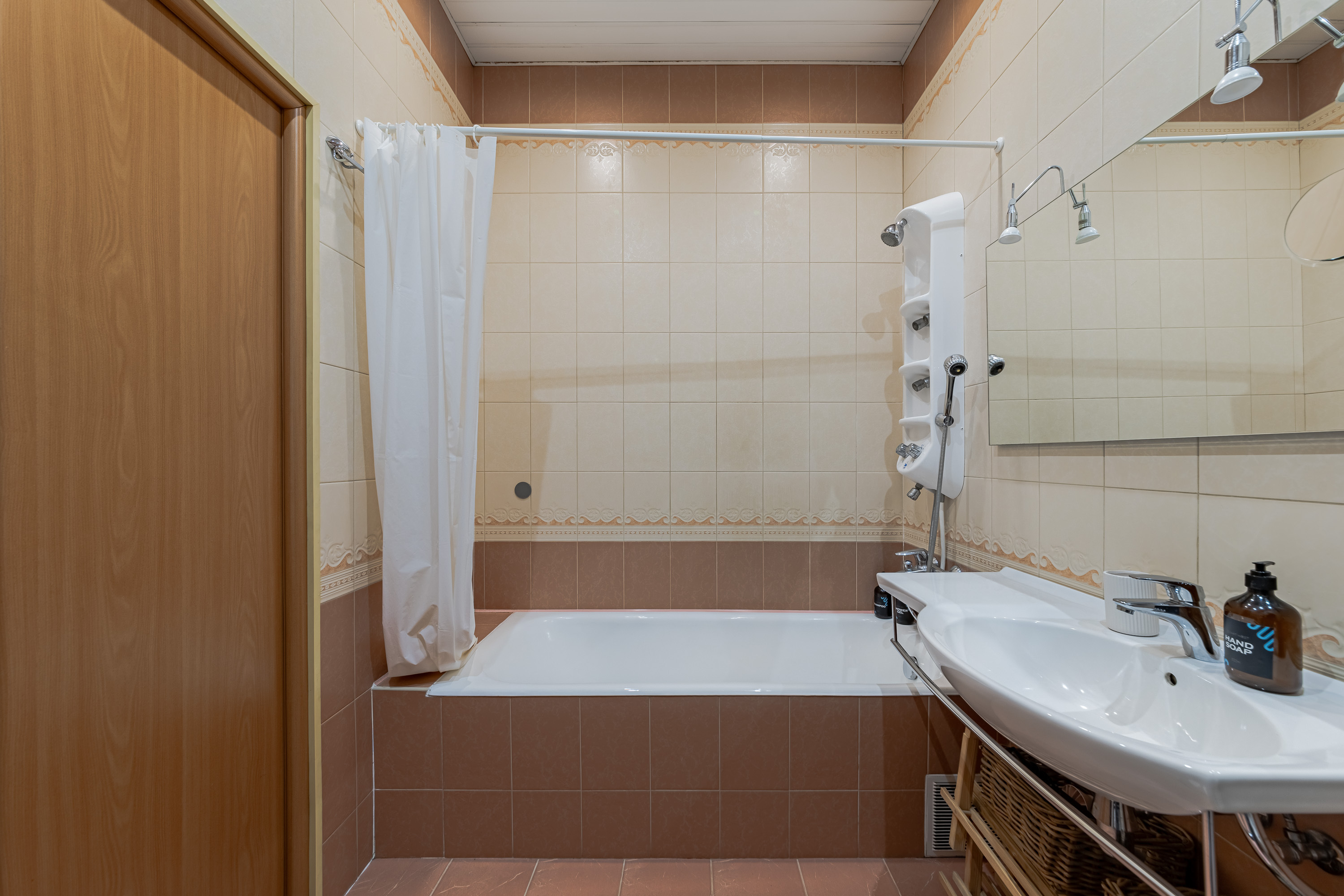 Кухня полностью укомплектована всем необходимым: холодильником, плитой, чайником, посудомоечной машиной, духовкой, кофемашиной и набором посуды. Вы всегда сможете приготовить свои любимые блюда. А в просторной ванной комнате всегда будут мягкие полотенца и ароматные гели для душа.
