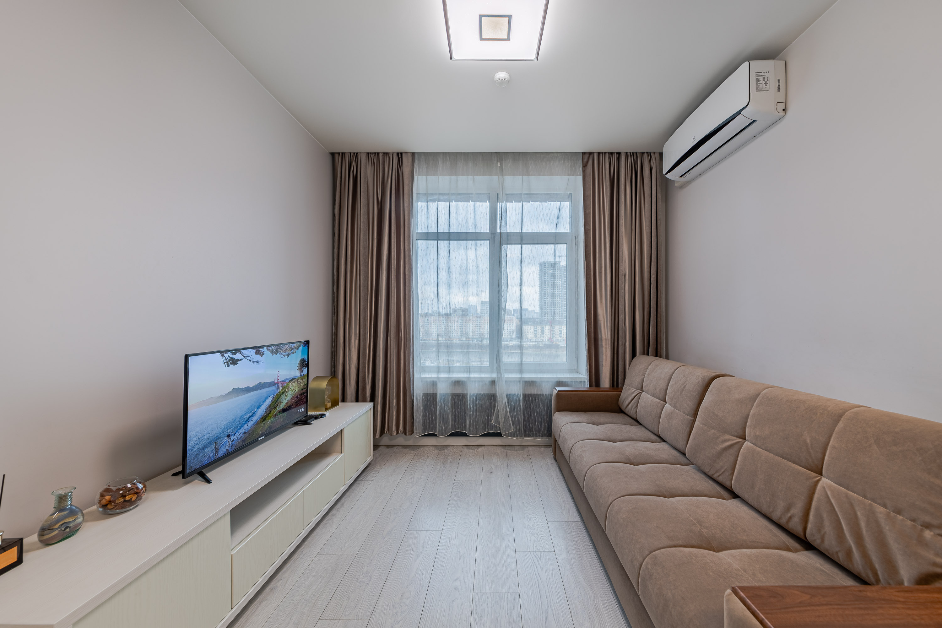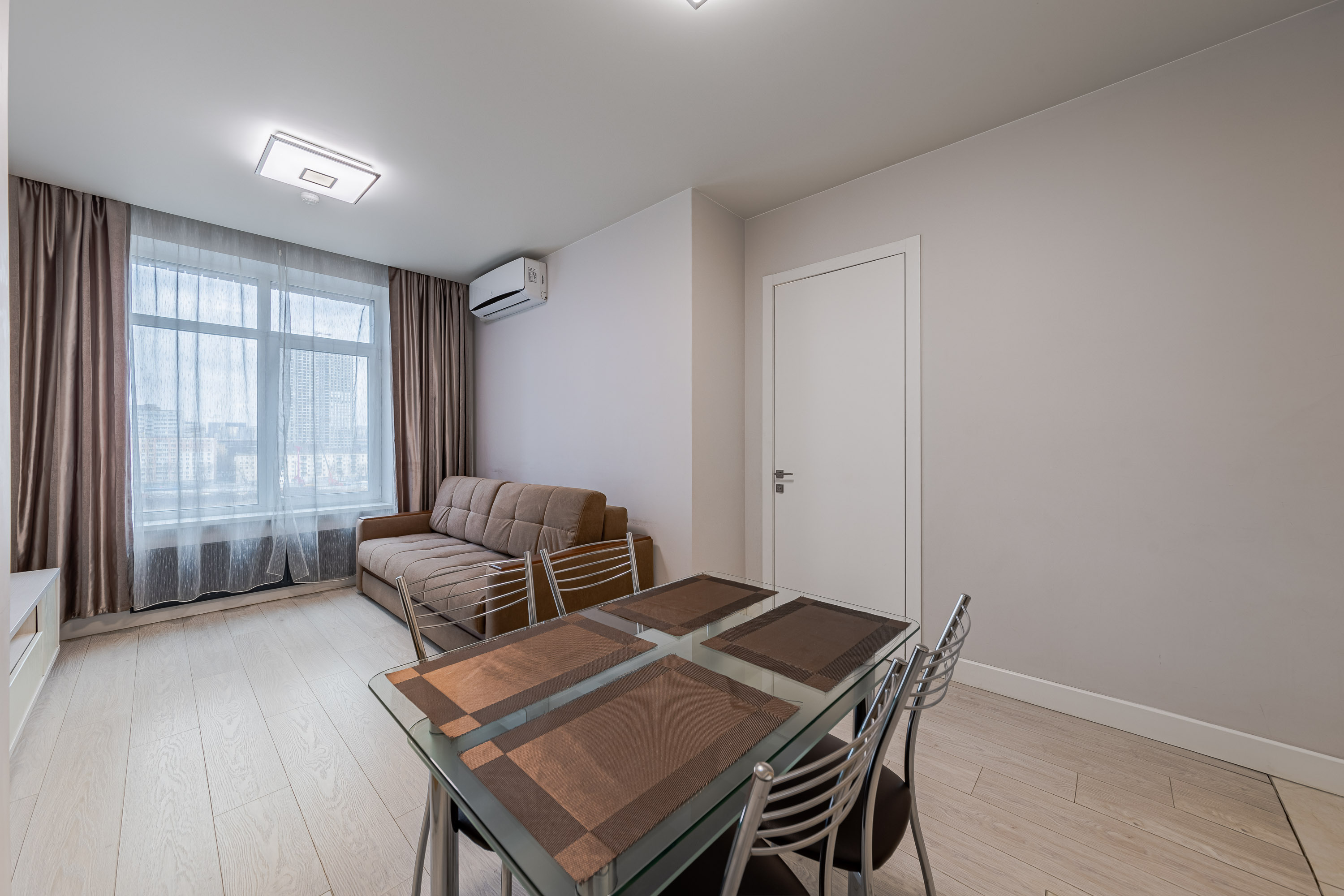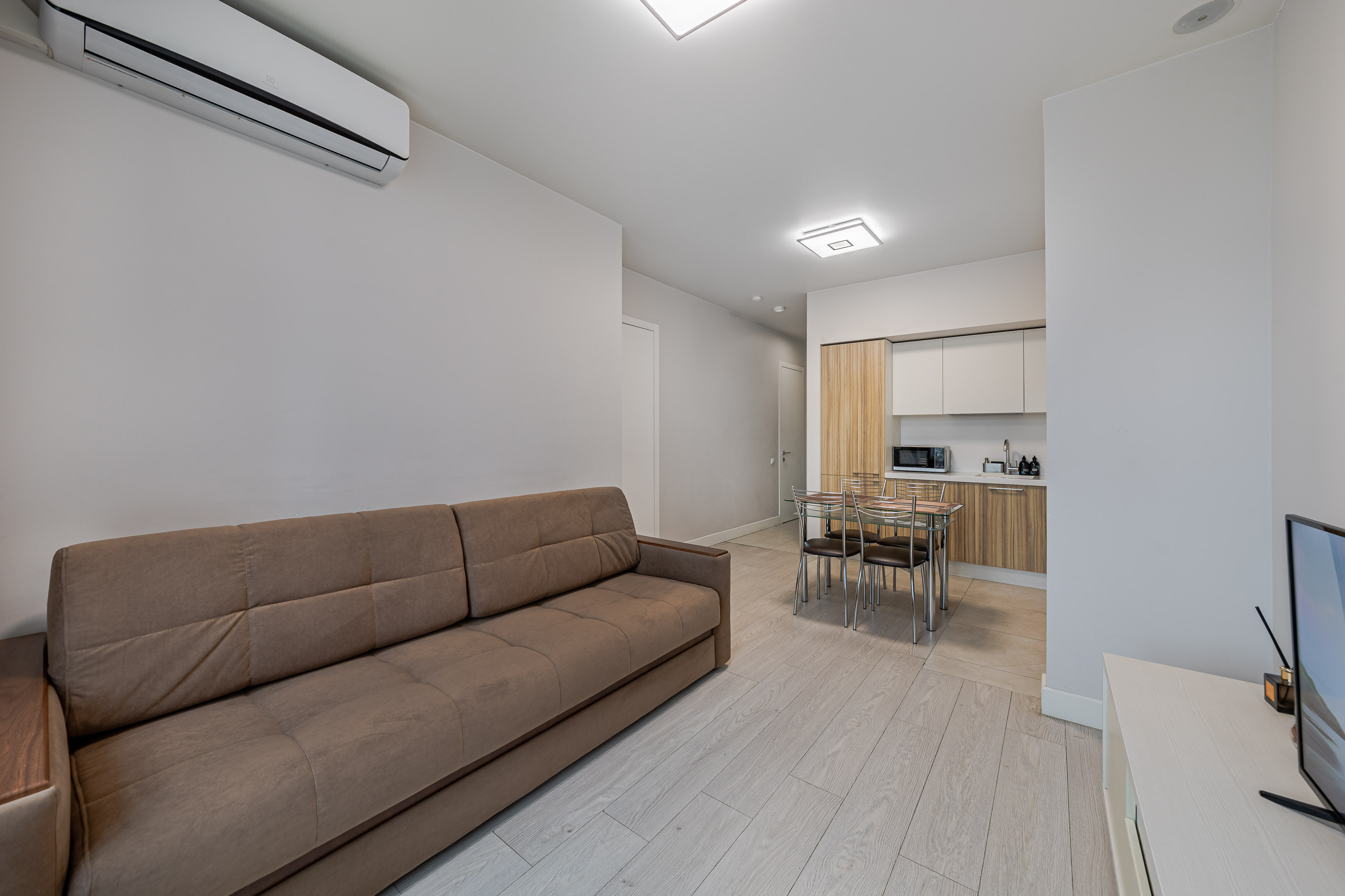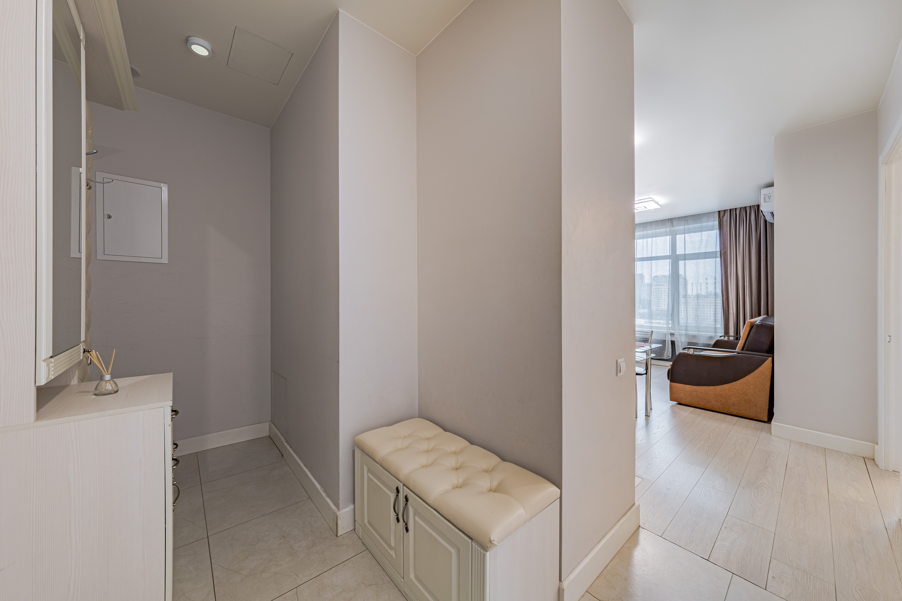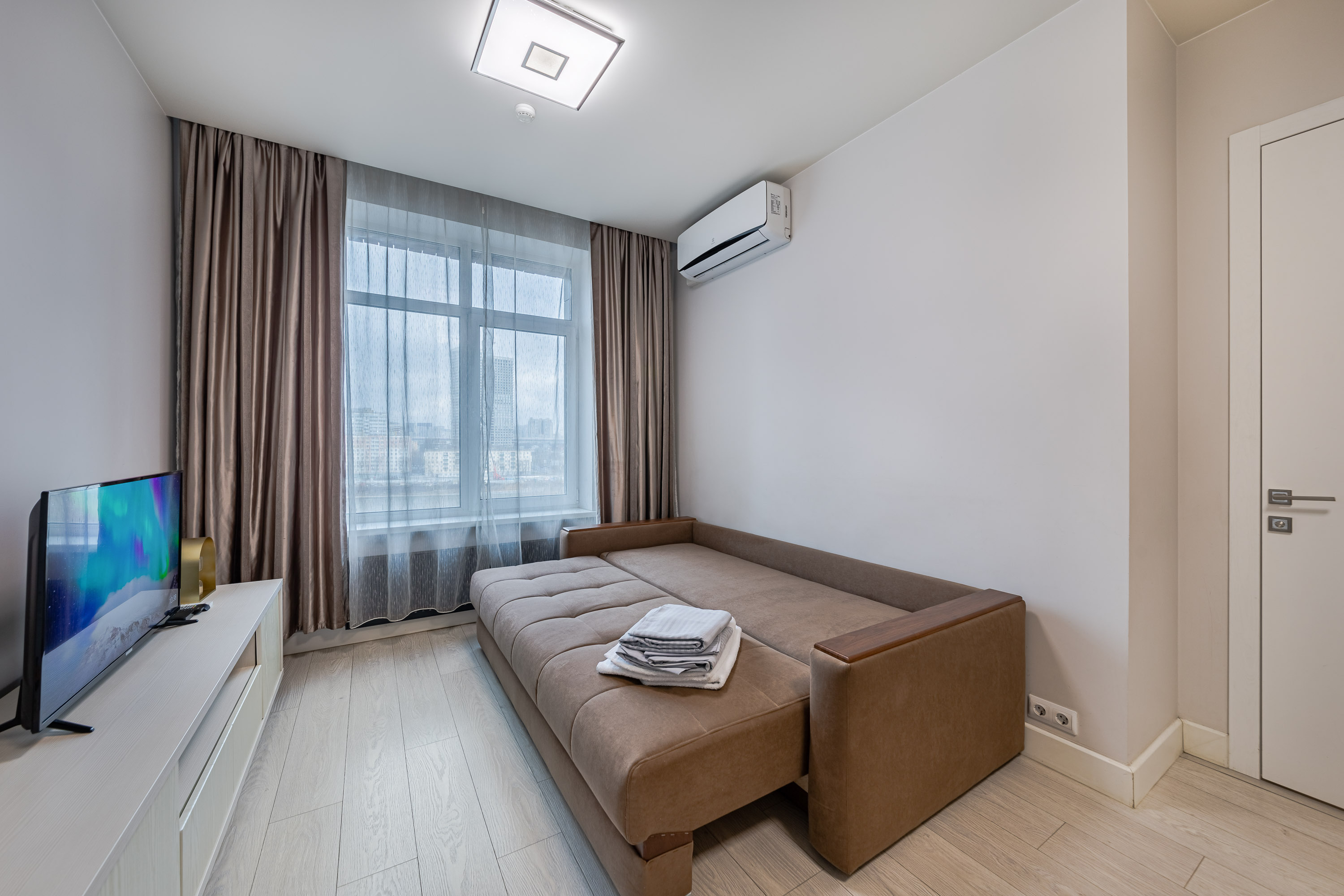 Квартира оформлена в современном стиле, в светлых бежевых оттенках. Она полностью укомплектована мебелью и бытовой техникой, в ней с комфортом могут разместиться 4 гостя.