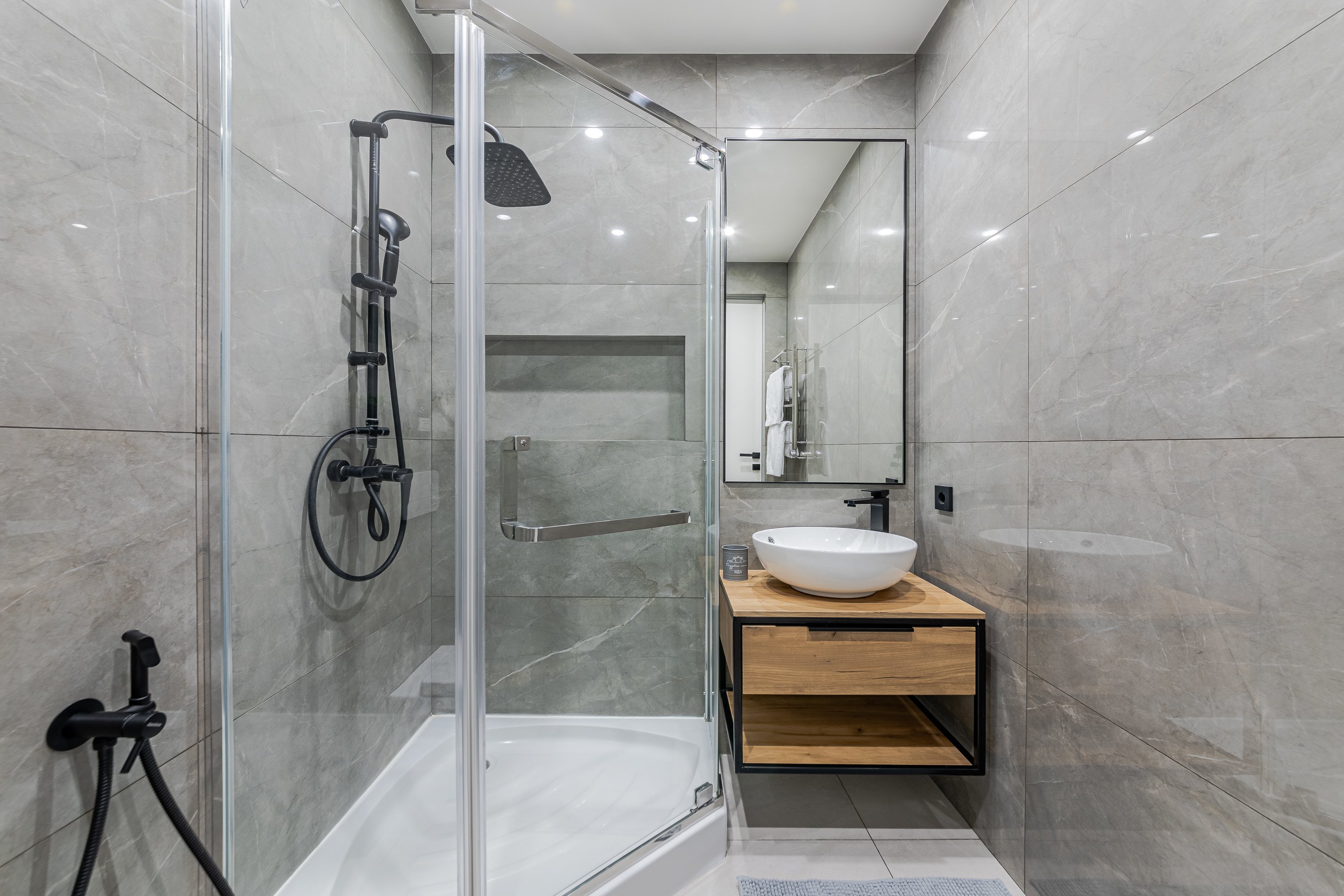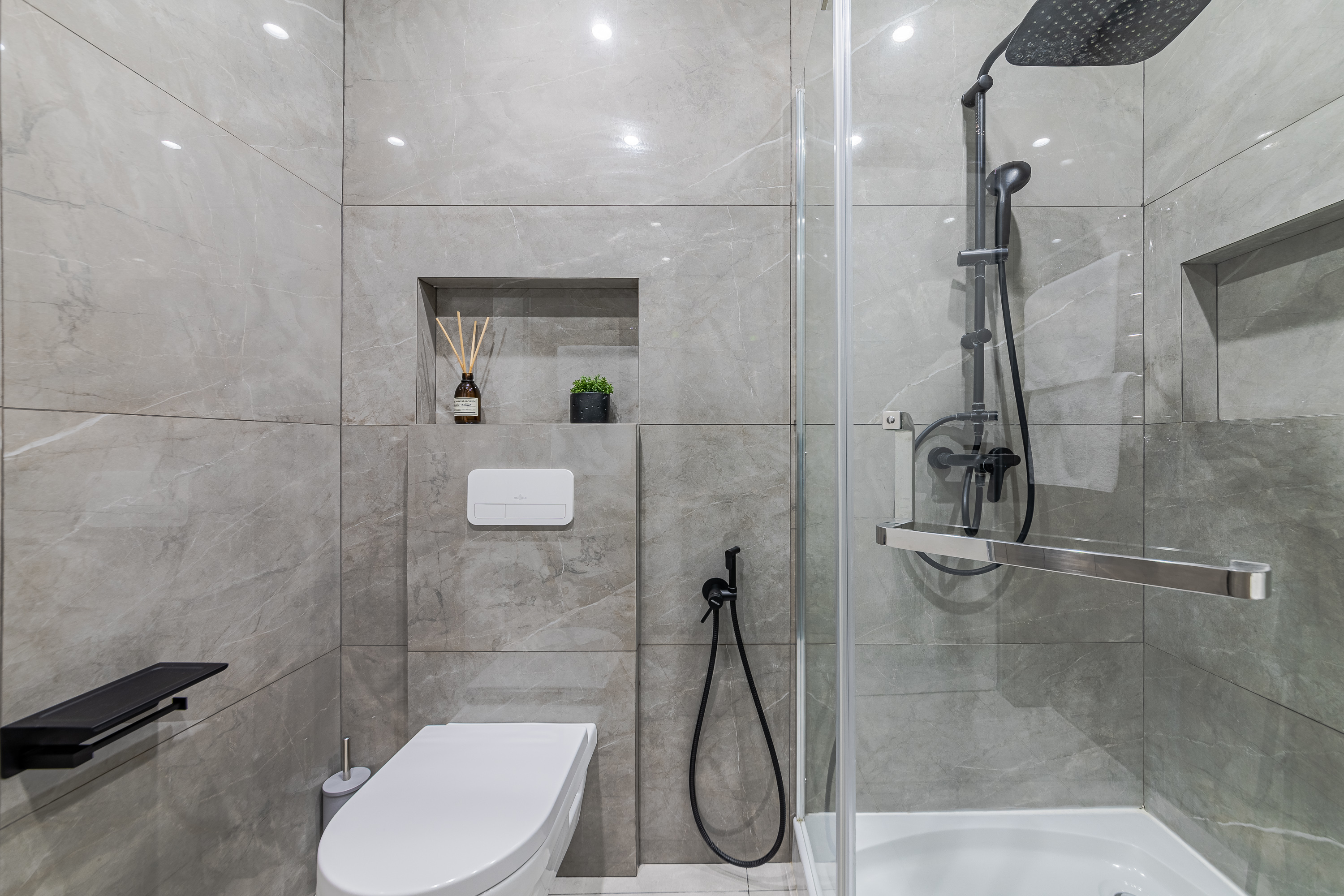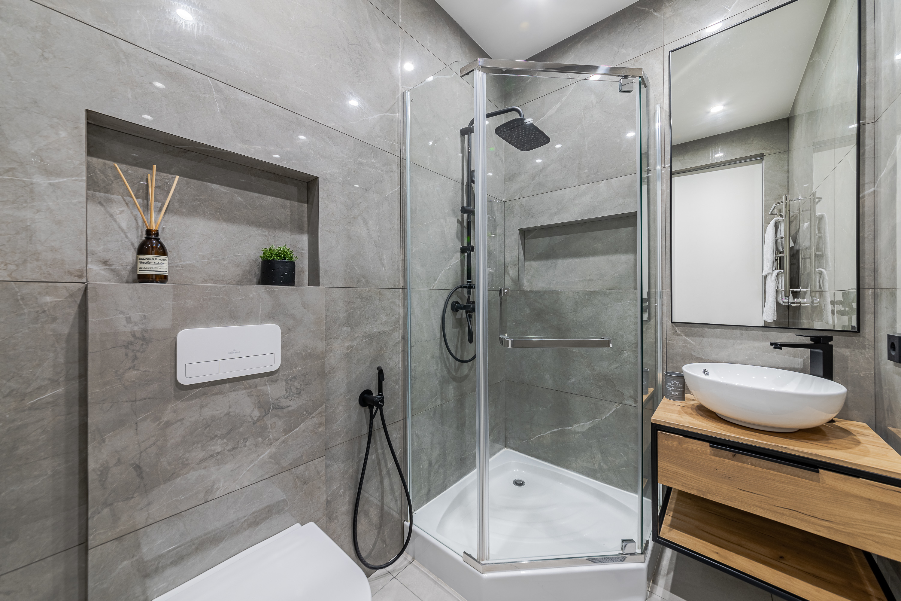 Ванная комната оформлена стильно и очень современно, в ней находятся удобная и просторная душевая кабина, стиральная машина, полотенца и косметические (мыло, шампунь, гель для душа) принадлежности, которые предоставляются каждому гостю.