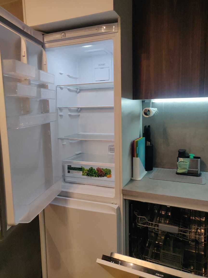 Кухонная зона: электрическая плита, духовой шкаф, посудомоечная машина, вытяжка, холодильник, микроволновая печь, электрический чайник, блендер, фильтр для воды, барная стойка, стулья, столовые и кухонные приборы и посуда.
