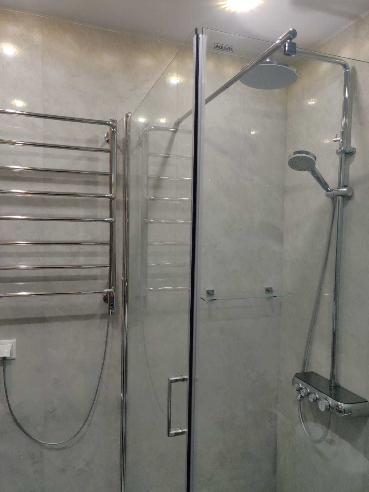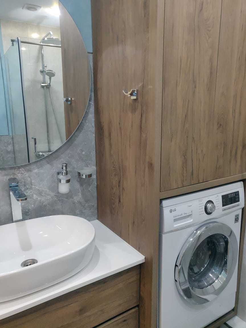 Ванная комната: раковина с зеркалом, унитаз, душ, стиральная машина, полотенцесушитель, фен.