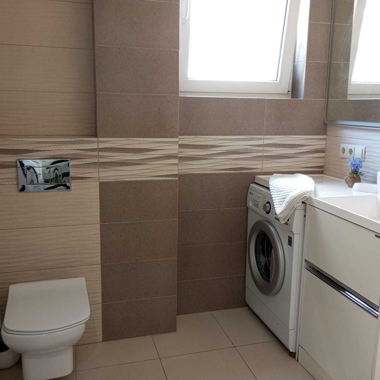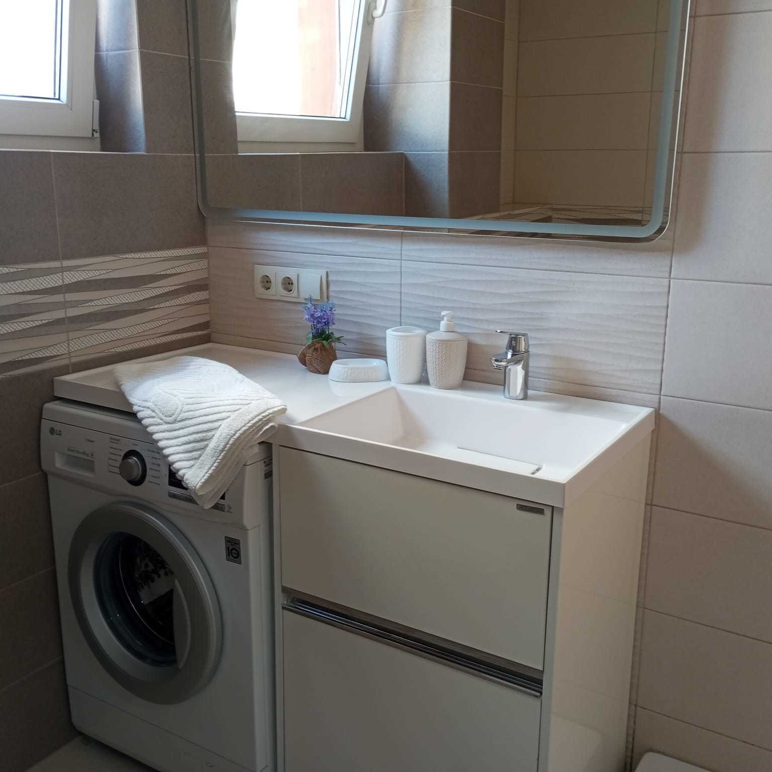Ванная комната: раковина с зеркалом, унитаз, душ, стиральная машина, полотенцесушитель, сушилка для белья, фен.
