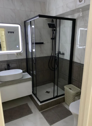 Ванная комната: раковина с зеркалом, унитаз, душ, стиральная машина, полотенцесушитель, сушилка для белья, фен.