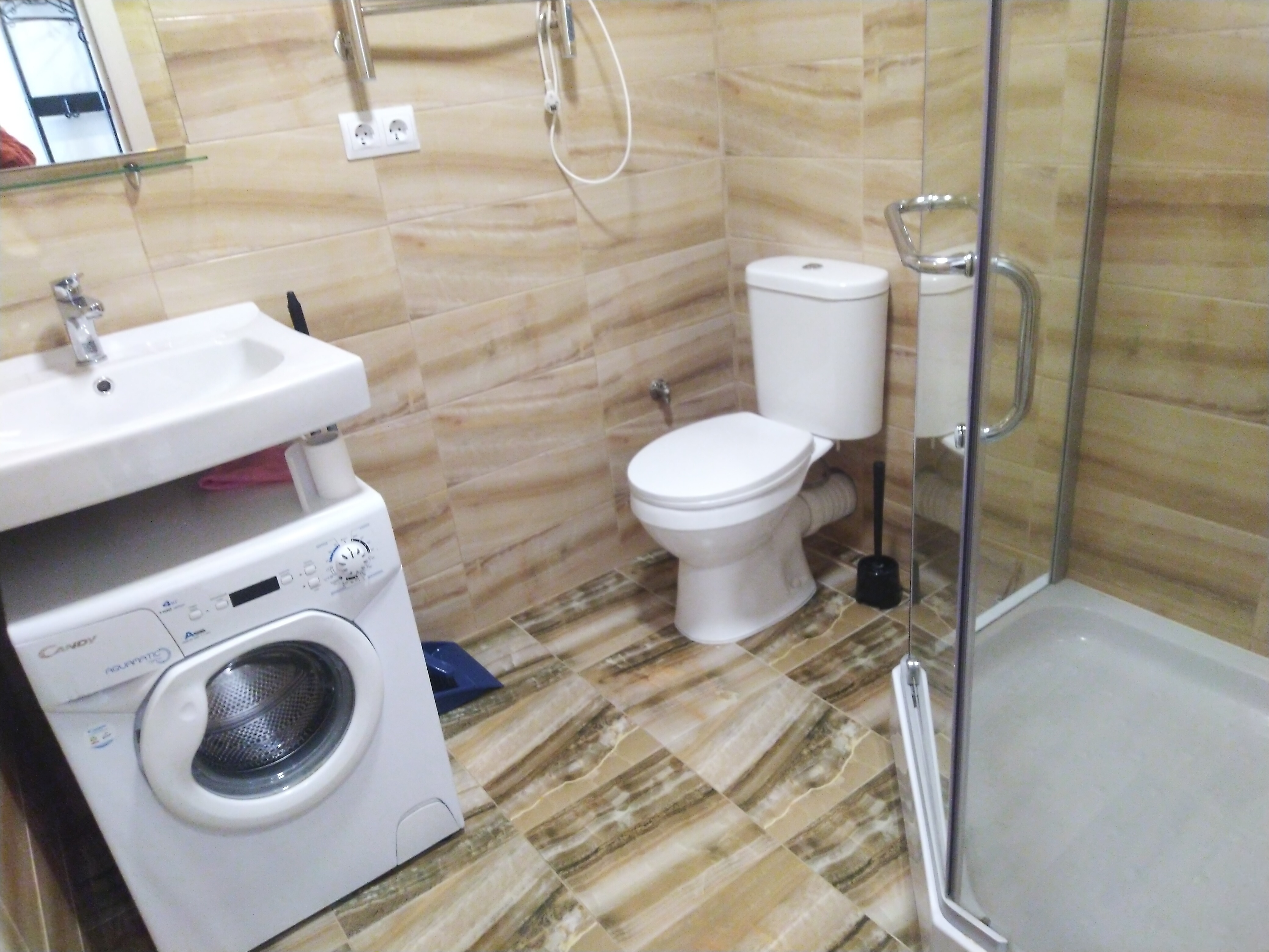 Ванная комната: раковина с зеркалом, унитаз, душ, стиральная машина, полотенцесушитель, сушилка для белья, фен.