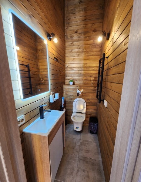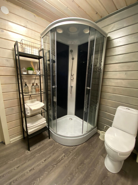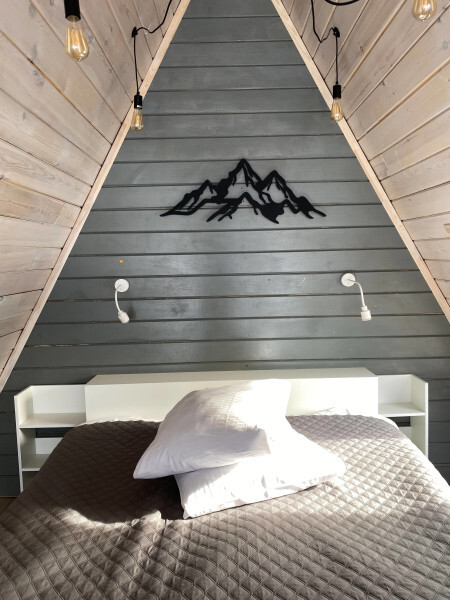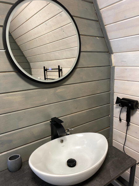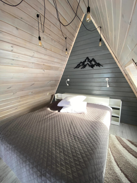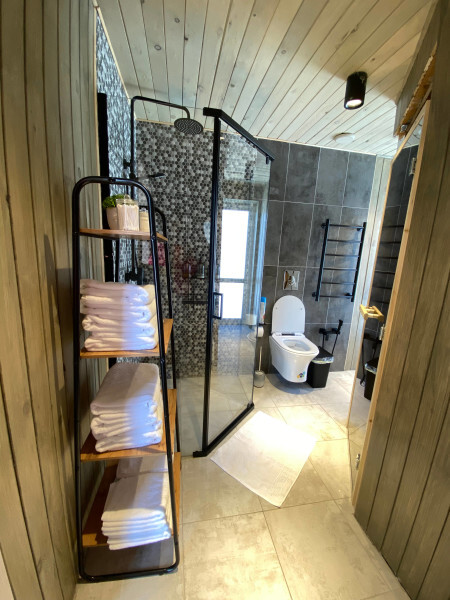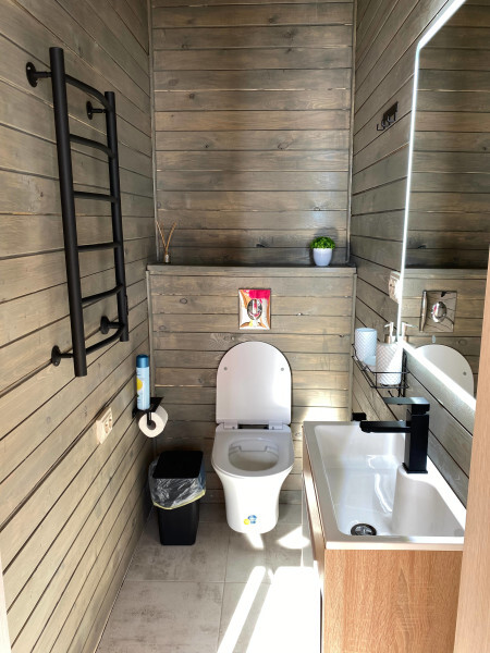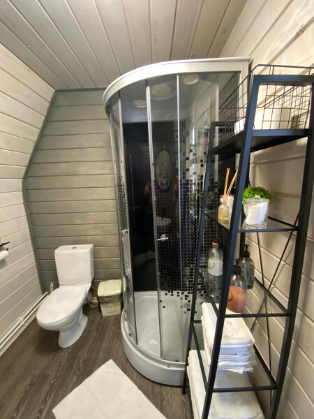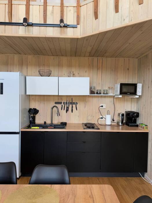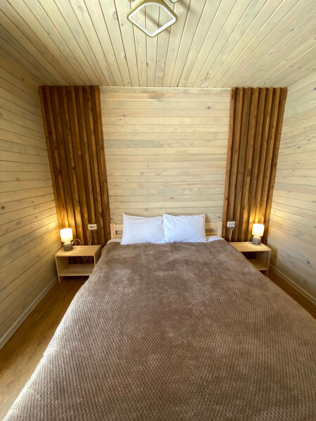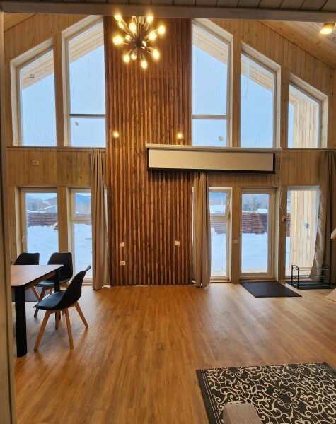 В каждом доме есть: 3 спальни - 2 двуспальные кровати и 2 одноместные + диван для двоих в гостиной; собственный санузел с душем и туалетом на 1 этаже; санузел на втором этаже; полноценная кухня-гостиная; проектор с проекцией до 240см; холодильник, микроволновка; плита и кухонная посуда; кофе машина с зернами; электрический чайник; качественный мангал на улице; фен; посудомойка.