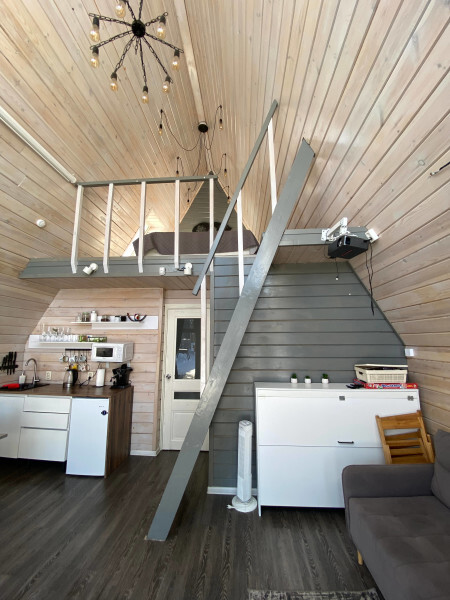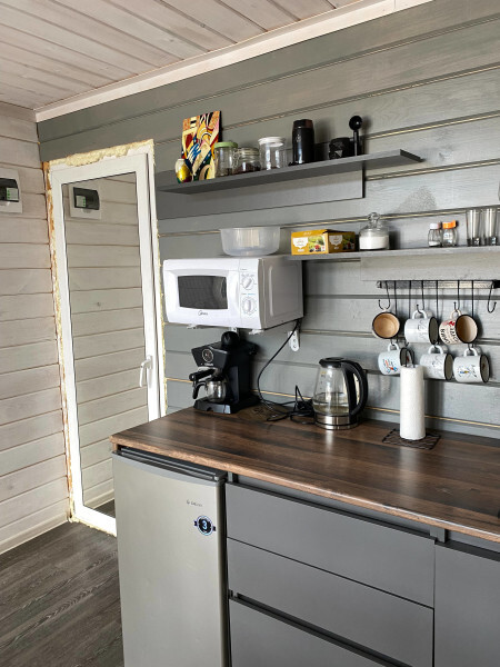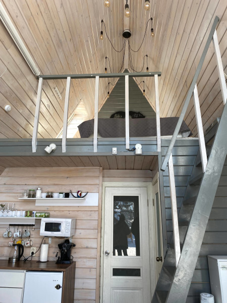 В доме есть: двуспальная кровать на 2 этаже, диван в гостиной, двуспальная кровать с отдельной спальней на 1 этаже, собственный санузел с душем и туалетом, полноценная кухня-гостиная,проектор с проекцией до 240 см, холодильник, микроволновка; плитка и кухонная посуда, кофе машина с зернами; электрический чайник, качественный мангал на улице с беседкой и костровой зоной, фен.