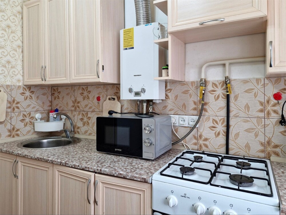 Кухня: газовая плита, столовые приборы, набор посуды, духовка, электрочайник, микроволновая печь, холодильник.