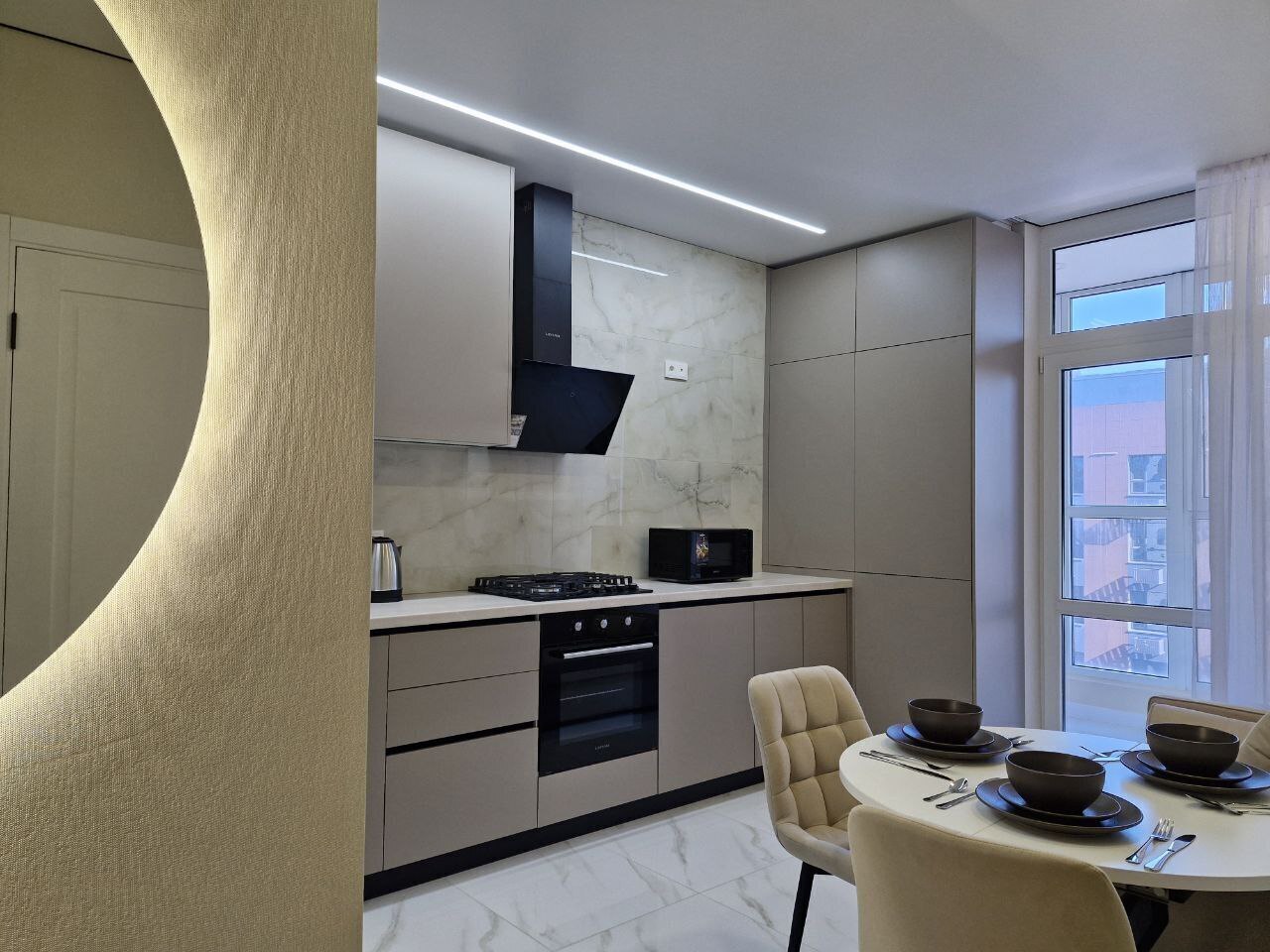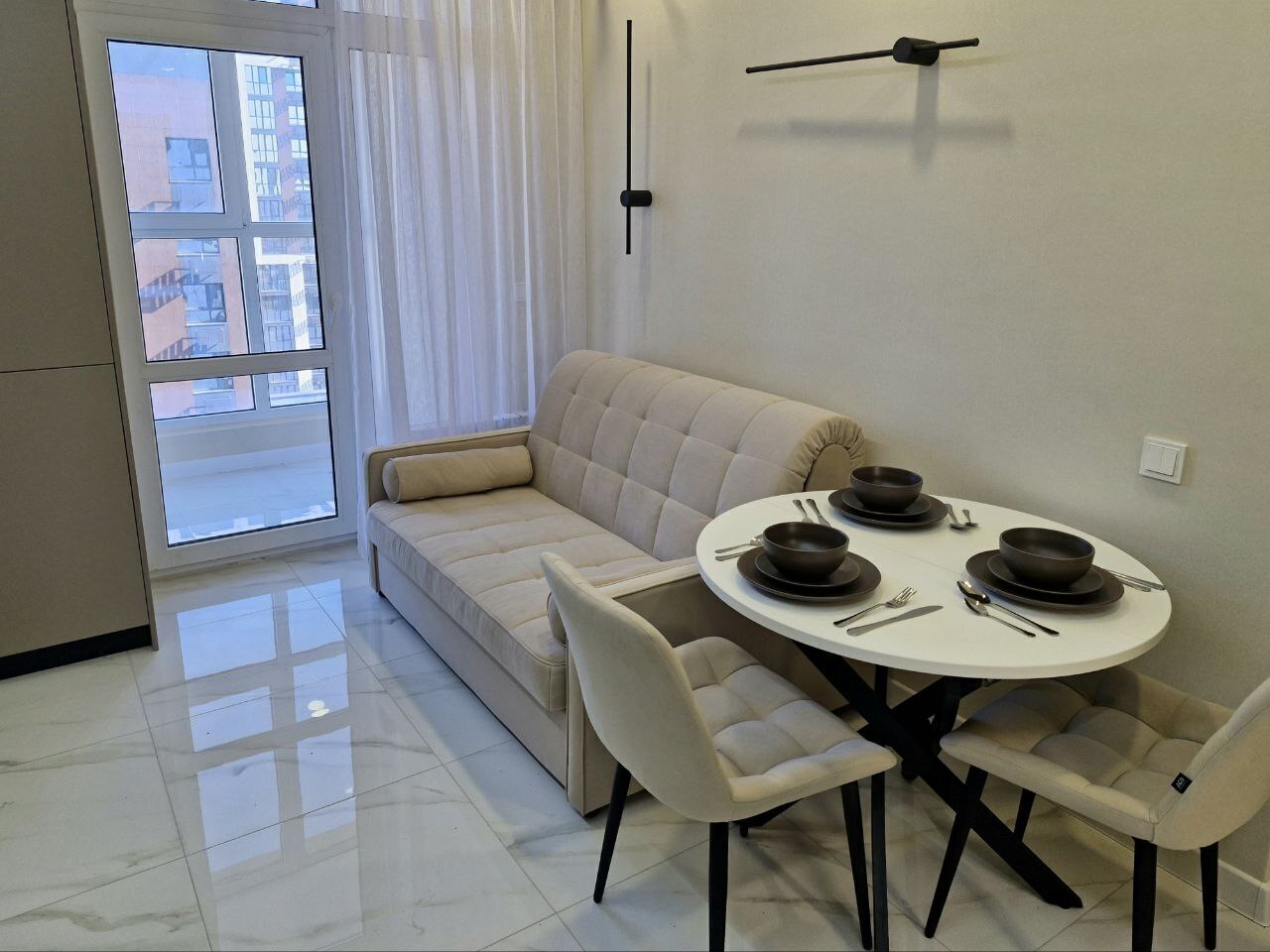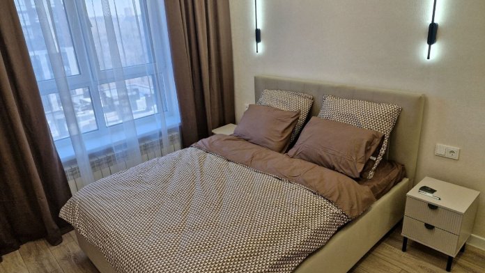 - Большая кровать, раскладывающийся диван, вместительный шкаф, совмещенный санузел с душем, кухня, панорамная лоджия