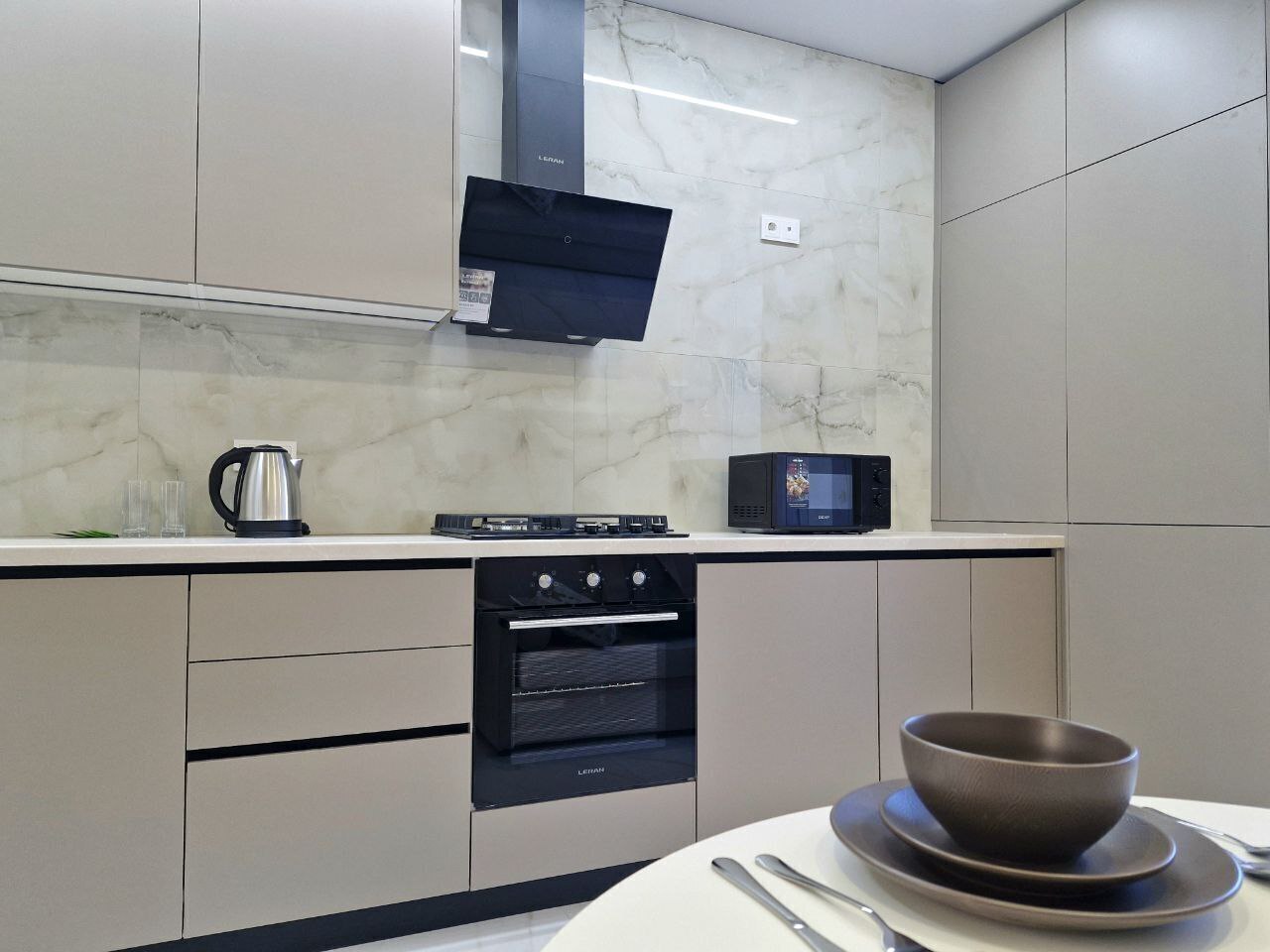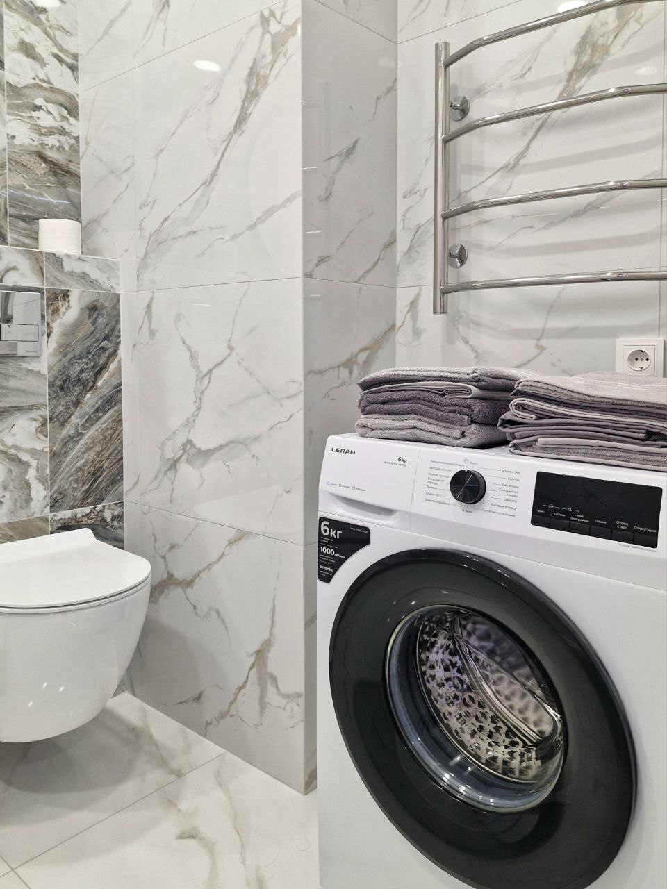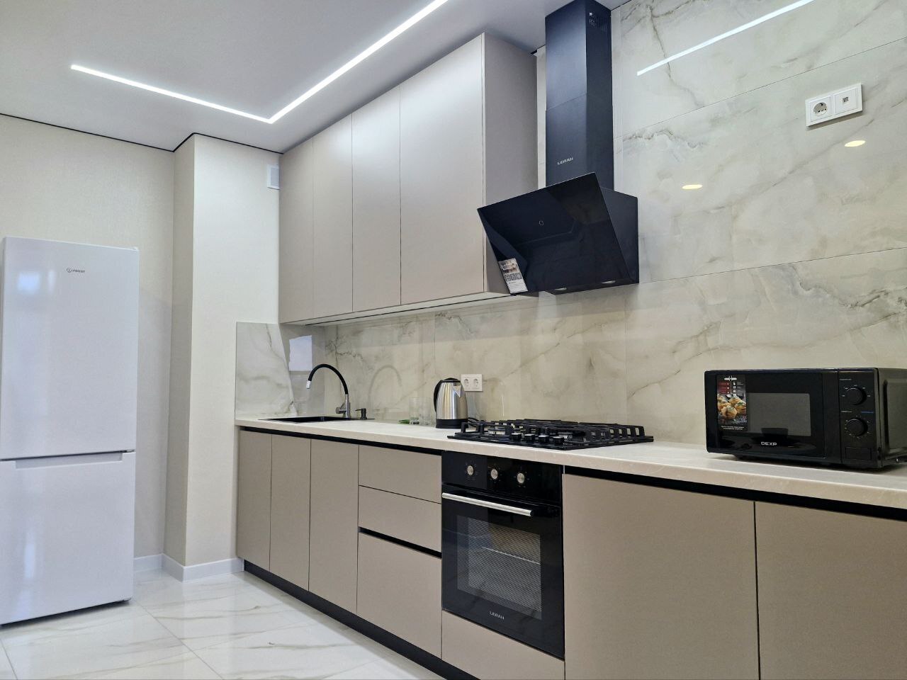 - Стиральная машина, микроволновая печь, утюг, чайник, ТВ + Wi-Fi, холодильник.