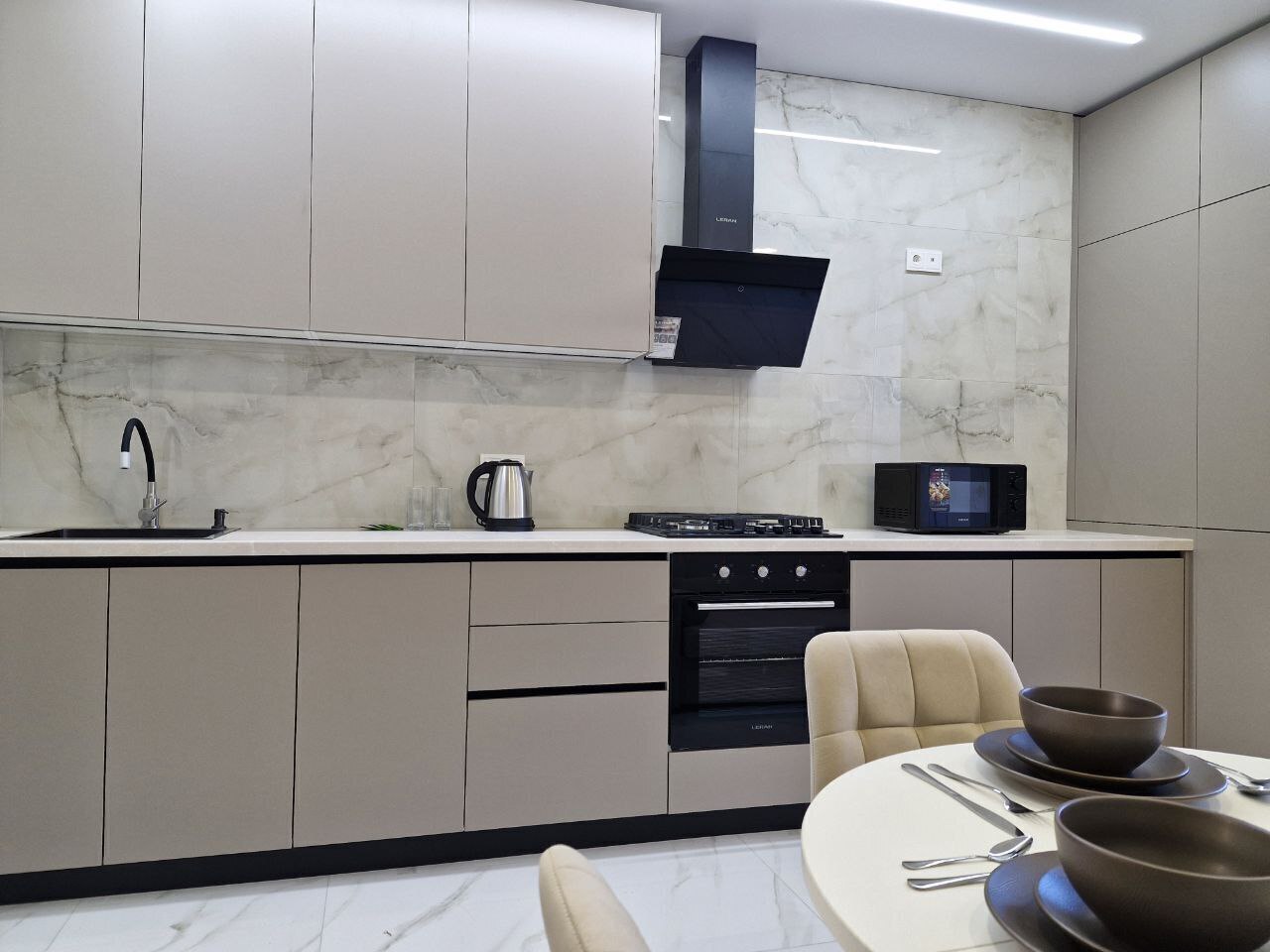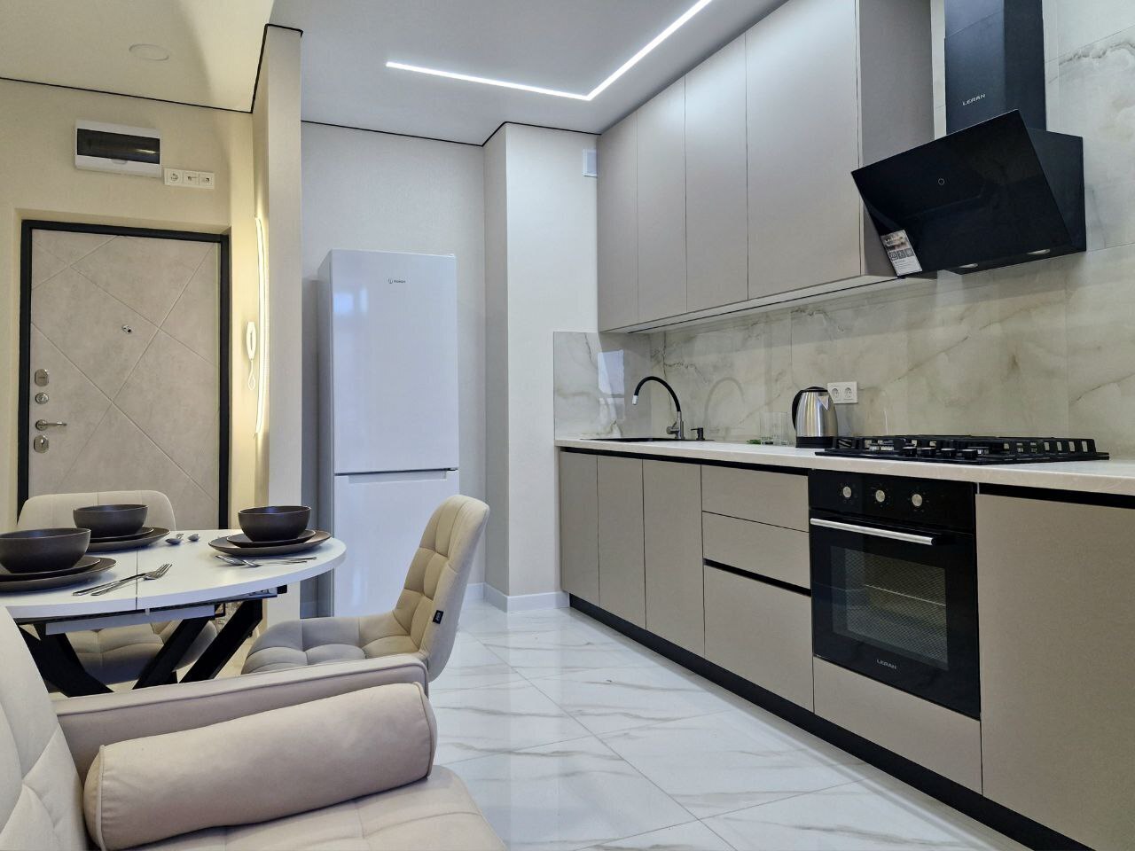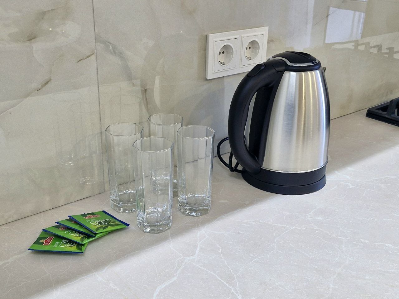 - Стиральная машина, микроволновая печь, утюг, чайник, ТВ + Wi-Fi, холодильник.