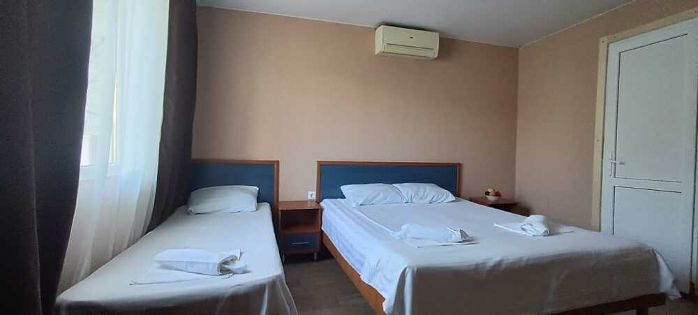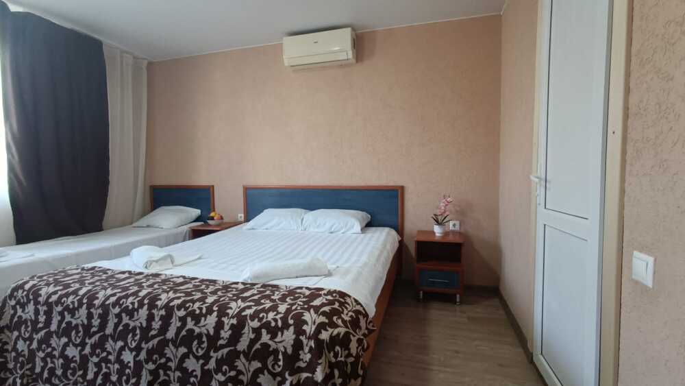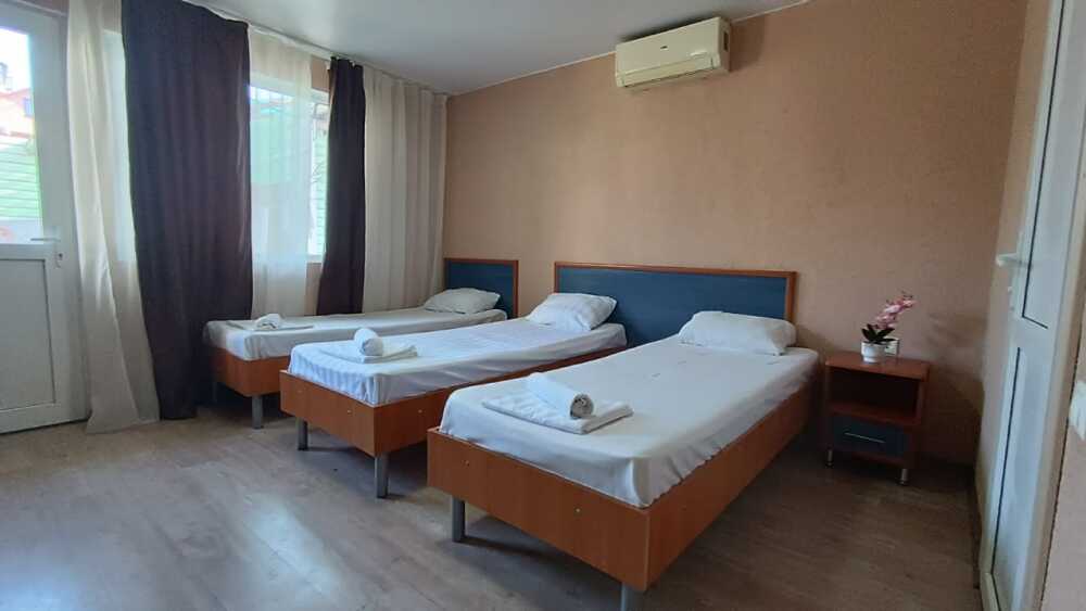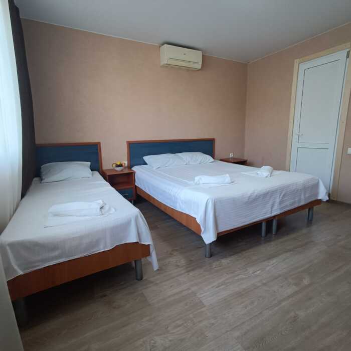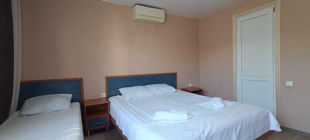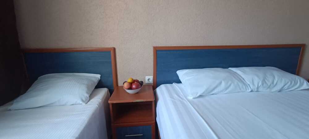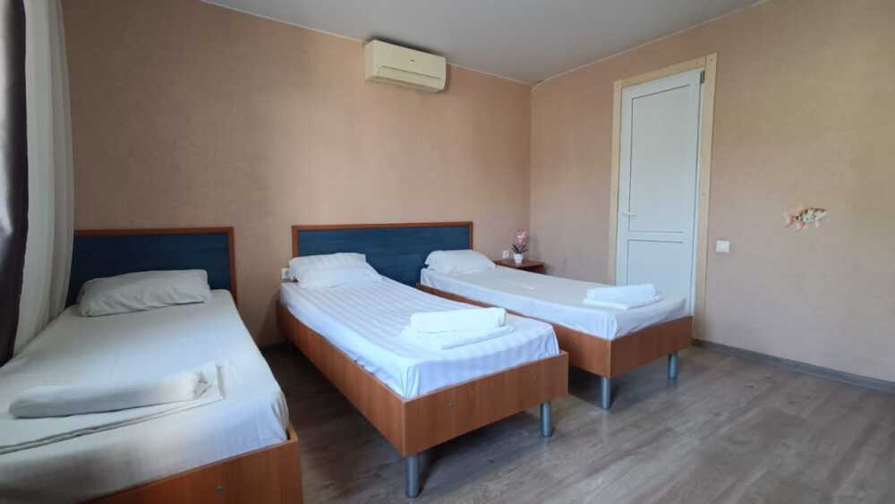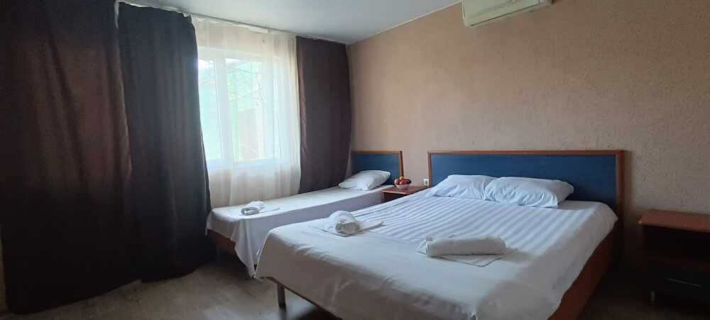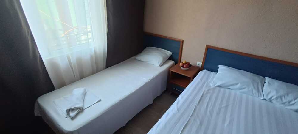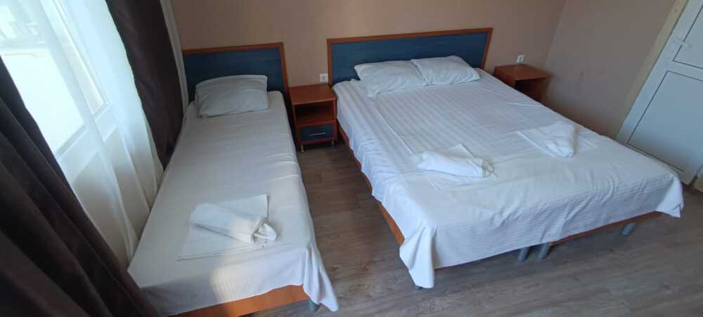 3-местный номер. Состоит из: 1 двуспальная кровать, 1 односпальная кровать, туалет, душ, кондиционер, холодильник (не во всех номерах), телевизор, Wi-Fi.