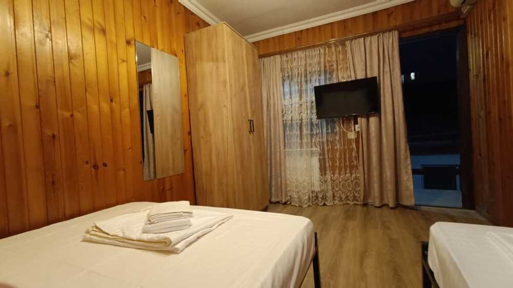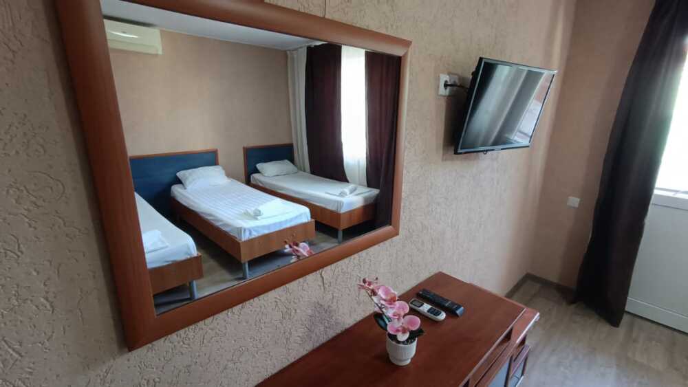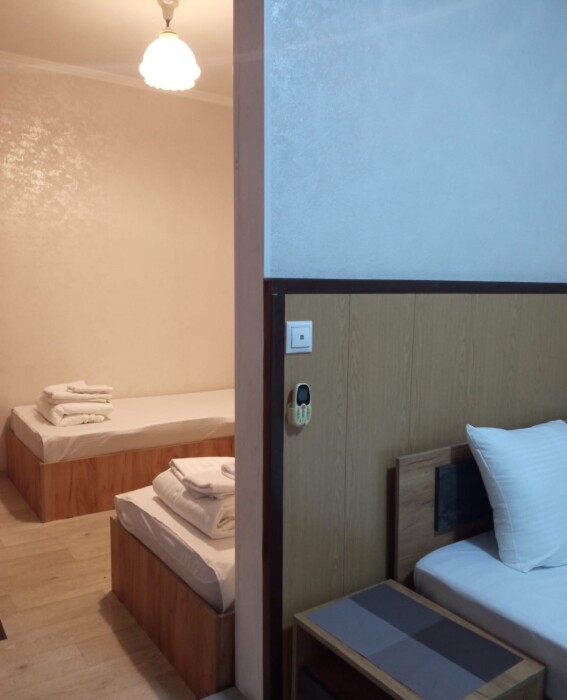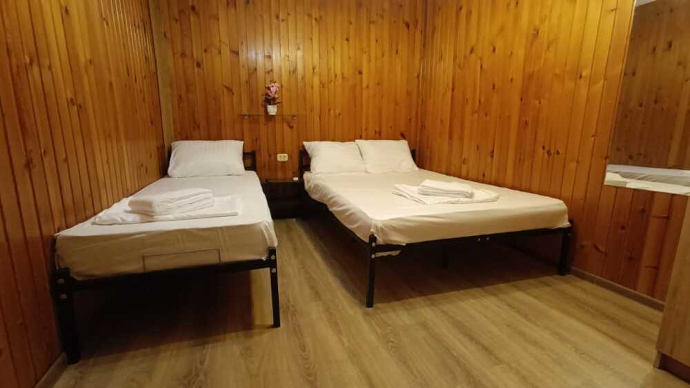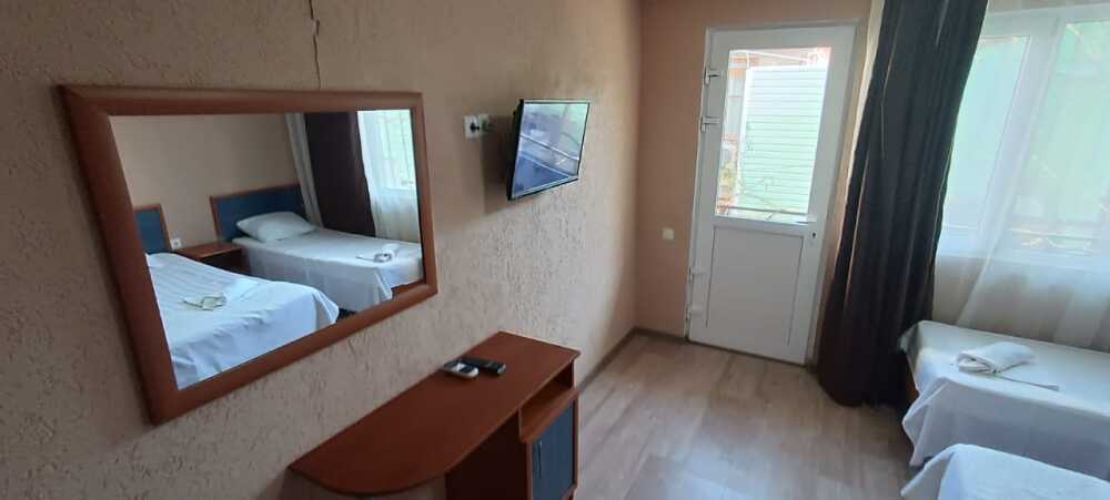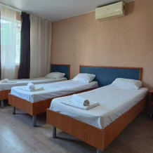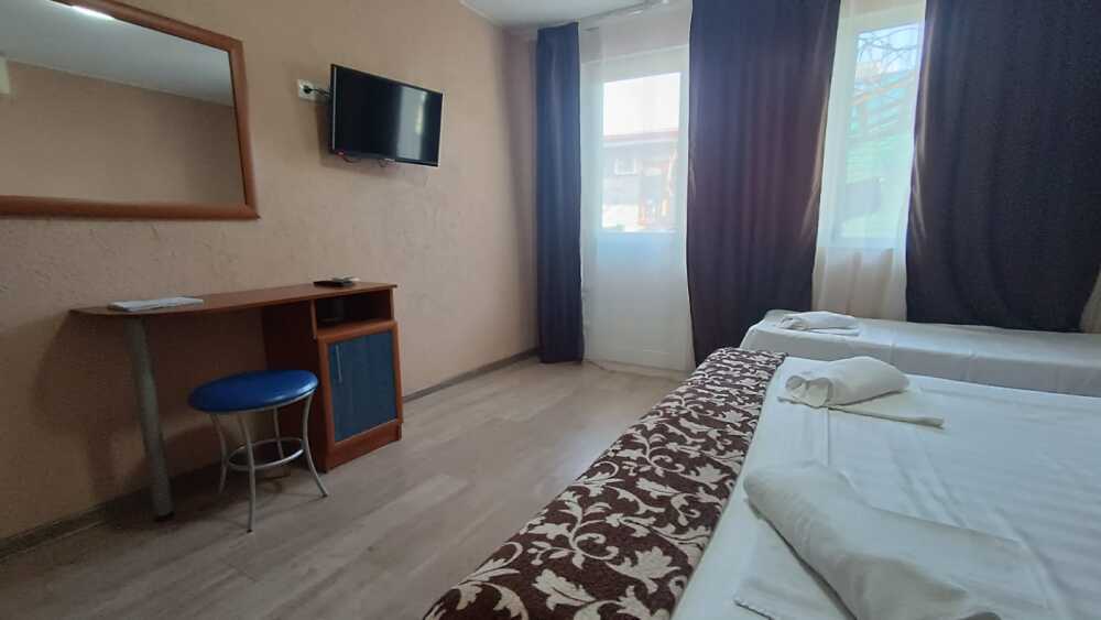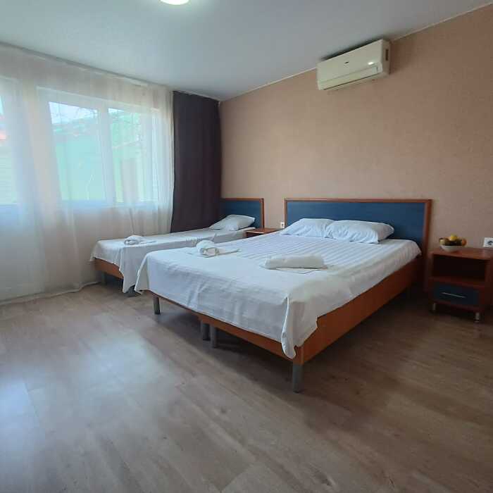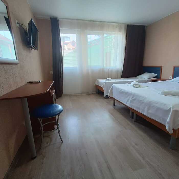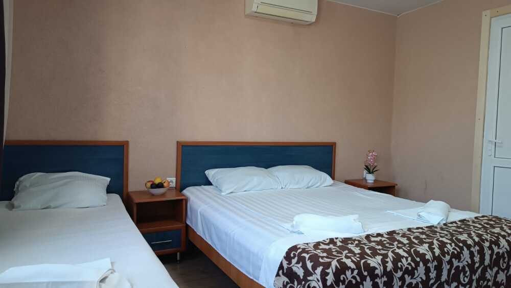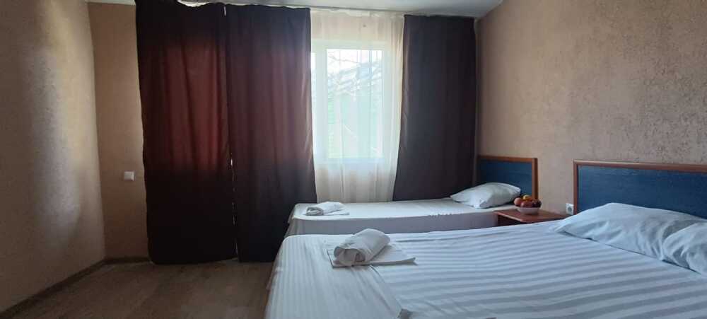 3-местный номер. Состоит из: 1 двуспальная кровать, 1 односпальная кровать, туалет, душ, кондиционер, холодильник (не во всех номерах), телевизор, Wi-Fi.