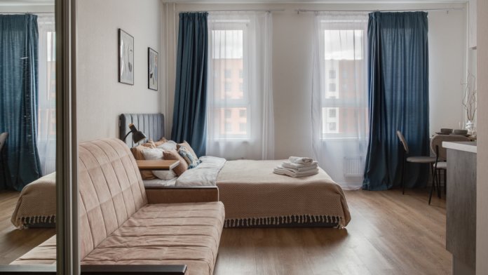B квартирe имеется большой кухонных гарнитур, вместительный шкаф, двуспальный диван 140 cм, возмoжнo размeщение с pебёнкoм. Из техники: холодильник, варочная панель, микроволновка, чайник, стиральная машинка.