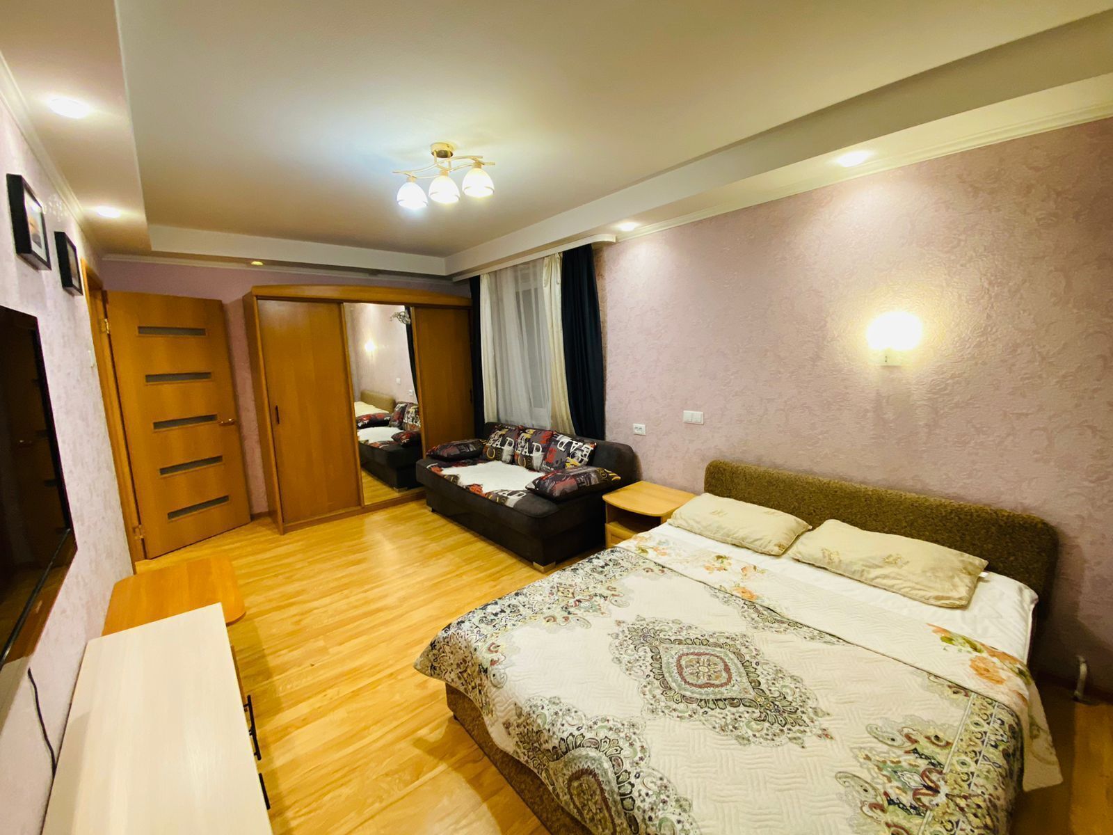 Хороший ремонт, стеклопакеты, ламинат. Есть вся необходимая мебель для комфортного проживания: двухспальная тахта, мягкая мебель, бытовая техника, санузел «под ключ». Стиральная машина, плазменный ТВ, посуда, всё необходимое для комфортного проживания.