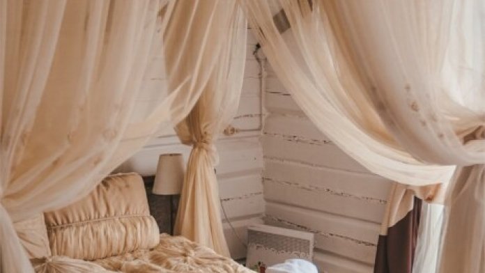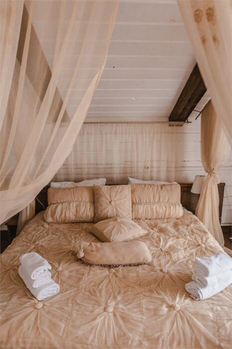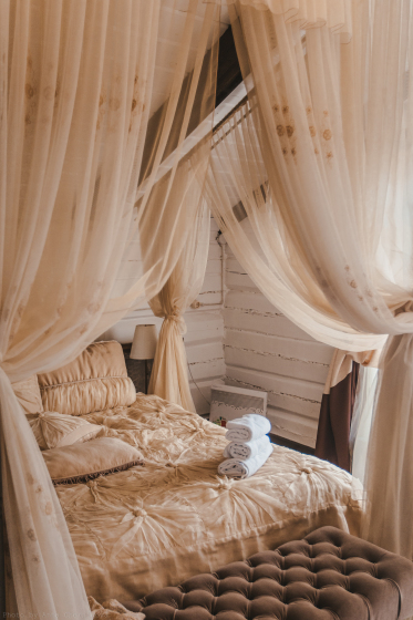 Уникальный номер для пар и молодожёнов, имеющий большую двуспальную кровать с балдахином нежных пастельных цветов, широкую ванну и всё необходимое для комфортного проживания, включая махровые халаты.