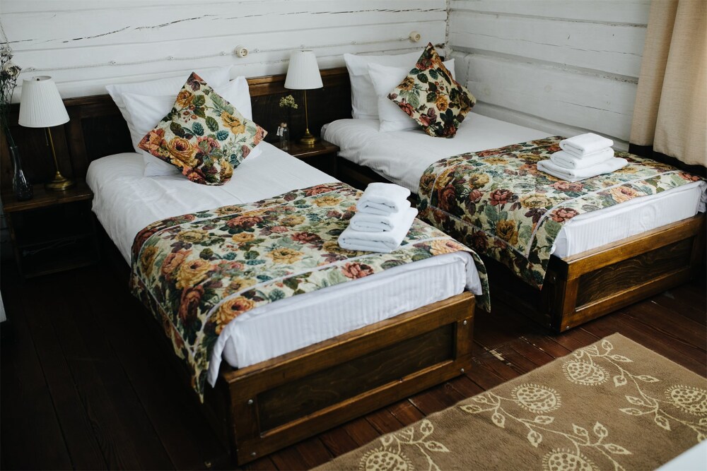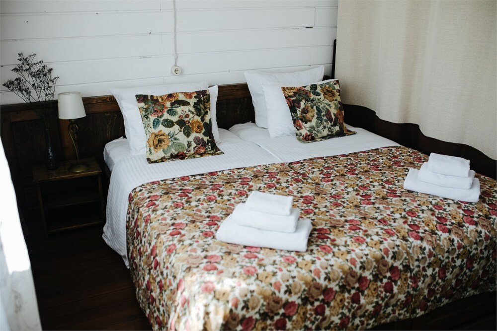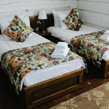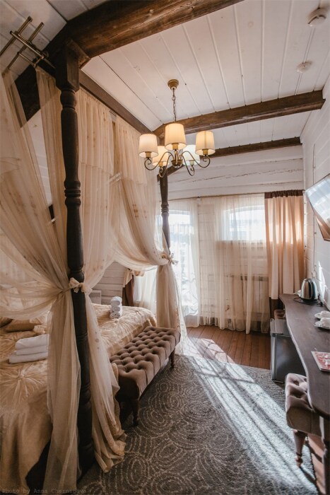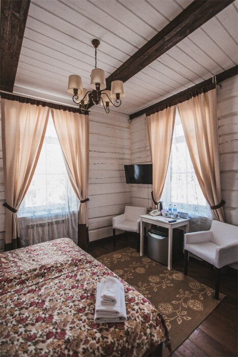 Отель разработан в русском стиле в трехэтажном бревенчатом здании с деревянными полами и стенами.