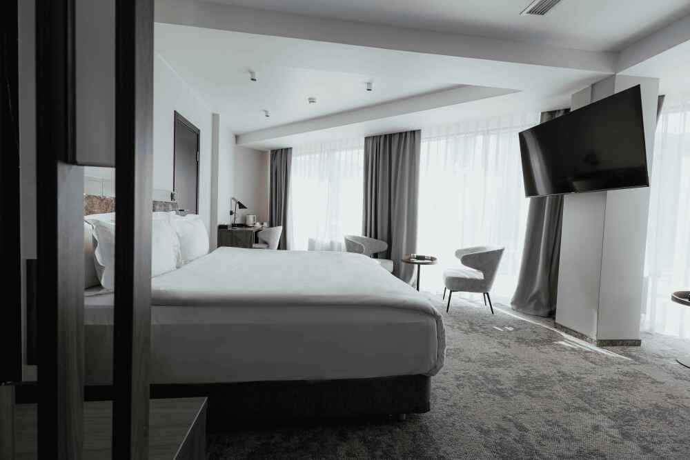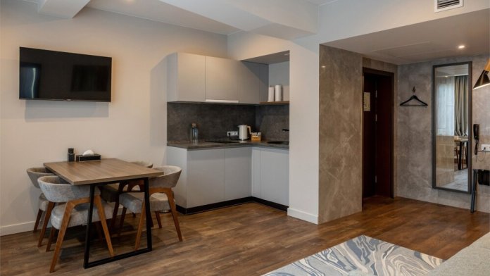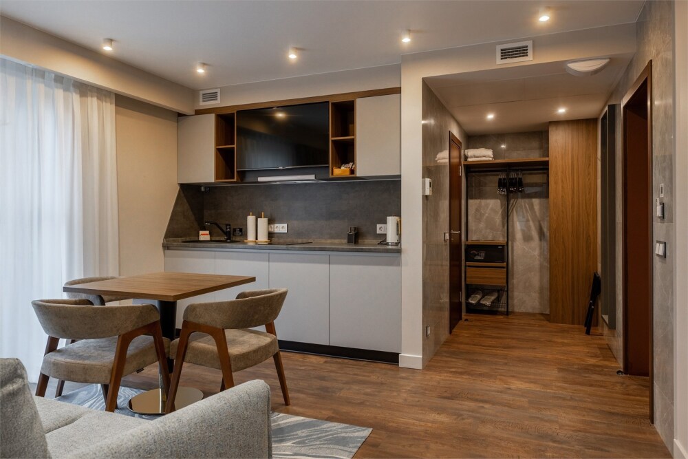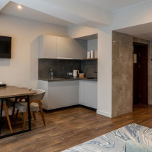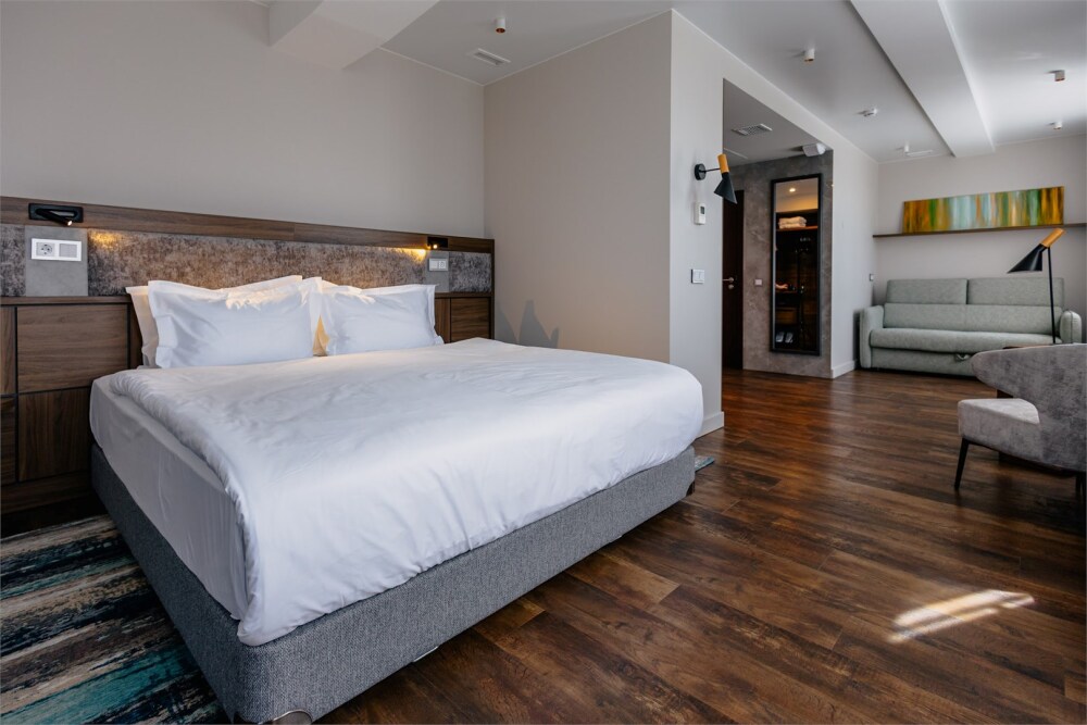 Апартаменты разделены на две комнаты: стильная кухня-гостиная с раскладным диваном и обеденной зоной, спальня-кабинет с кроватью King Size с ортопедическим матрасом 180*200см и рабочей зоной. Функциональное зонирование пространства позволяет решать различные задачи гостей в рамках одного номера: можно расслабиться, отдохнуть после активного дня или заняться решением деловых вопросов. Невесомые одеяла, мягкие подушки, белоснежные простыни на высоких матрасах, блэкаут шторы