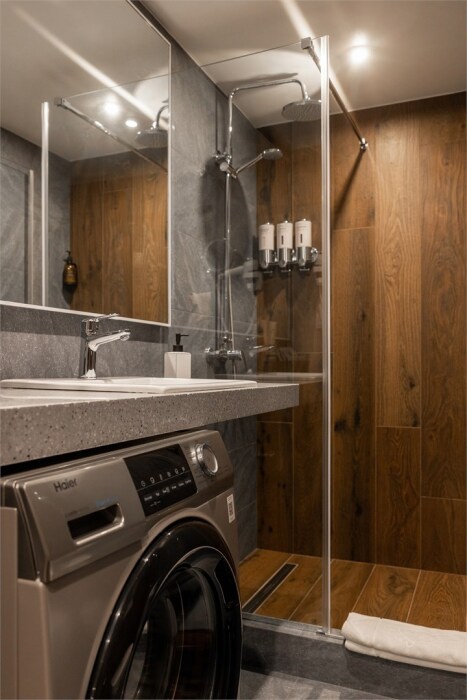 Две комнаты позволяют комфортно разместить семью из четырех человек, готовить завтраки и ужины на собственной кухне, и конечно, собираться всей компанией на террасе. Спальня с кроватью King Size и ортопедическим матрасом, стильная гостиная с раскладным диваном и обеденной зоной, и, что немаловажно, мини-прачечная со стиральной машинкой, местом для сушки и глажения белья